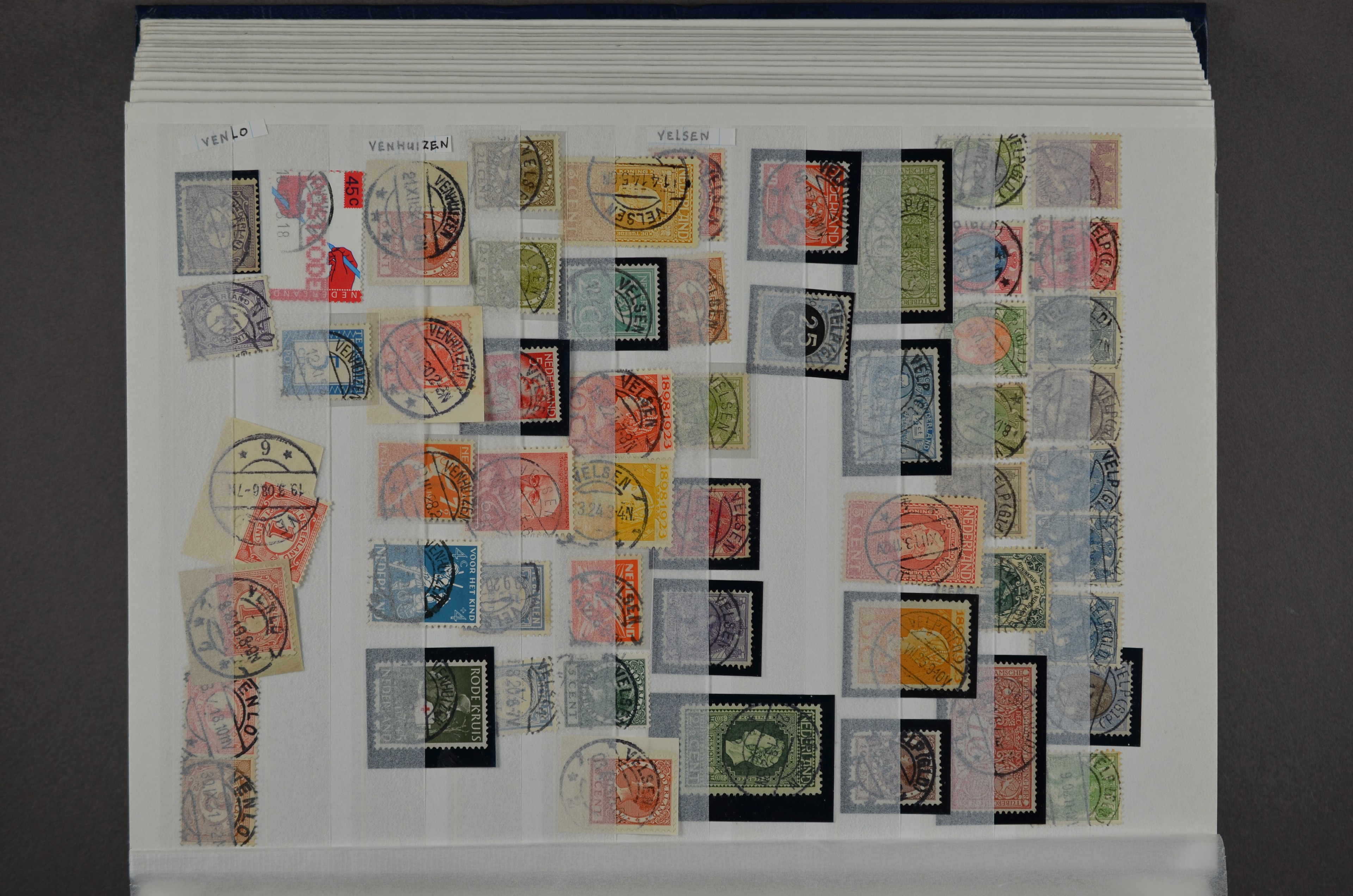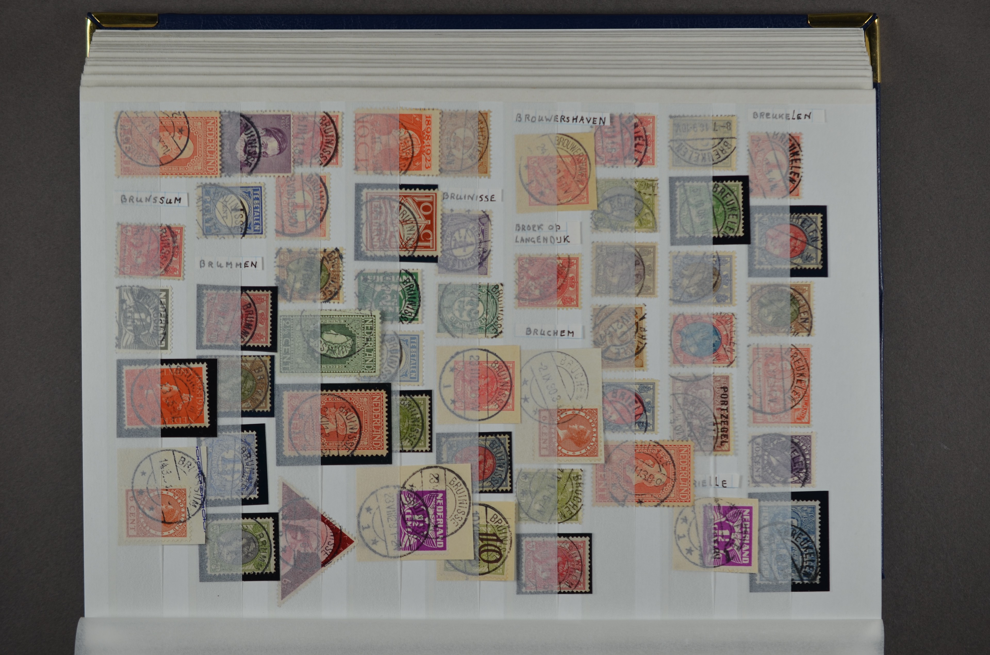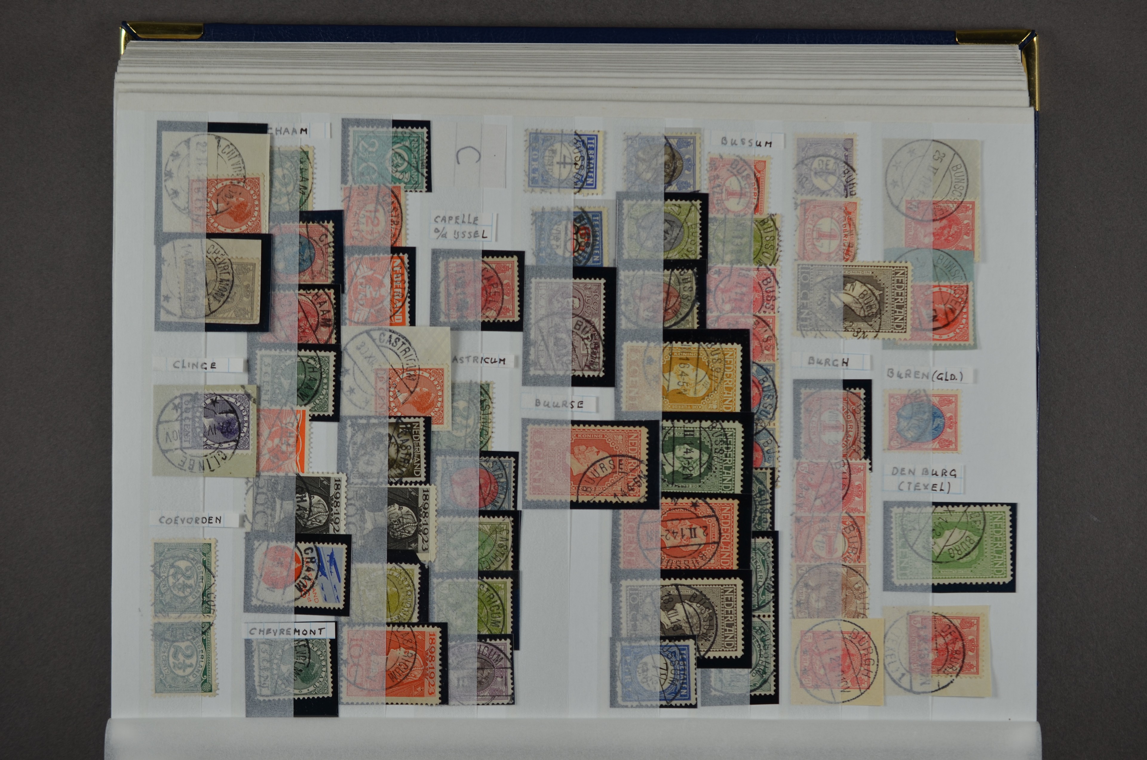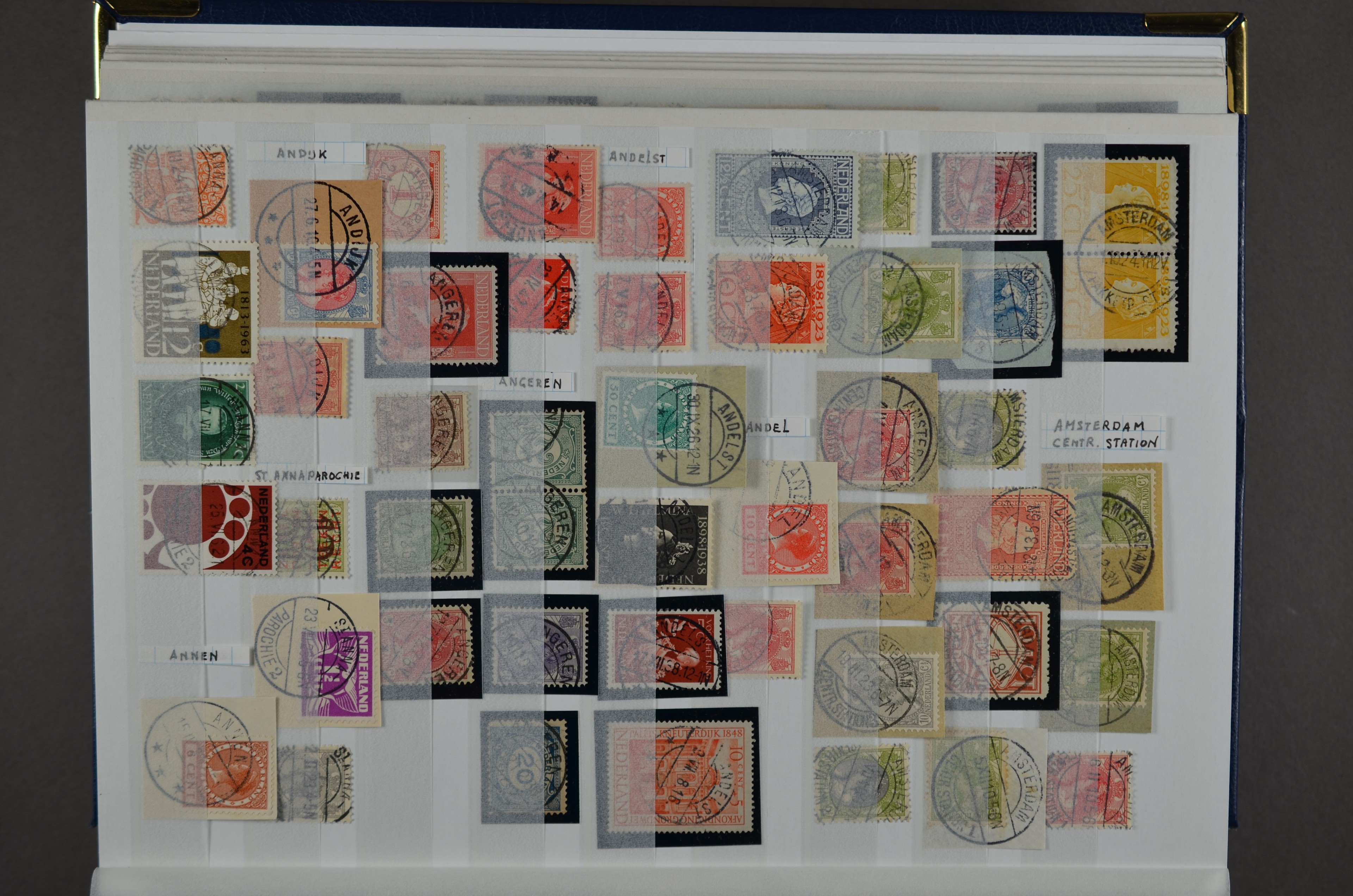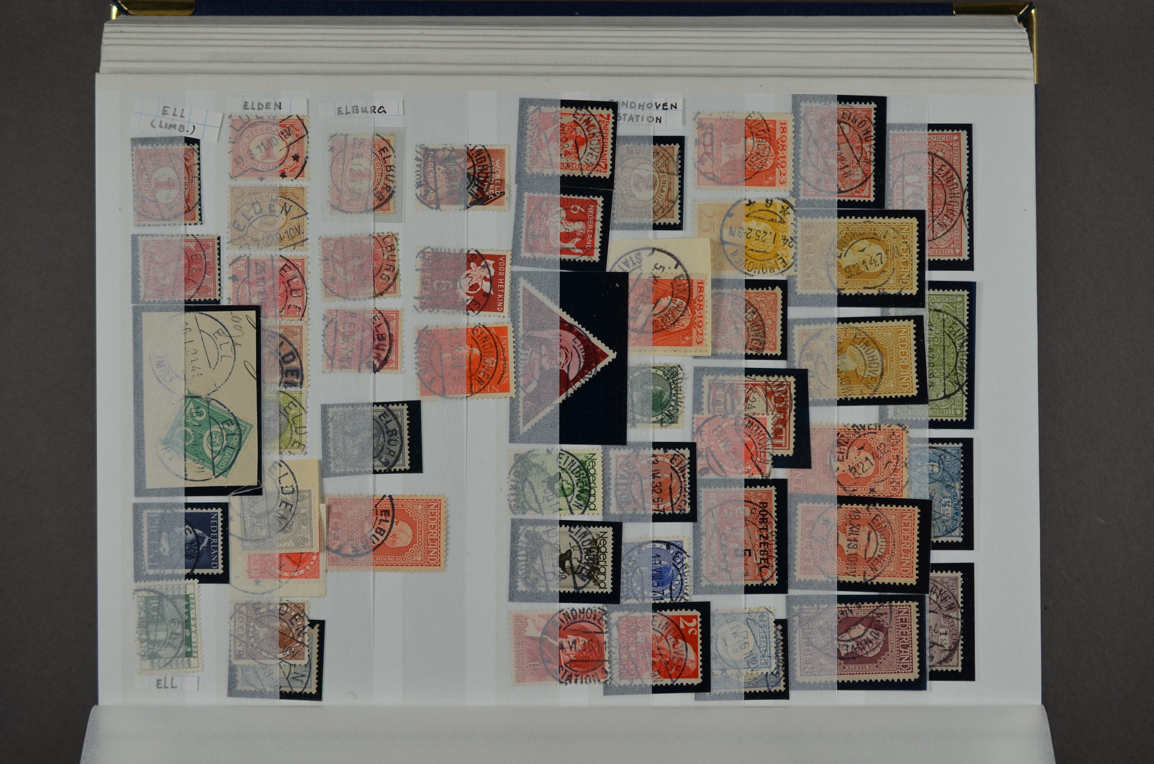 LANGEBALKSTEMPELS, uit Velling type 134/155 op vele, vele honderden losse zegels, merendeels volledige afstempelingen. Het lijken zogenaamd gewone, (semi-)moderne stempels maar in een dergelijke omvang, met zo veel kleine kantoren en in zulke uitzonderlijke kwaliteit nauwelijks meer bijeen te brengen. Voor de liefhebber, op alfabetische volgorde gesorteerd in 3 dikke insteekboeken vol verzamelplezier!