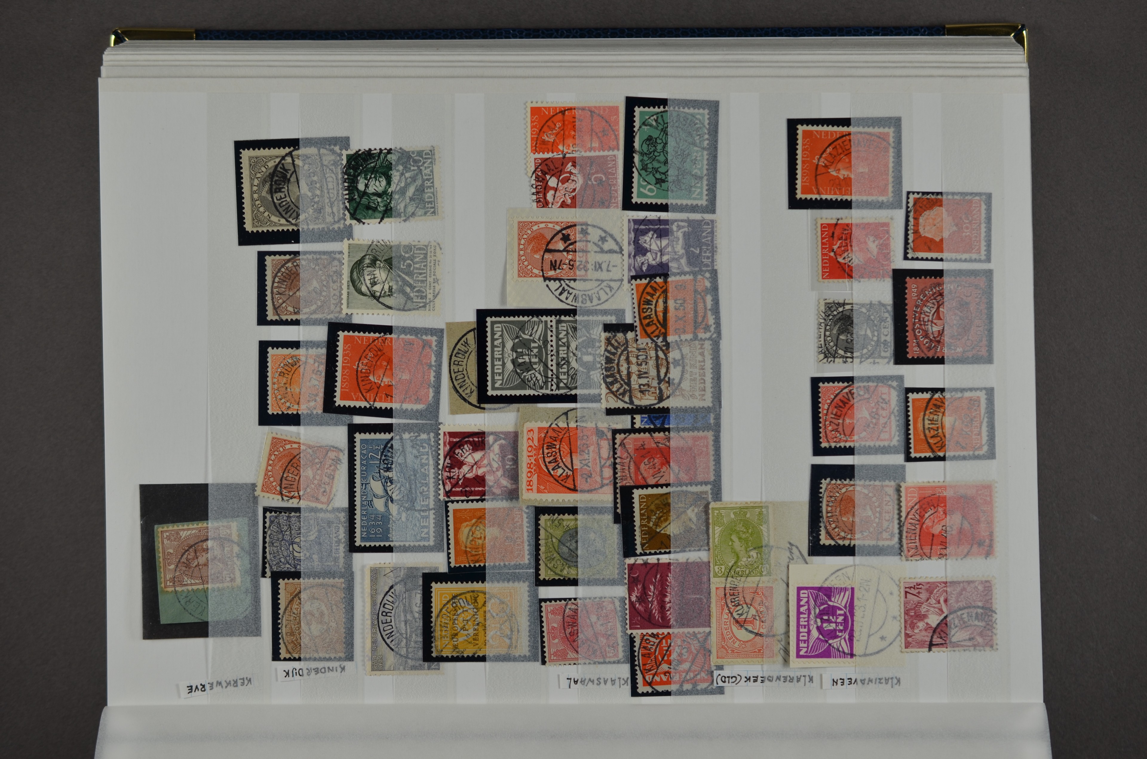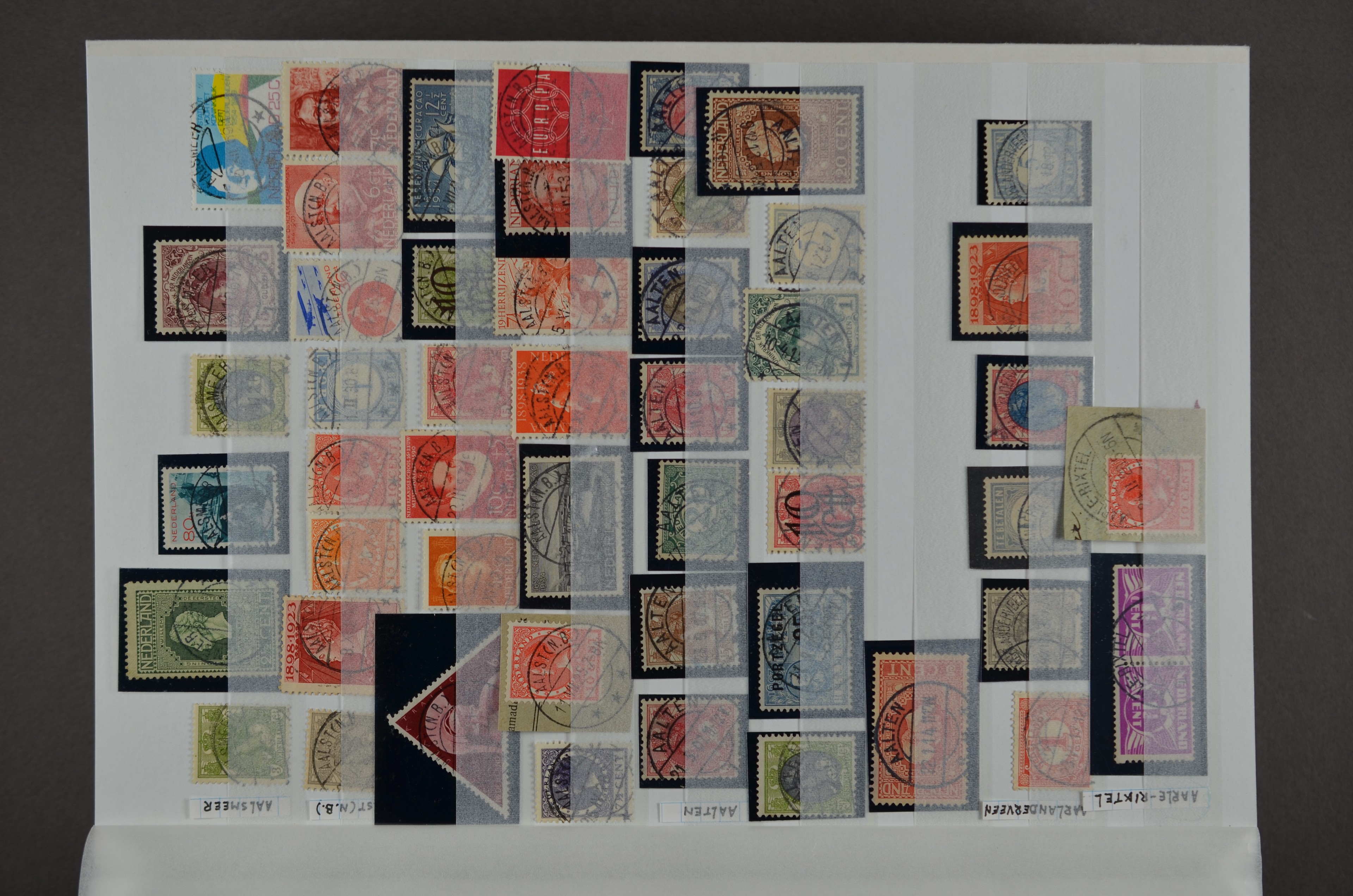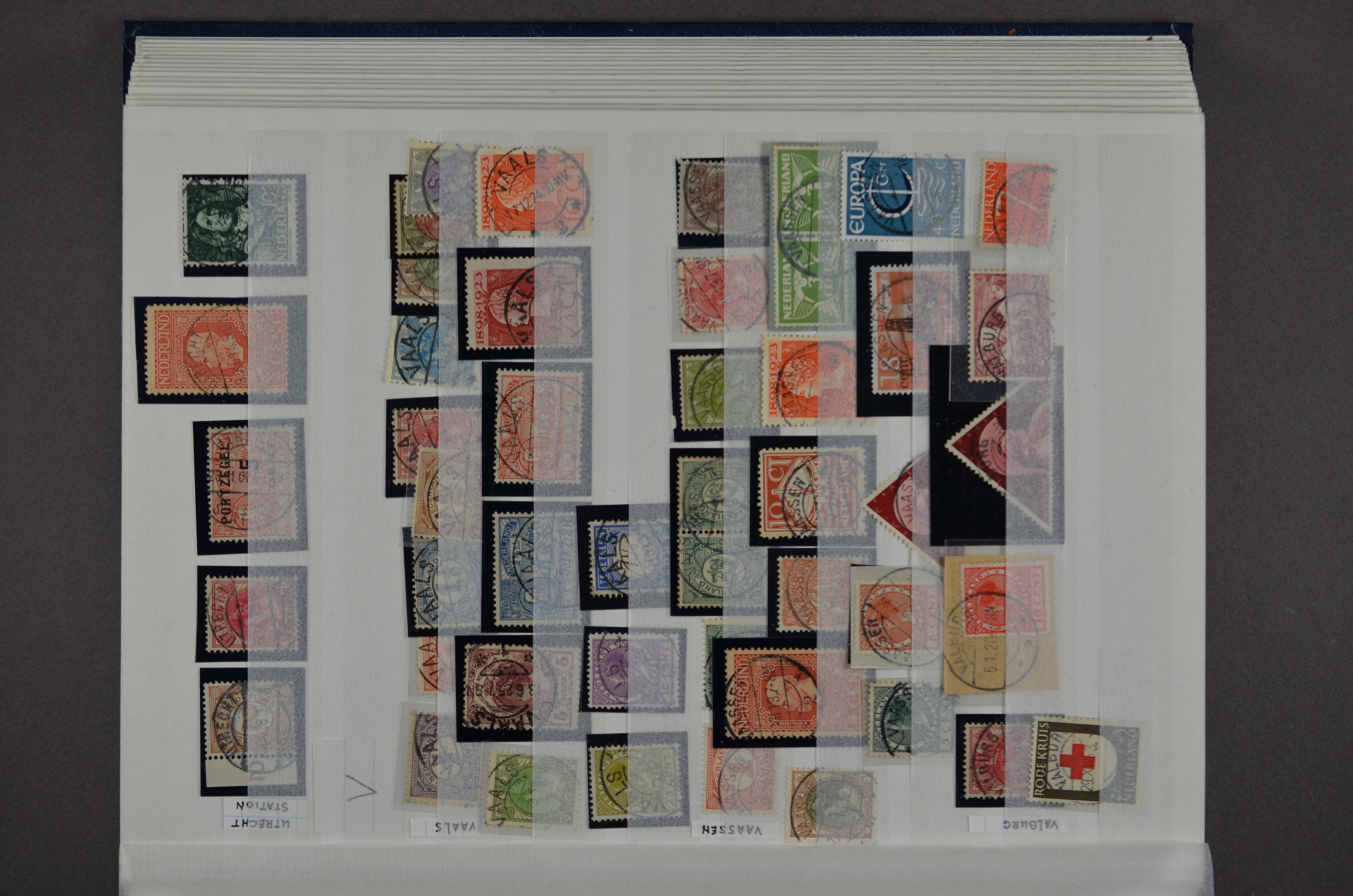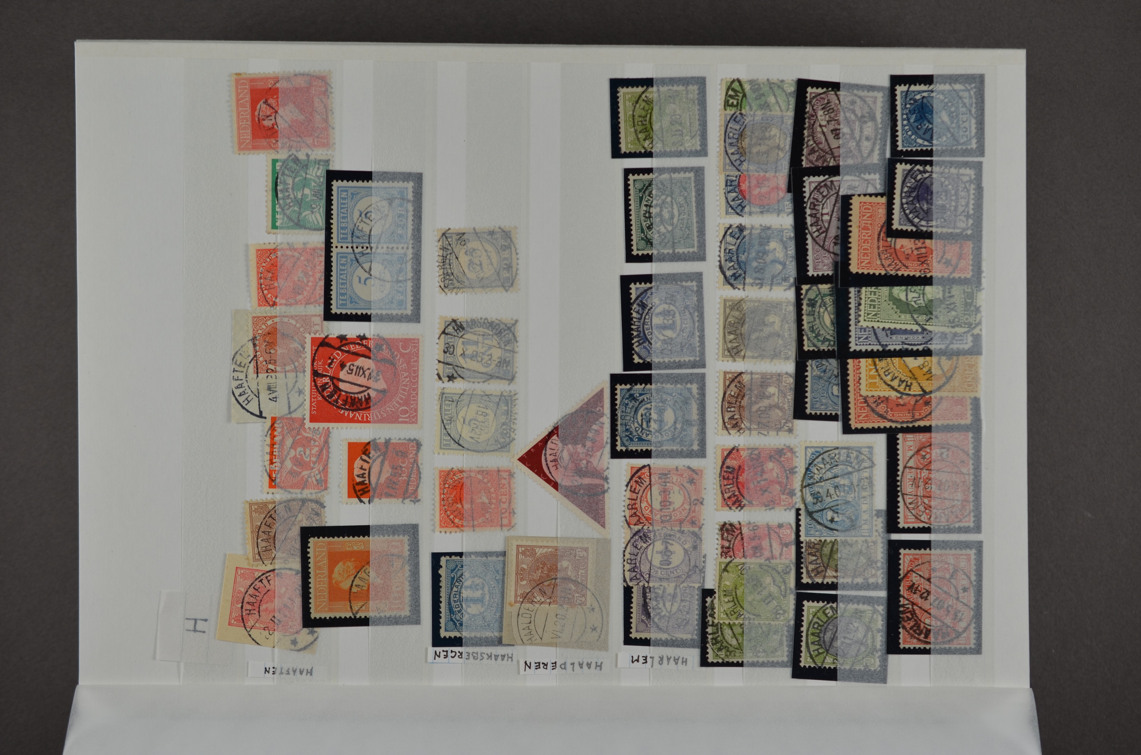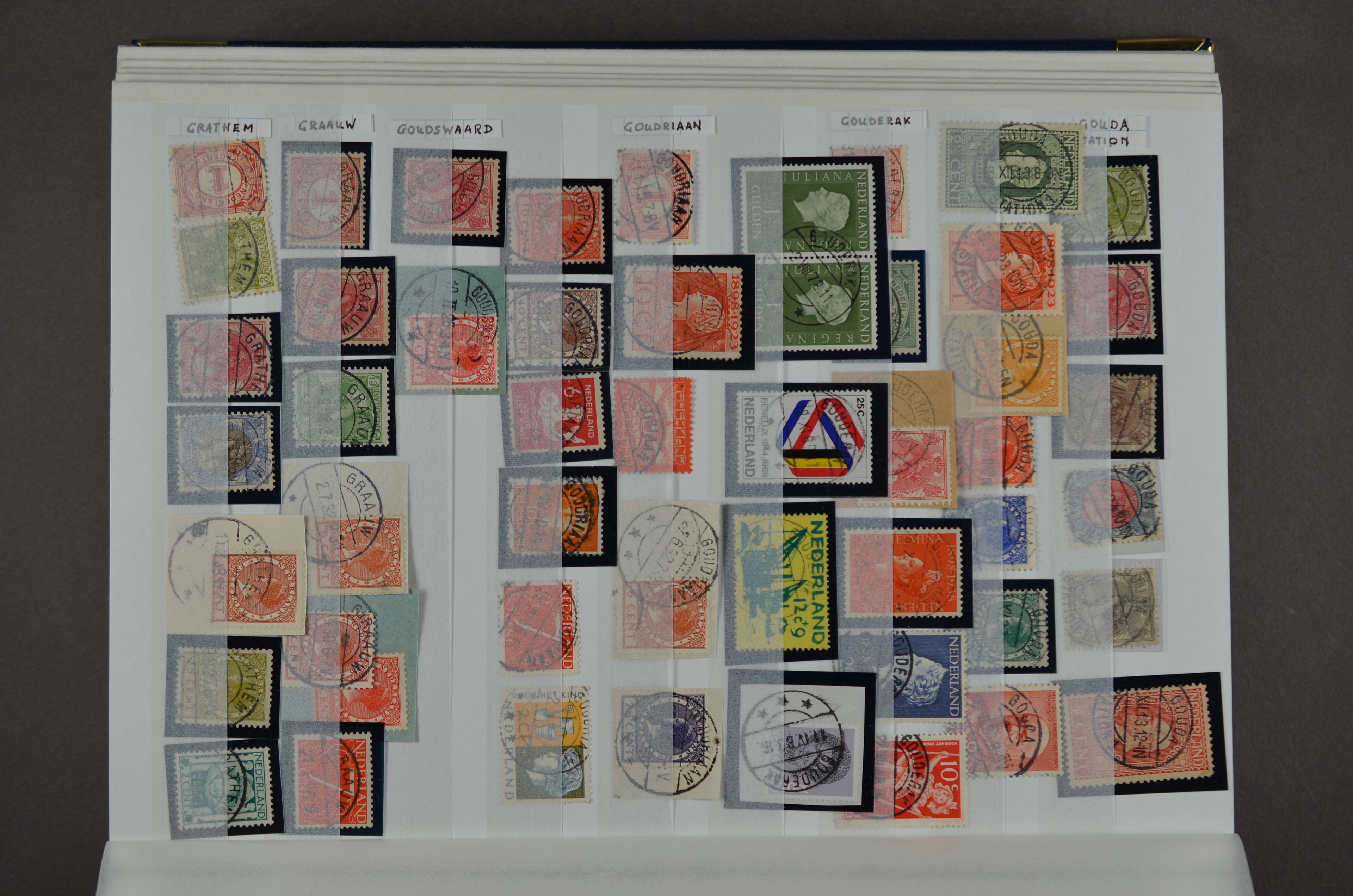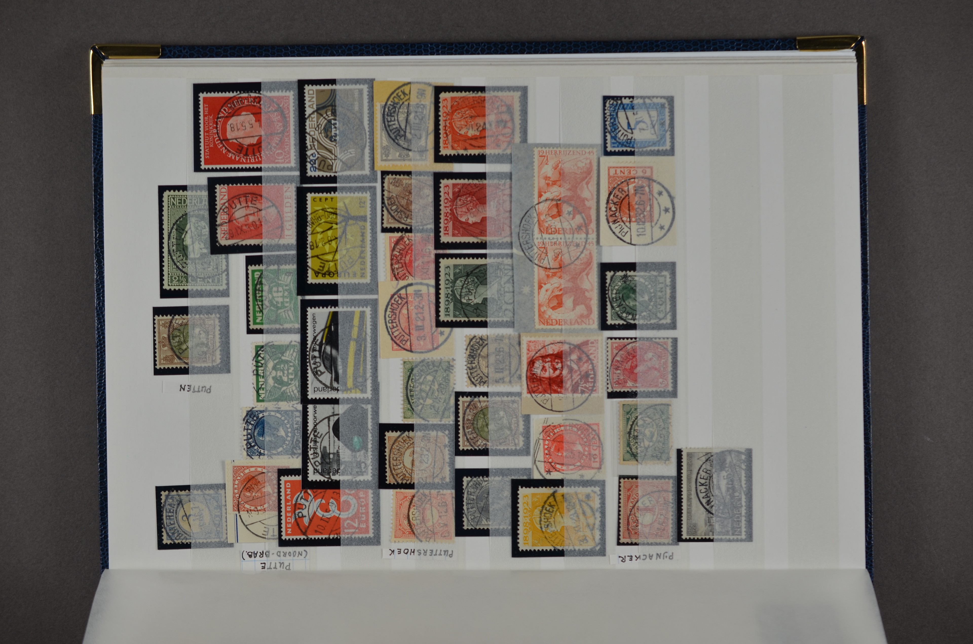 LANGEBALKSTEMPELS, uit Velling type 134/155 op vele, vele honderden losse zegels, merendeels volledige afstempelingen. Het lijken zogenaamd gewone, (semi-)moderne stempels maar in een dergelijke omvang, met zo veel kleine kantoren en in zulke uitzonderlijke kwaliteit nauwelijks meer bijeen te brengen. Voor de liefhebber, op alfabetische volgorde gesorteerd in 3 dikke insteekboeken vol verzamelplezier!