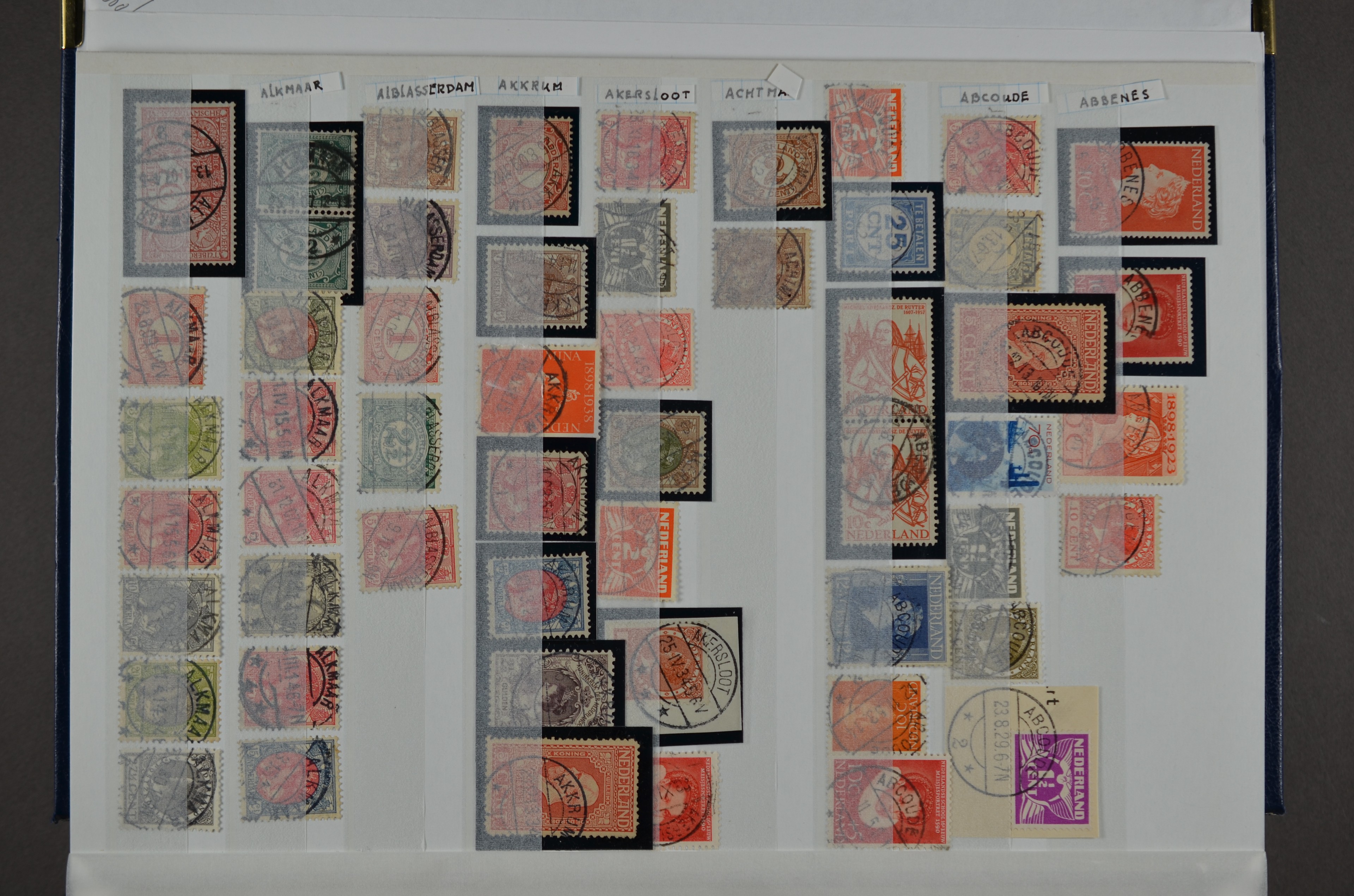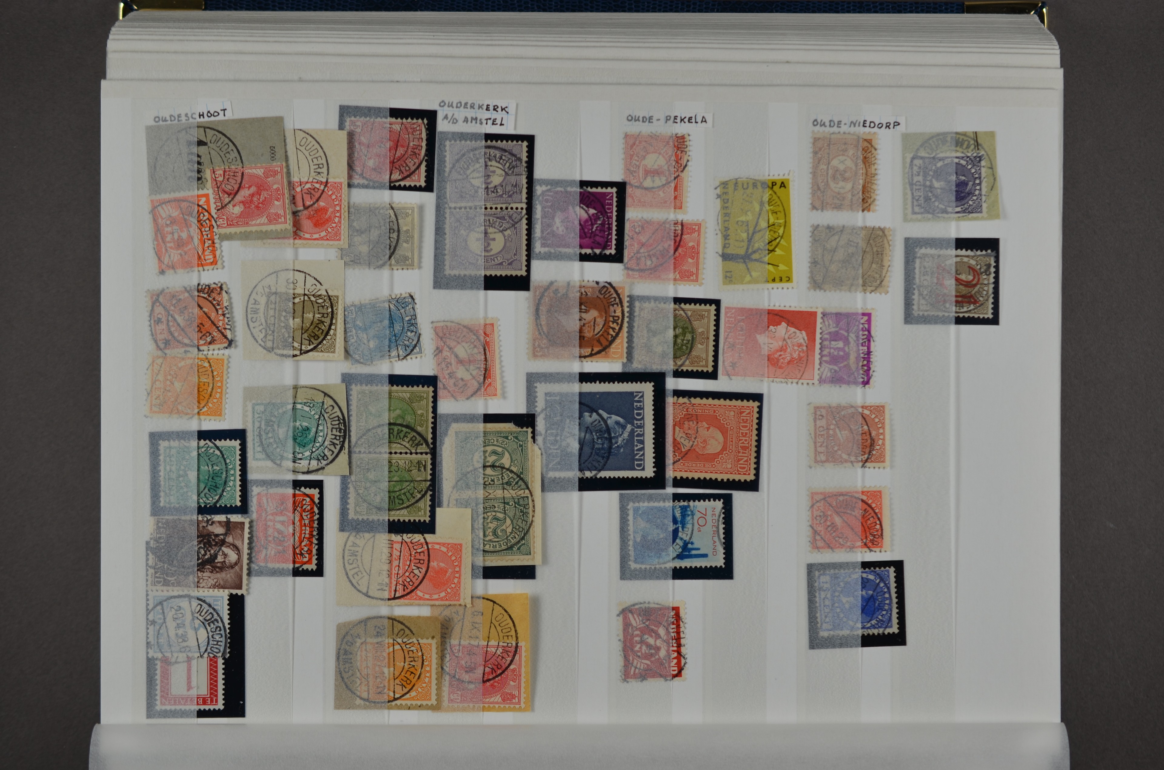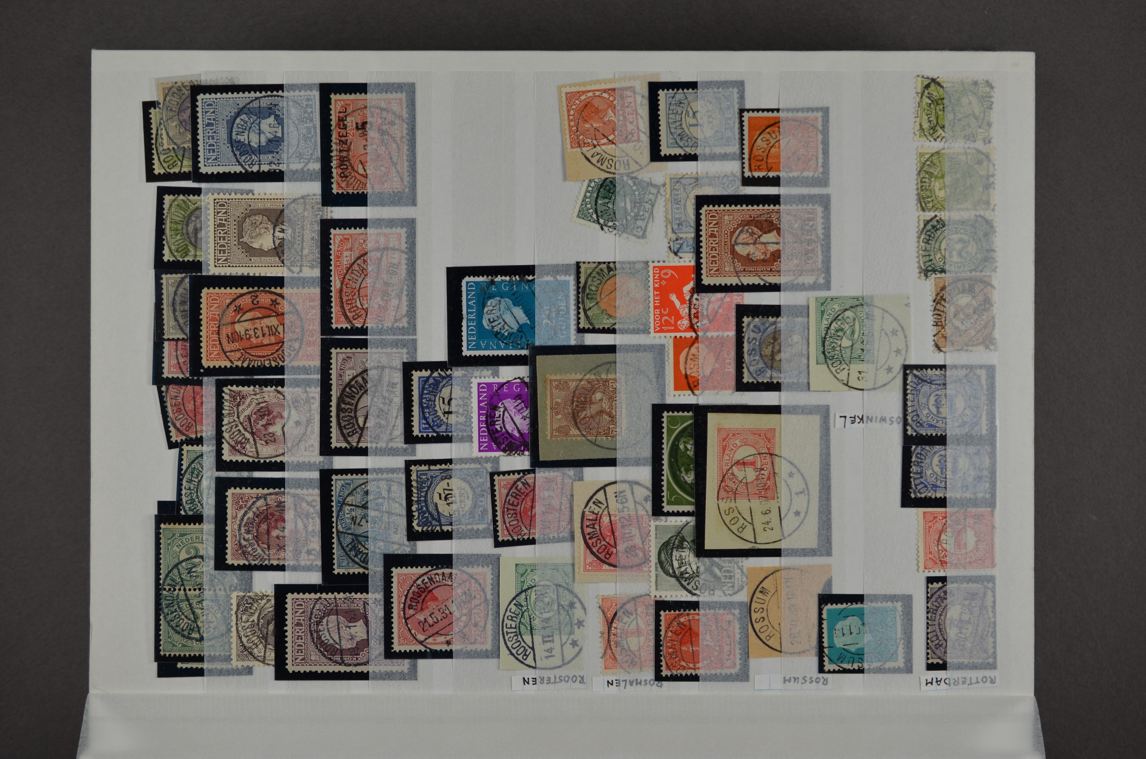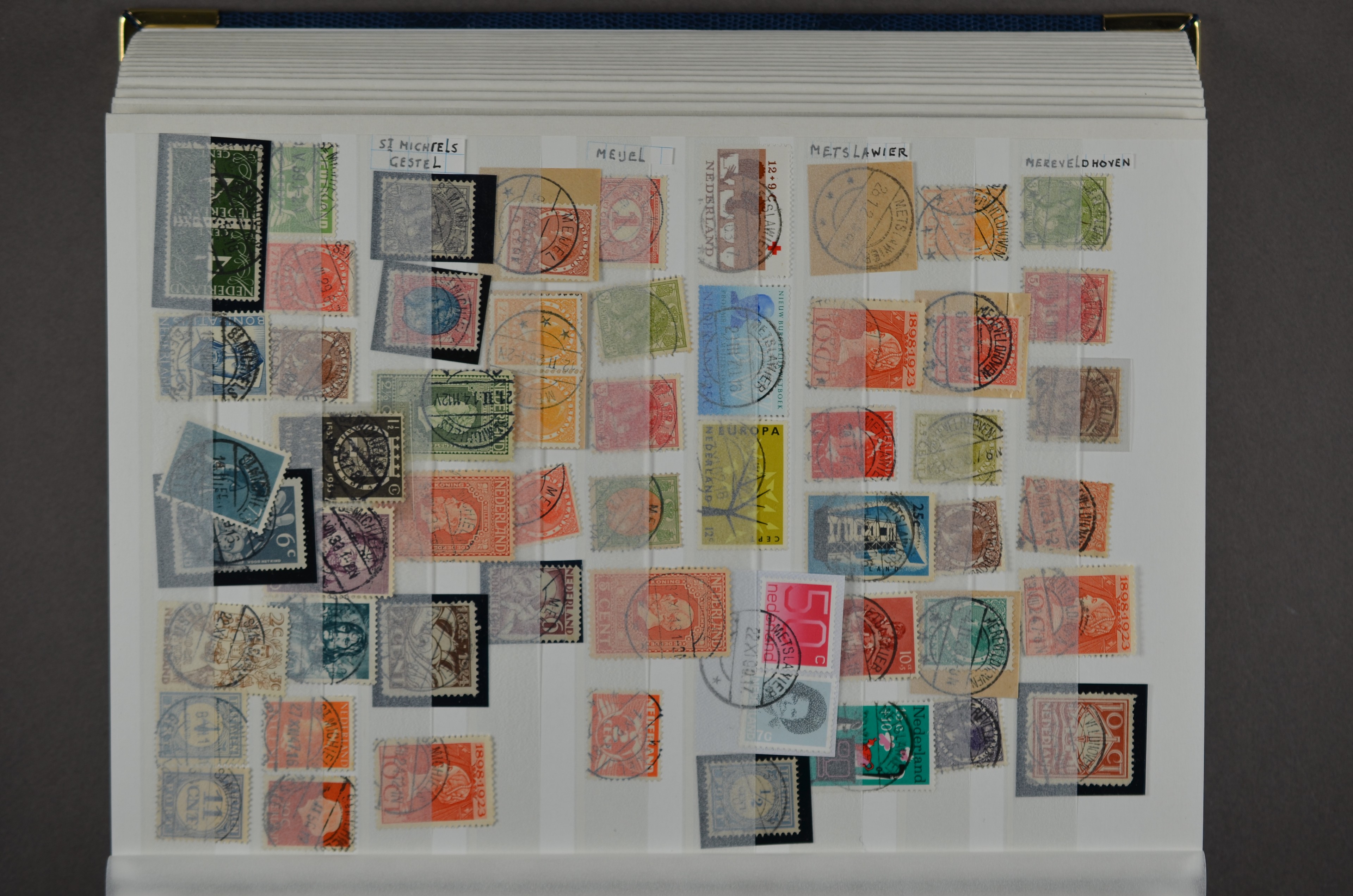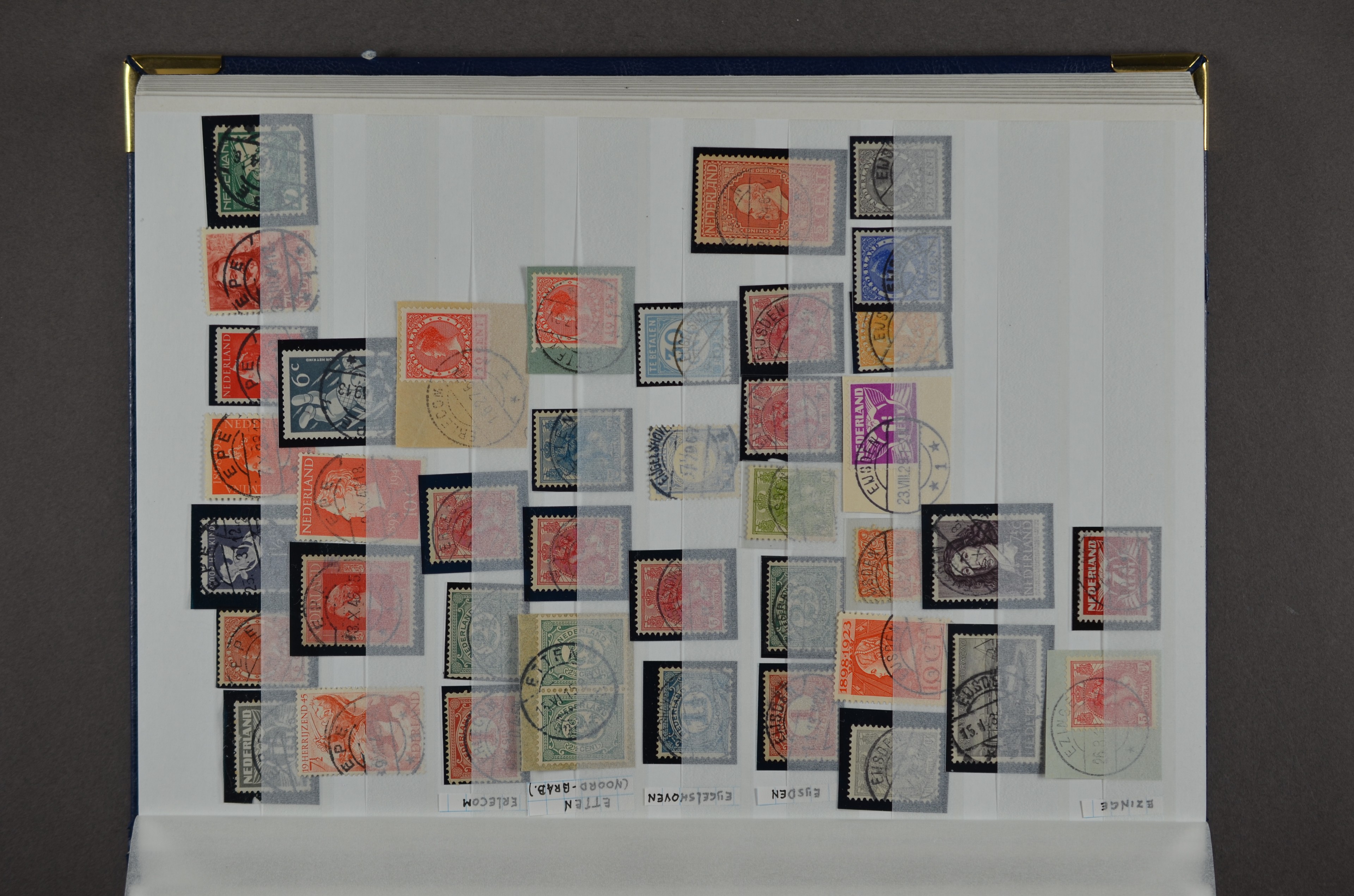 LANGEBALKSTEMPELS, uit Velling type 134/155 op vele, vele honderden losse zegels, merendeels volledige afstempelingen. Het lijken zogenaamd gewone, (semi-)moderne stempels maar in een dergelijke omvang, met zo veel kleine kantoren en in zulke uitzonderlijke kwaliteit nauwelijks meer bijeen te brengen. Voor de liefhebber, op alfabetische volgorde gesorteerd in 3 dikke insteekboeken vol verzamelplezier!