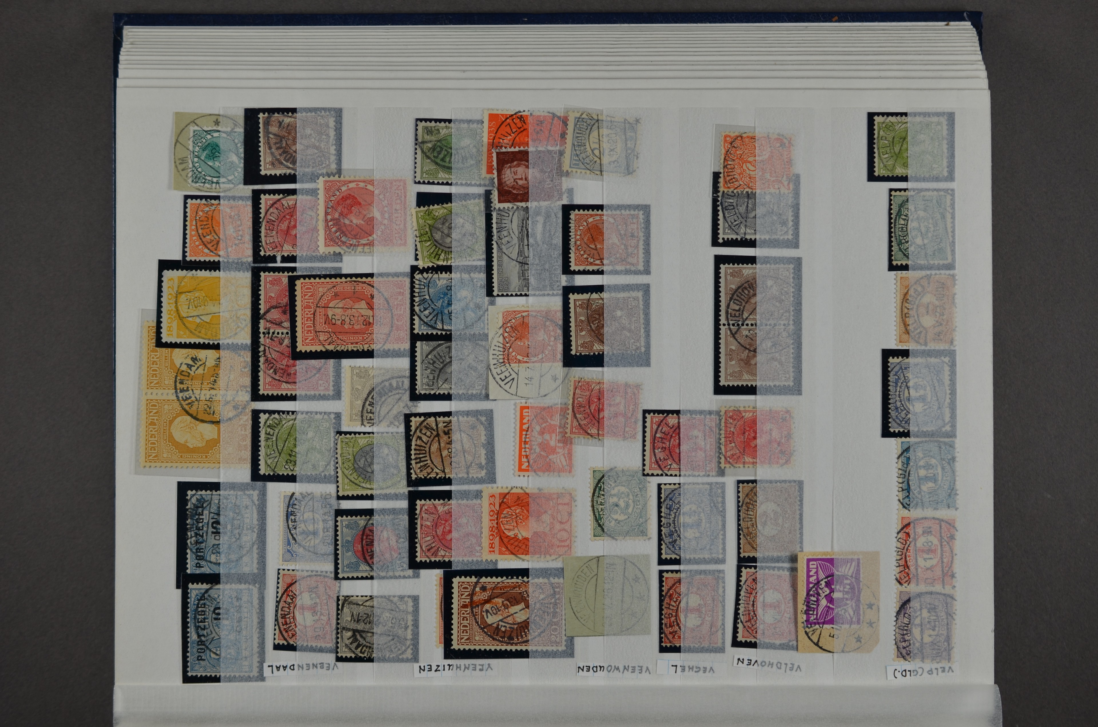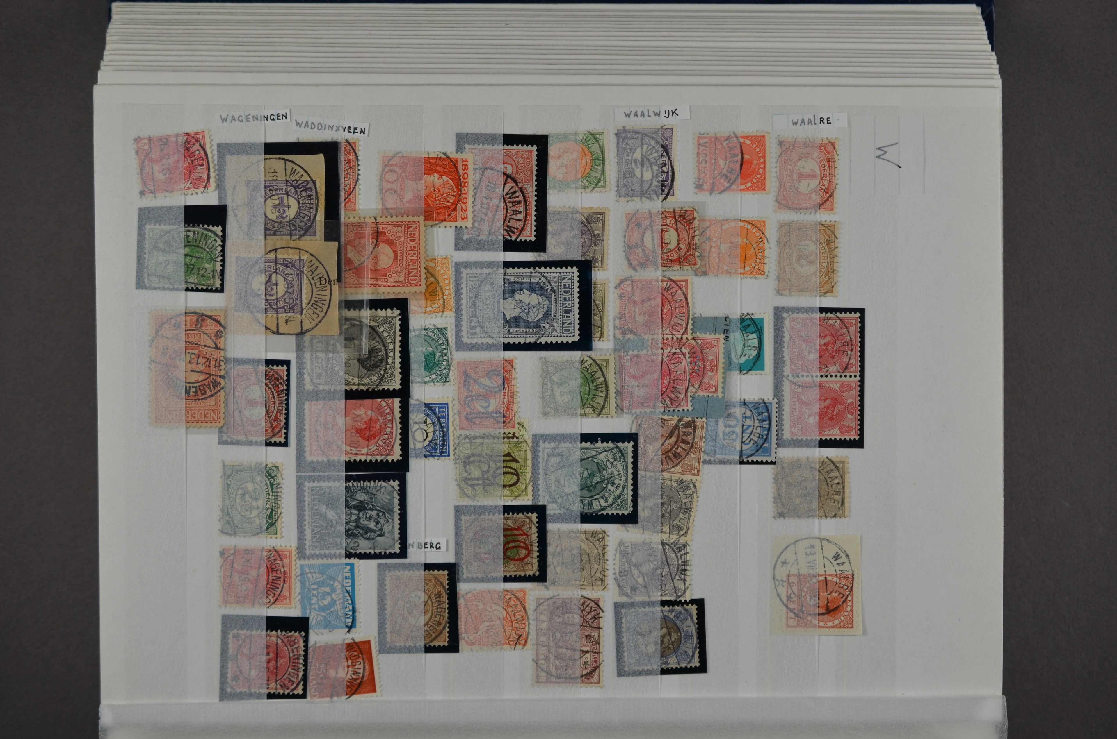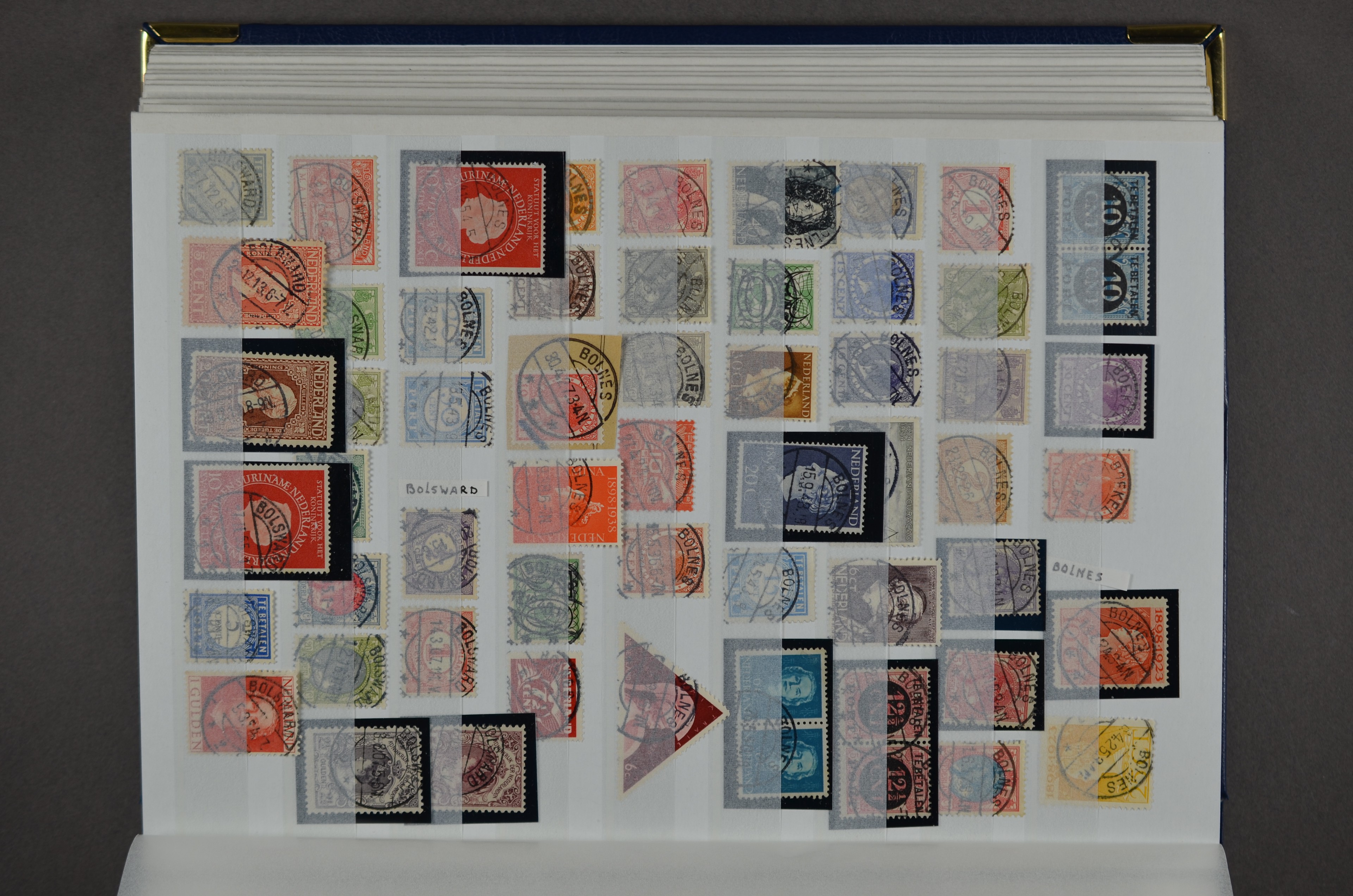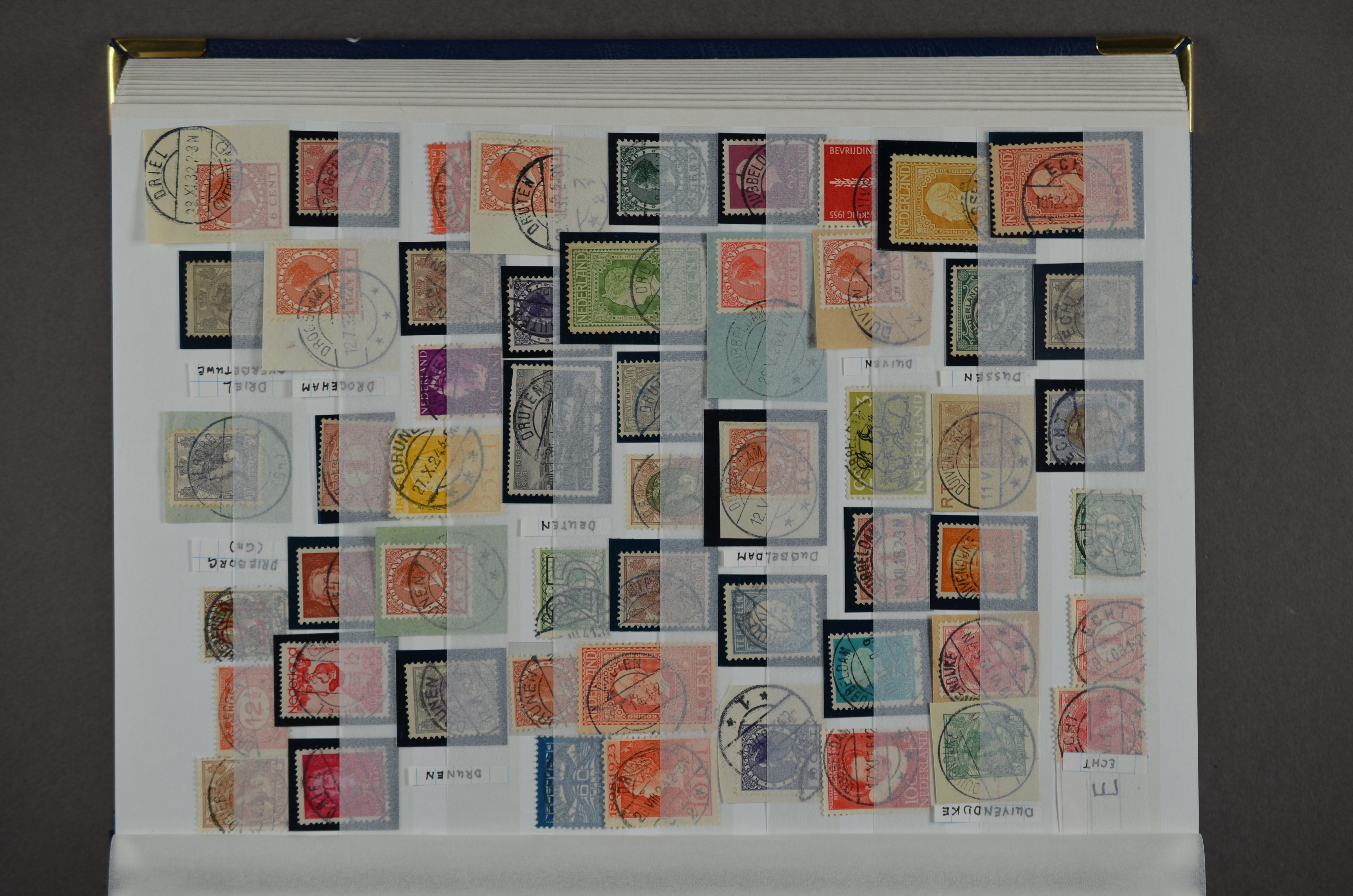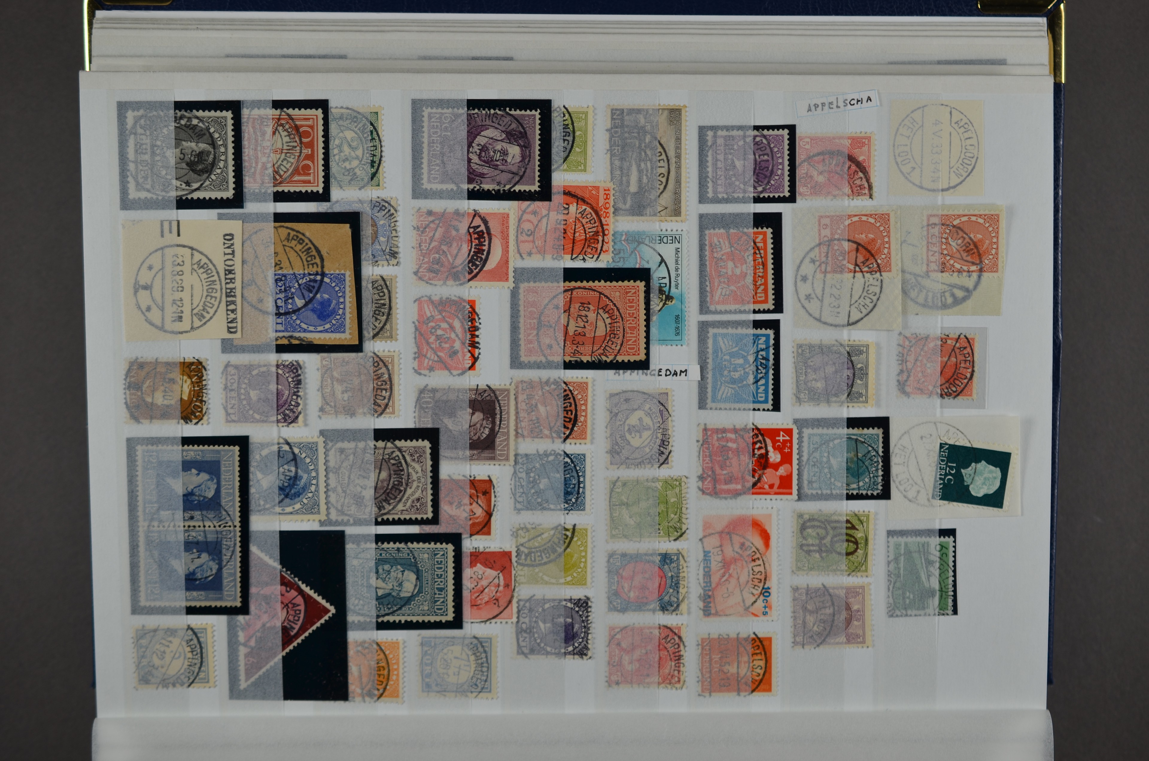 LANGEBALKSTEMPELS, uit Velling type 134/155 op vele, vele honderden losse zegels, merendeels volledige afstempelingen. Het lijken zogenaamd gewone, (semi-)moderne stempels maar in een dergelijke omvang, met zo veel kleine kantoren en in zulke uitzonderlijke kwaliteit nauwelijks meer bijeen te brengen. Voor de liefhebber, op alfabetische volgorde gesorteerd in 3 dikke insteekboeken vol verzamelplezier!