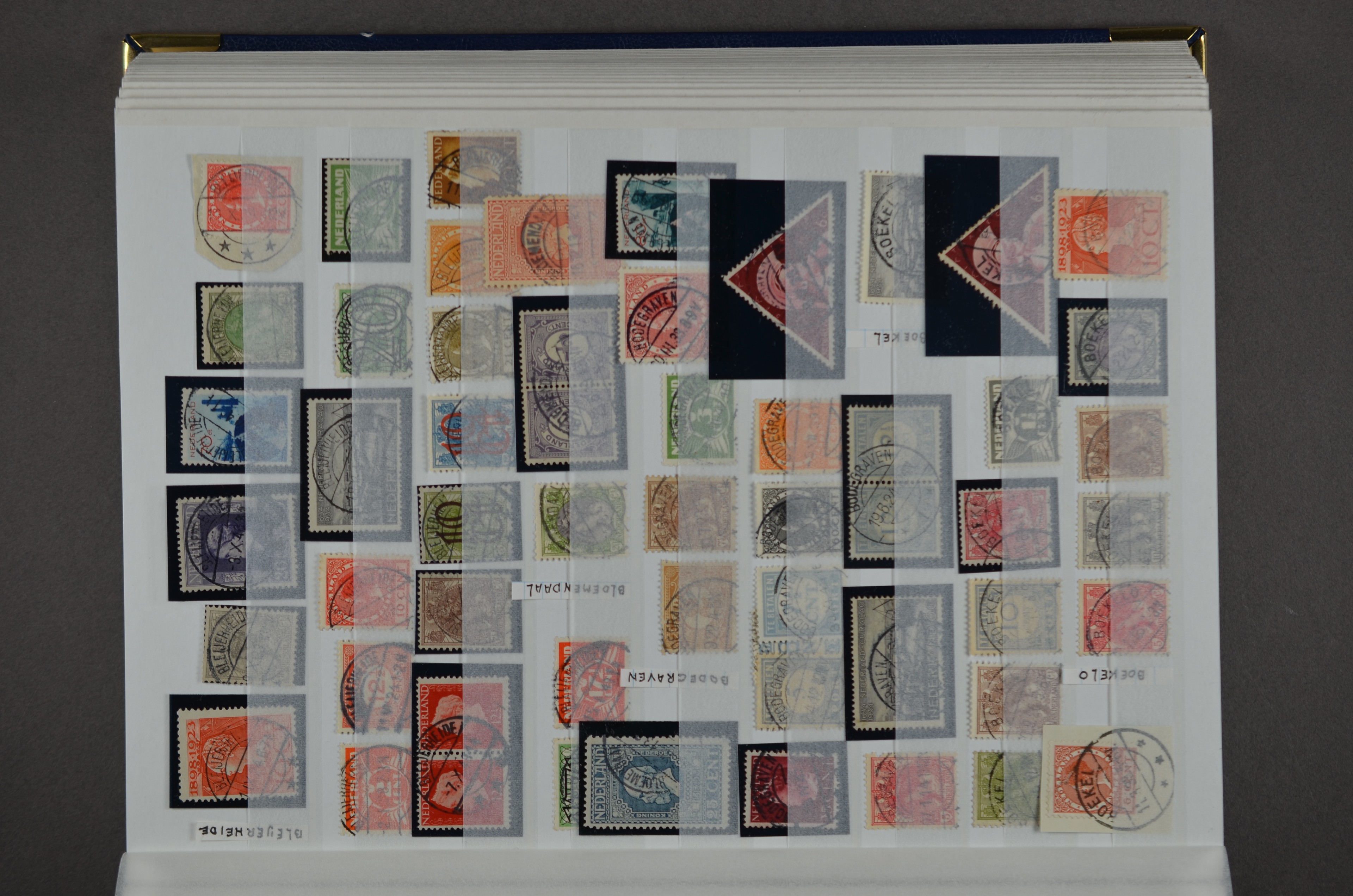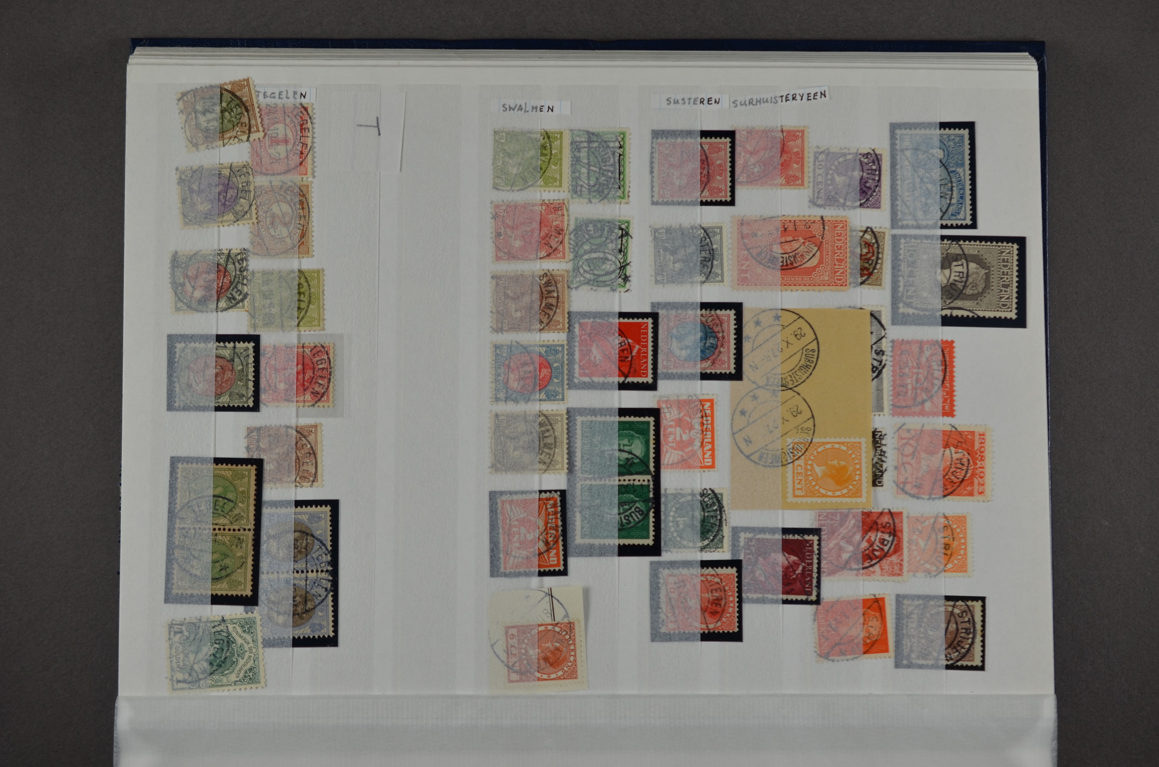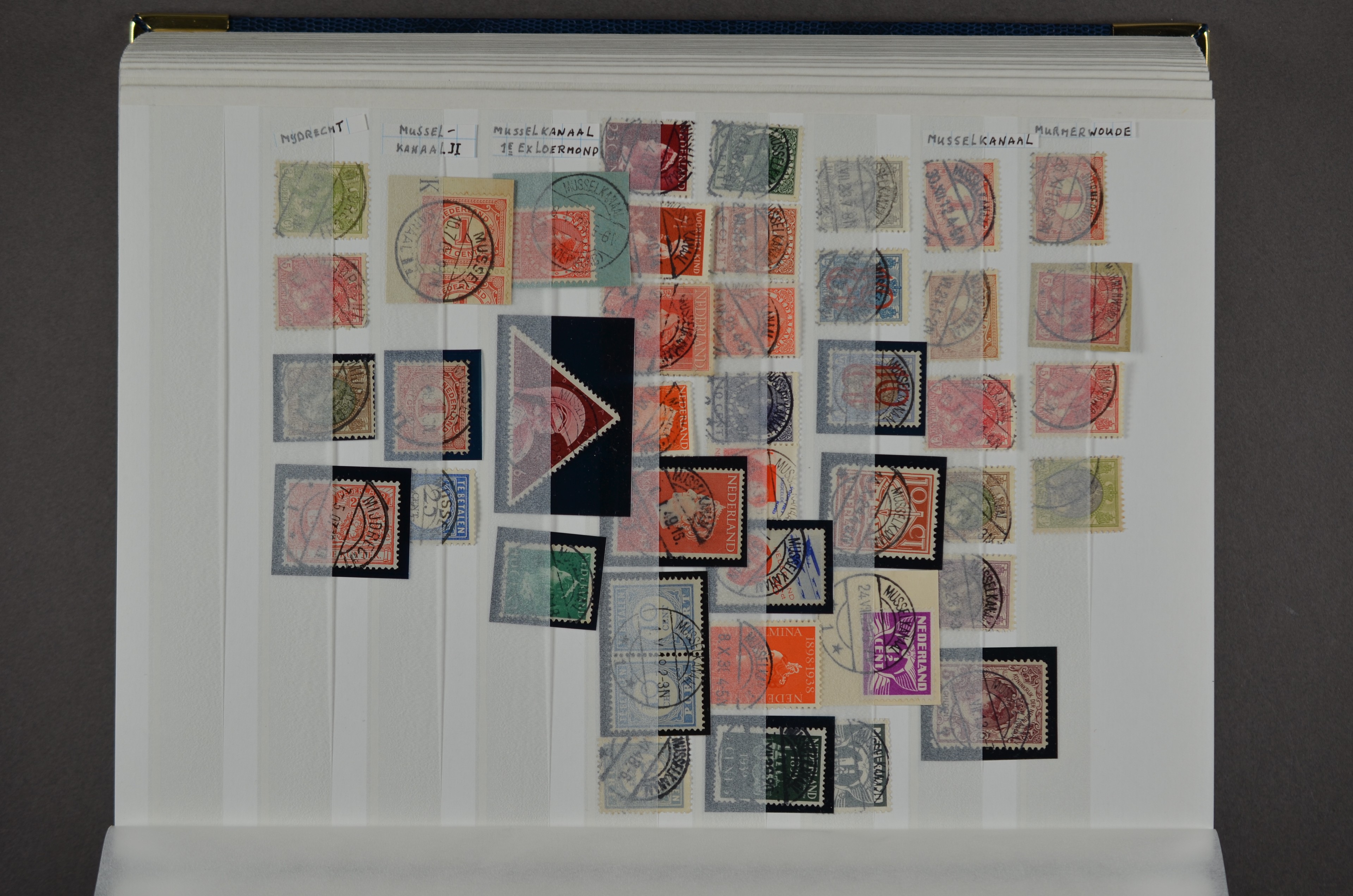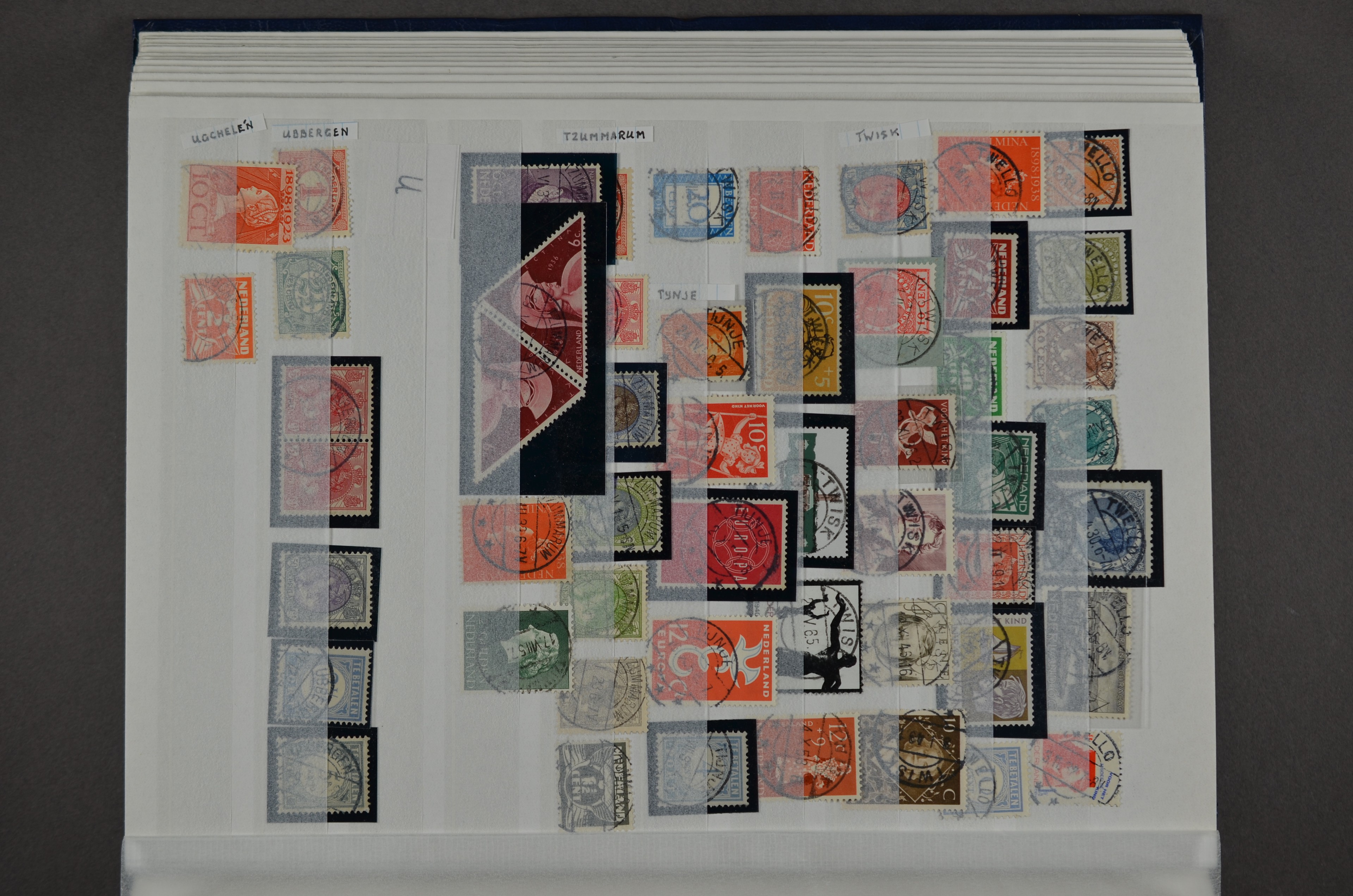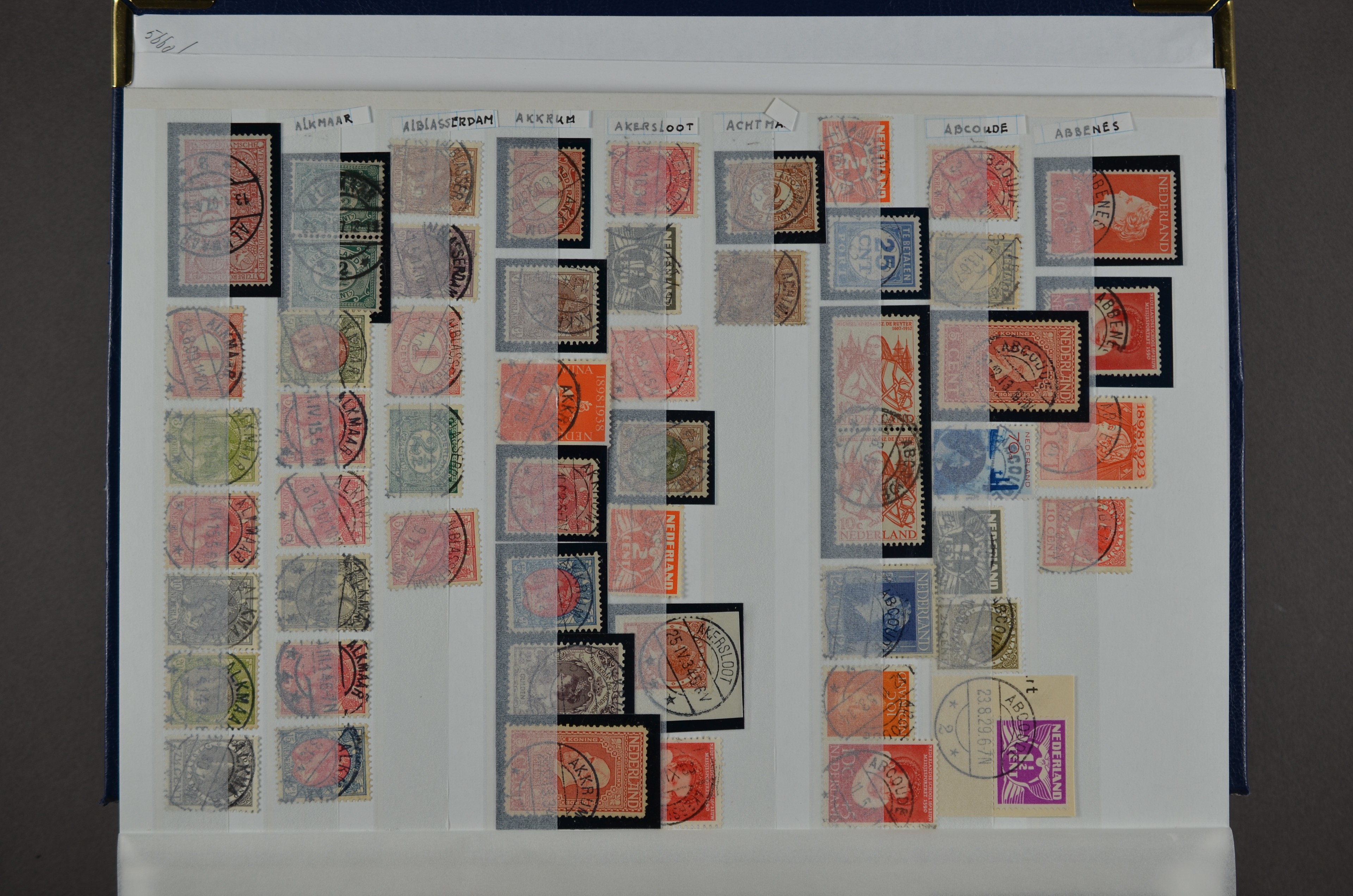 LANGEBALKSTEMPELS, uit Velling type 134/155 op vele, vele honderden losse zegels, merendeels volledige afstempelingen. Het lijken zogenaamd gewone, (semi-)moderne stempels maar in een dergelijke omvang, met zo veel kleine kantoren en in zulke uitzonderlijke kwaliteit nauwelijks meer bijeen te brengen. Voor de liefhebber, op alfabetische volgorde gesorteerd in 3 dikke insteekboeken vol verzamelplezier!