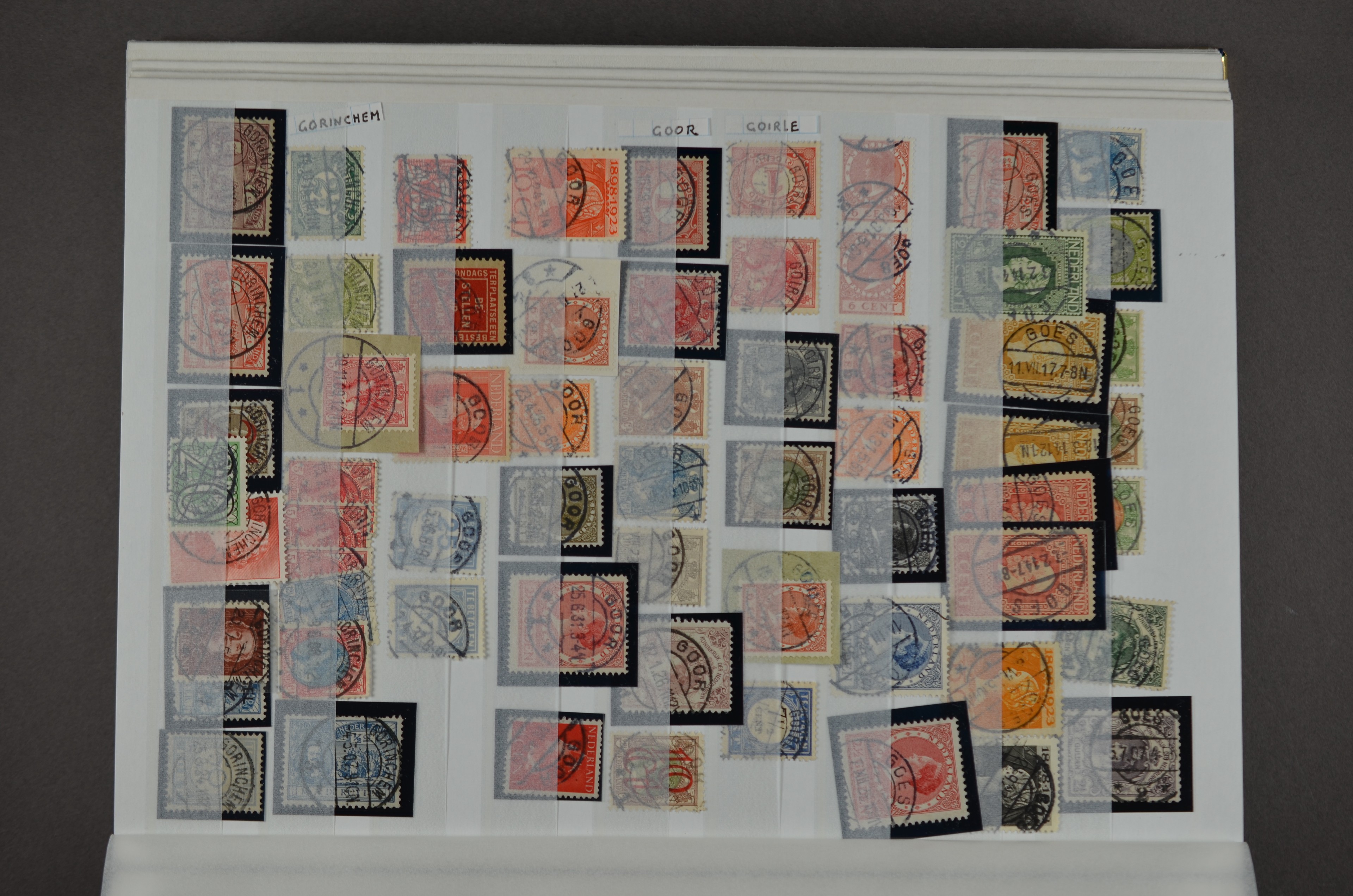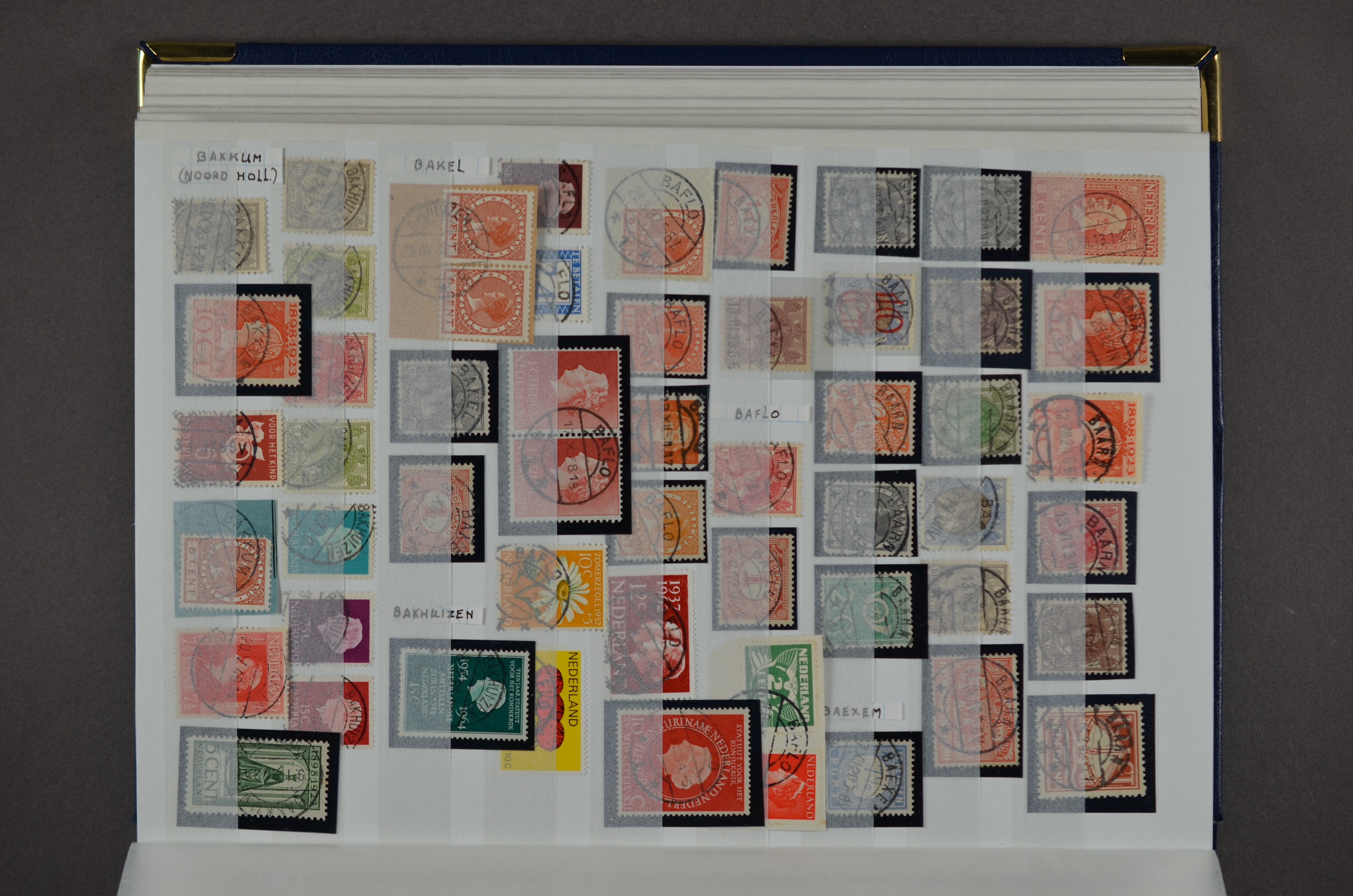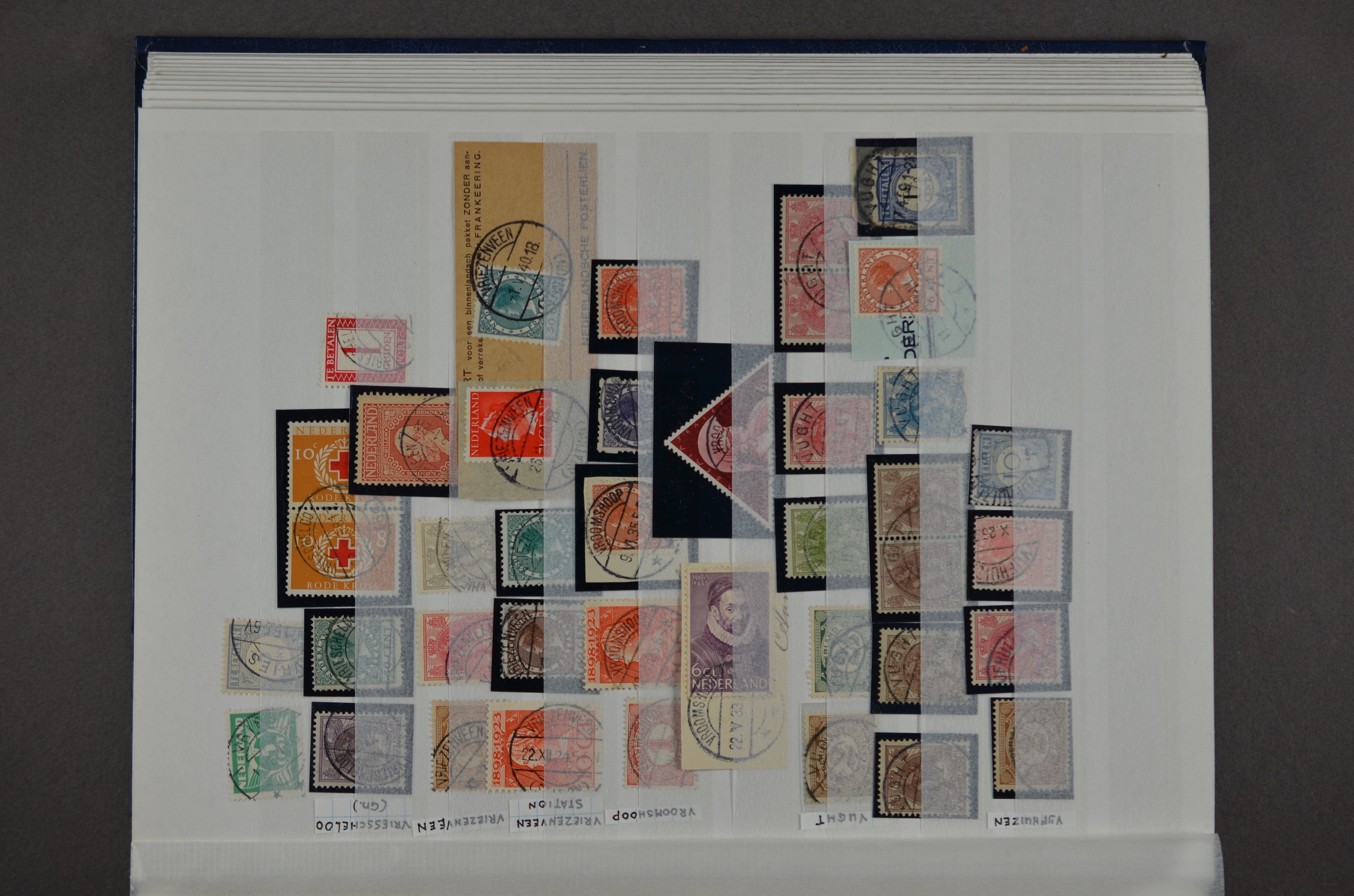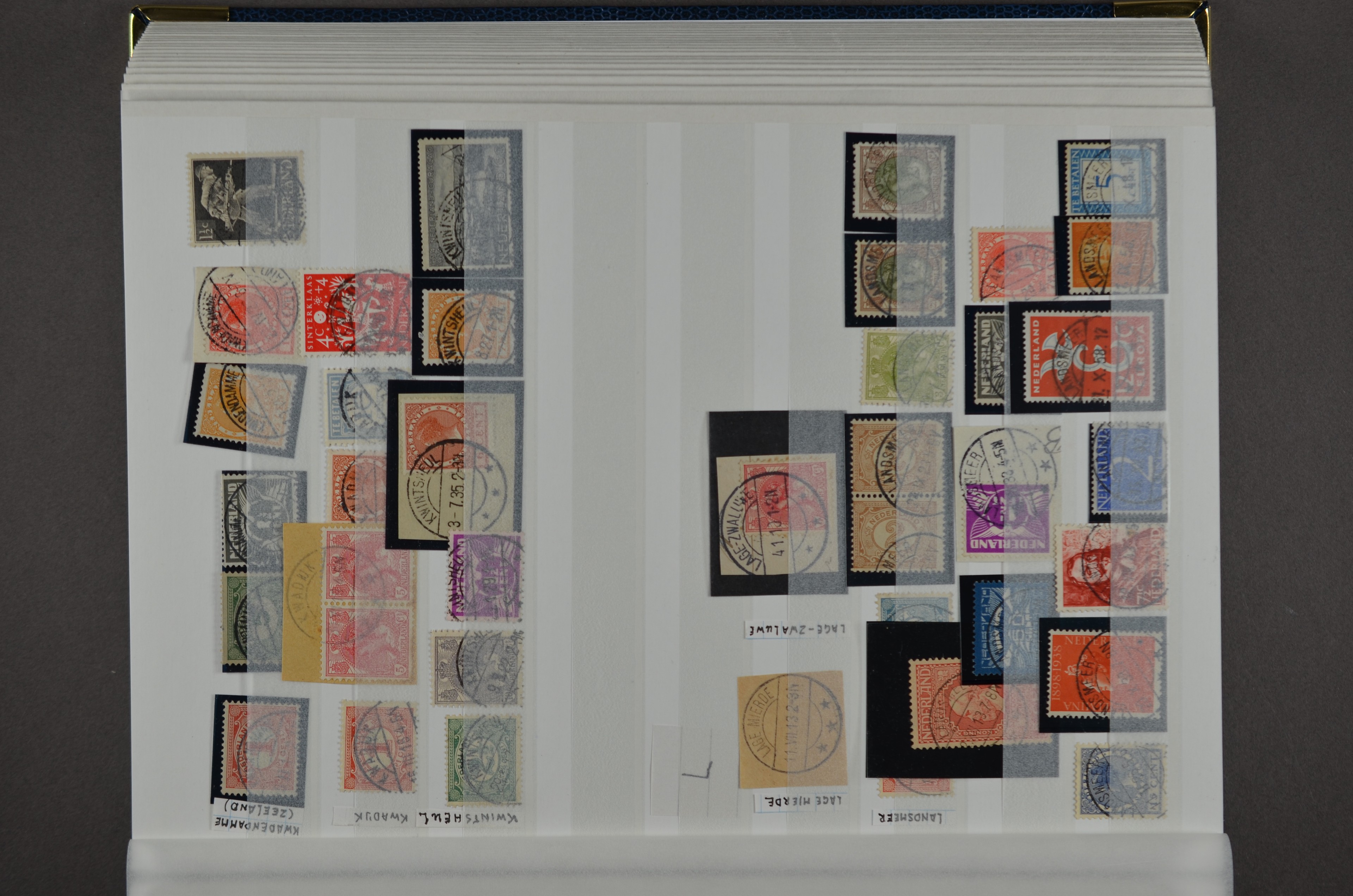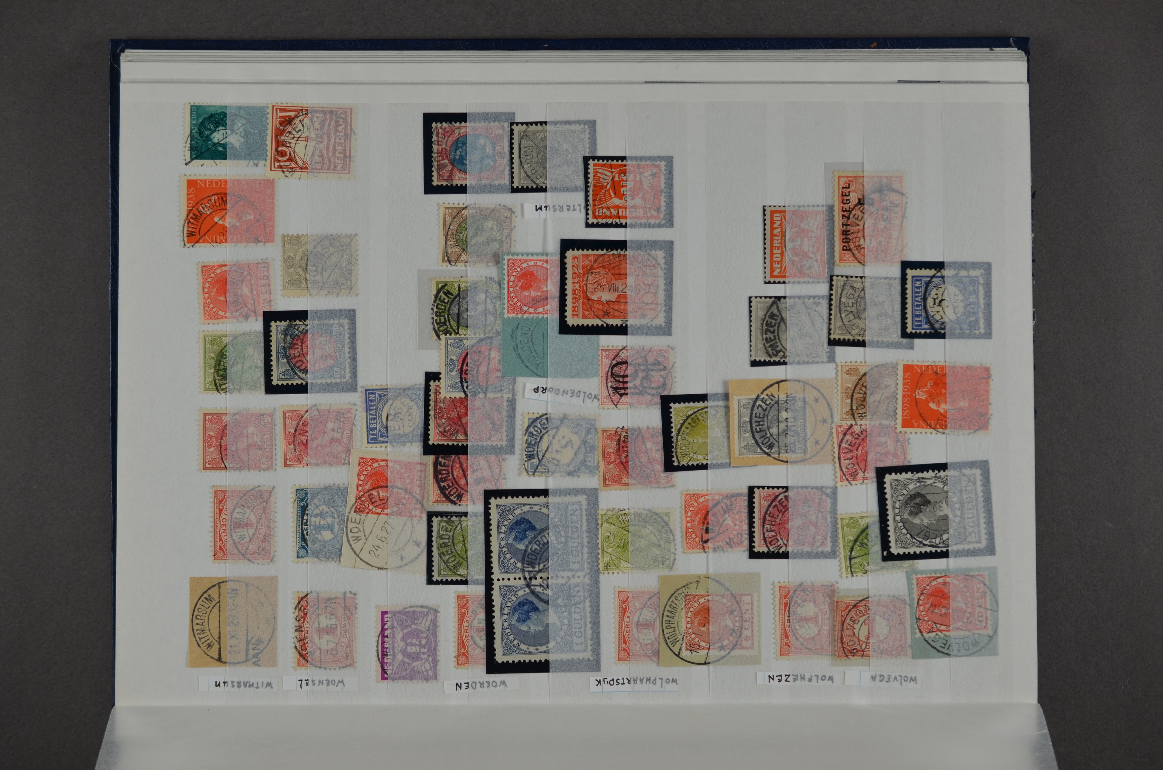 LANGEBALKSTEMPELS, uit Velling type 134/155 op vele, vele honderden losse zegels, merendeels volledige afstempelingen. Het lijken zogenaamd gewone, (semi-)moderne stempels maar in een dergelijke omvang, met zo veel kleine kantoren en in zulke uitzonderlijke kwaliteit nauwelijks meer bijeen te brengen. Voor de liefhebber, op alfabetische volgorde gesorteerd in 3 dikke insteekboeken vol verzamelplezier!