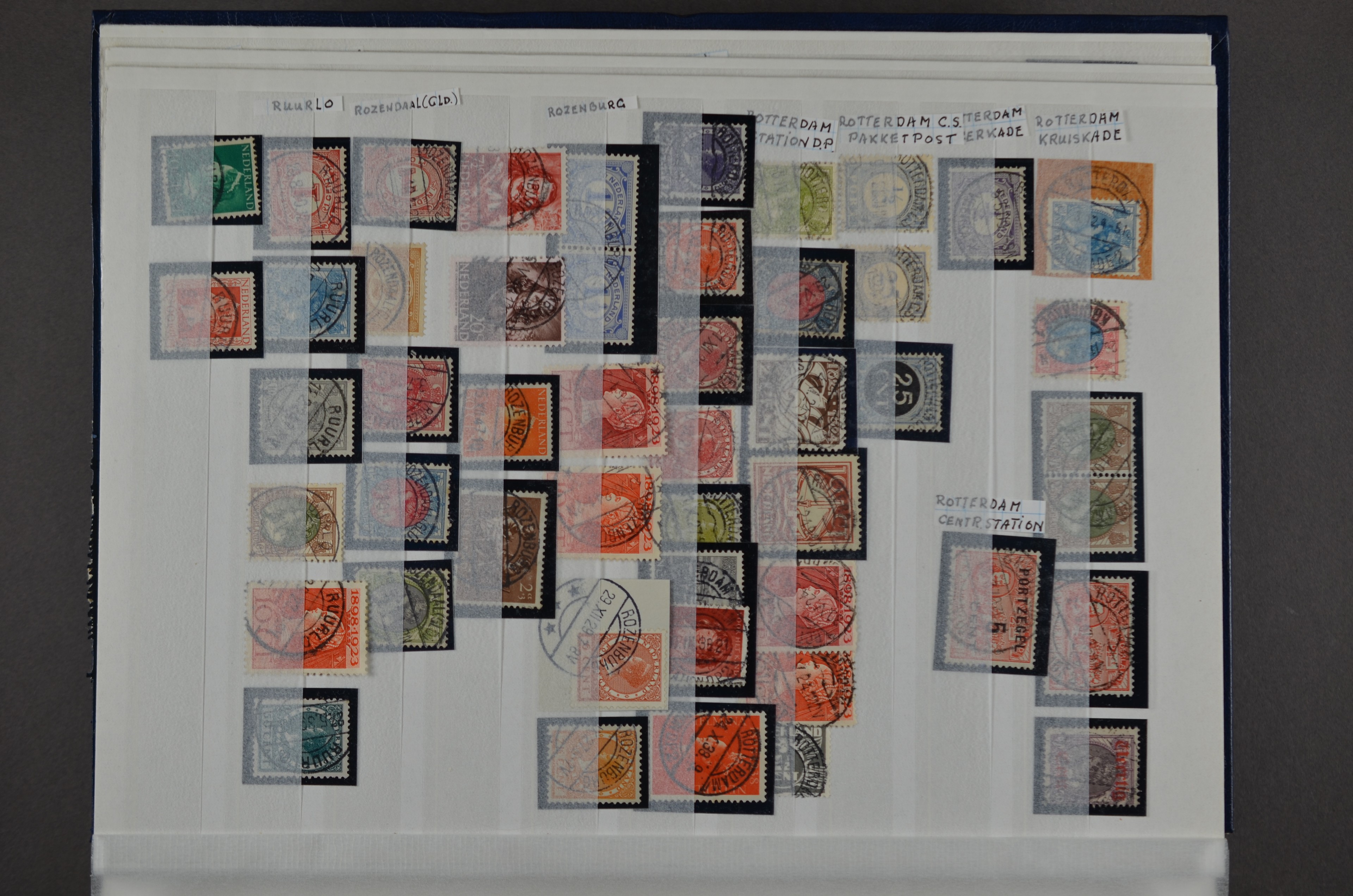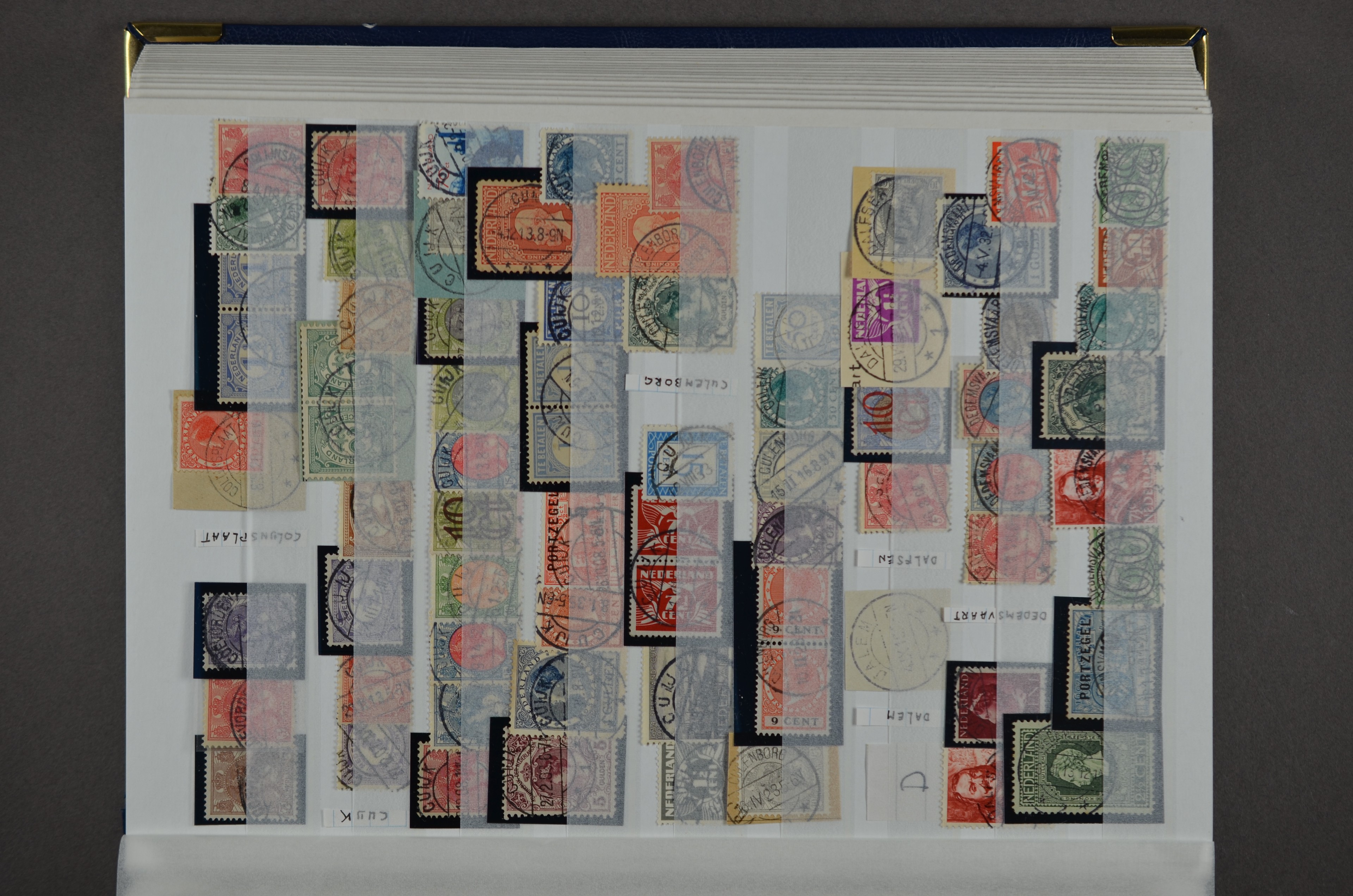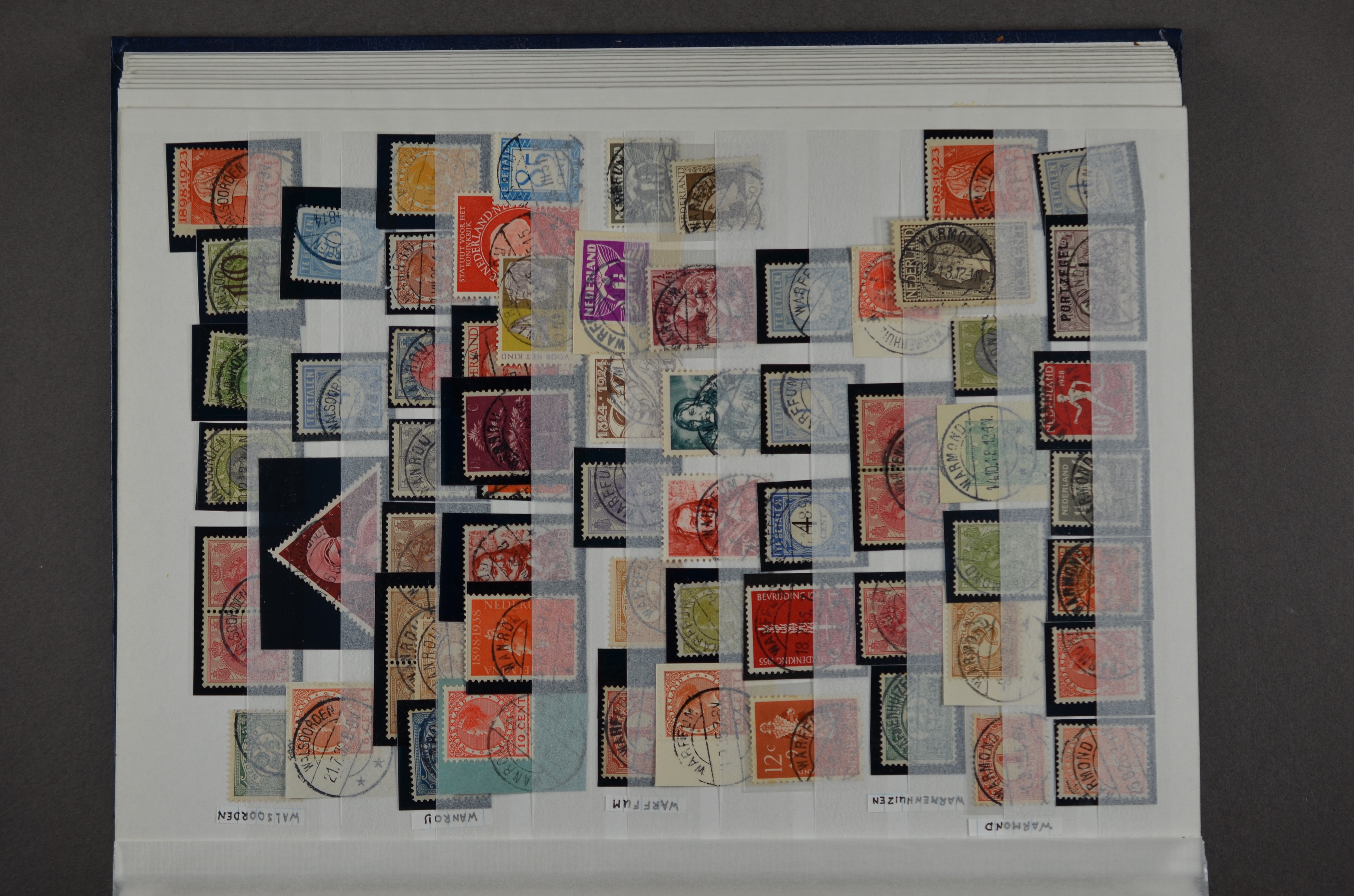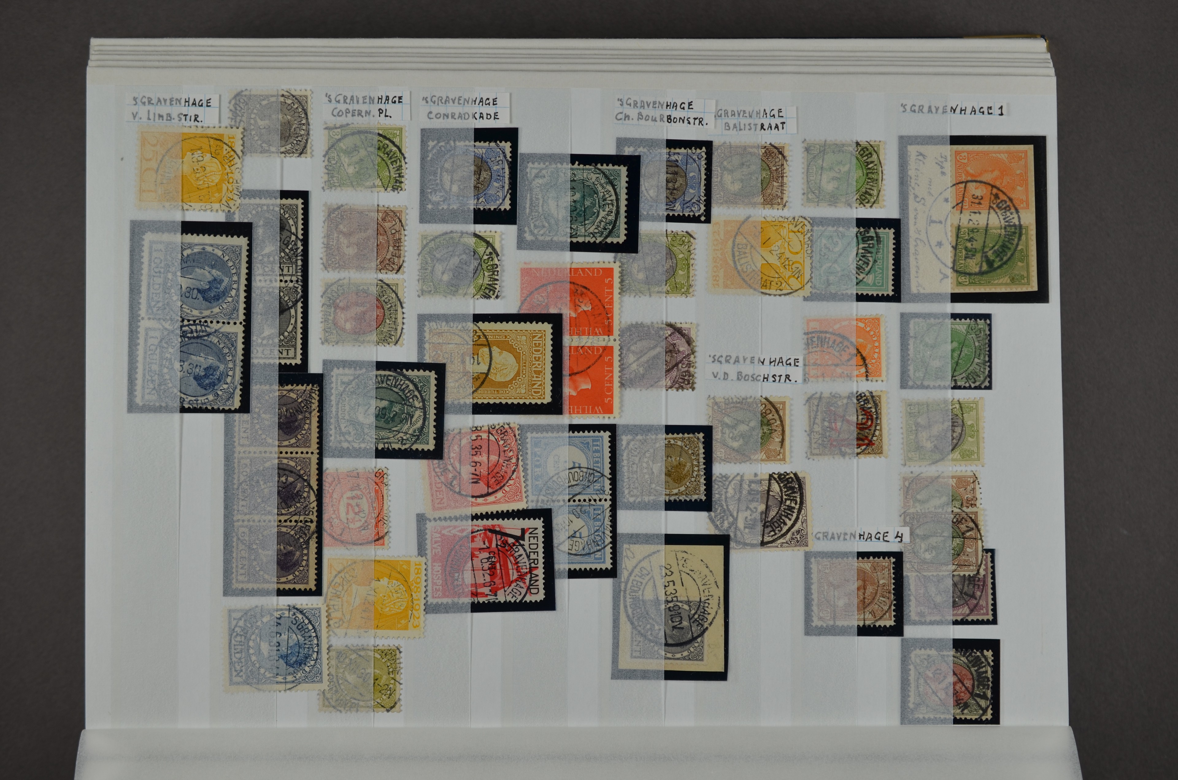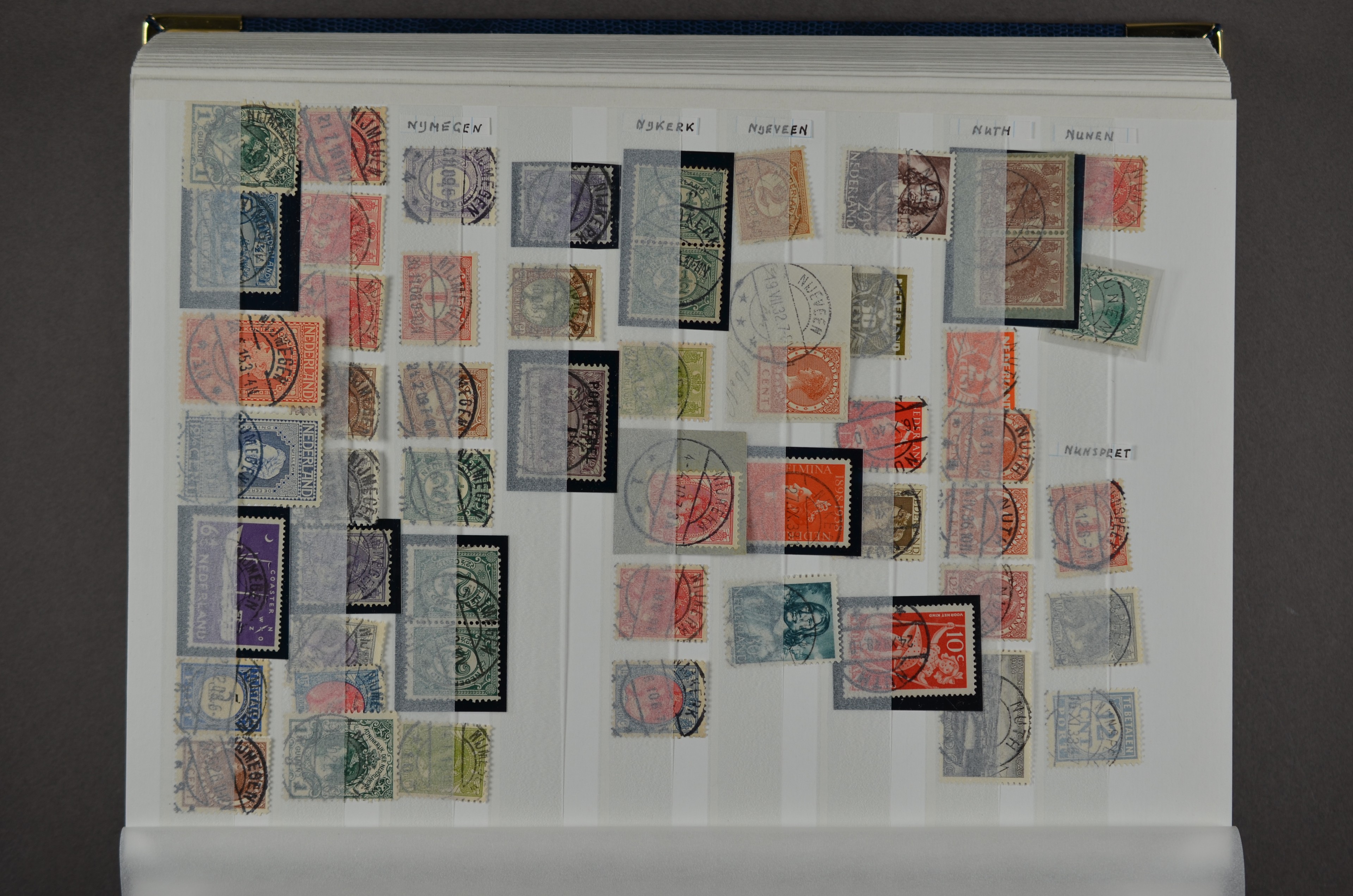 LANGEBALKSTEMPELS, uit Velling type 134/155 op vele, vele honderden losse zegels, merendeels volledige afstempelingen. Het lijken zogenaamd gewone, (semi-)moderne stempels maar in een dergelijke omvang, met zo veel kleine kantoren en in zulke uitzonderlijke kwaliteit nauwelijks meer bijeen te brengen. Voor de liefhebber, op alfabetische volgorde gesorteerd in 3 dikke insteekboeken vol verzamelplezier!