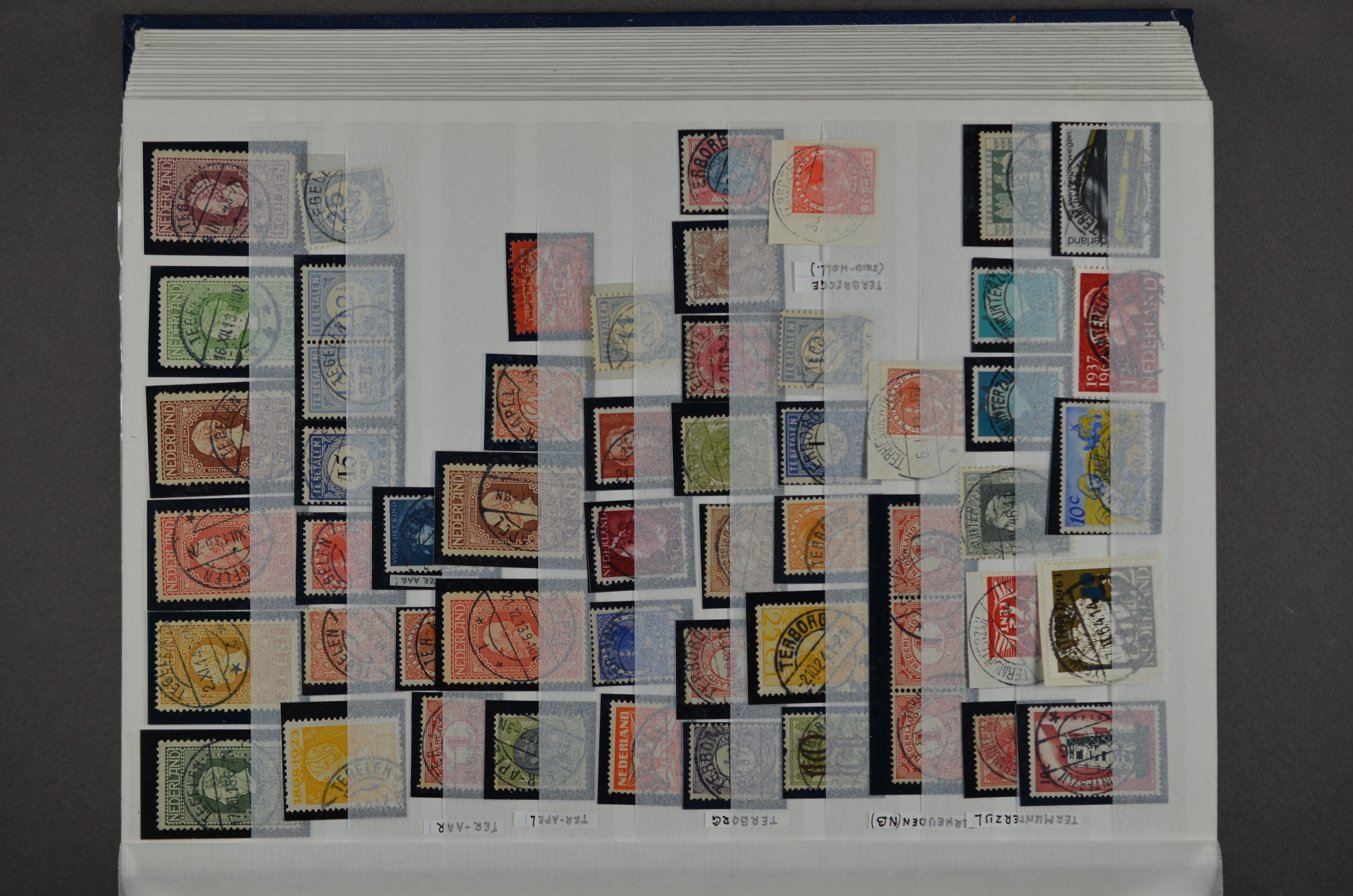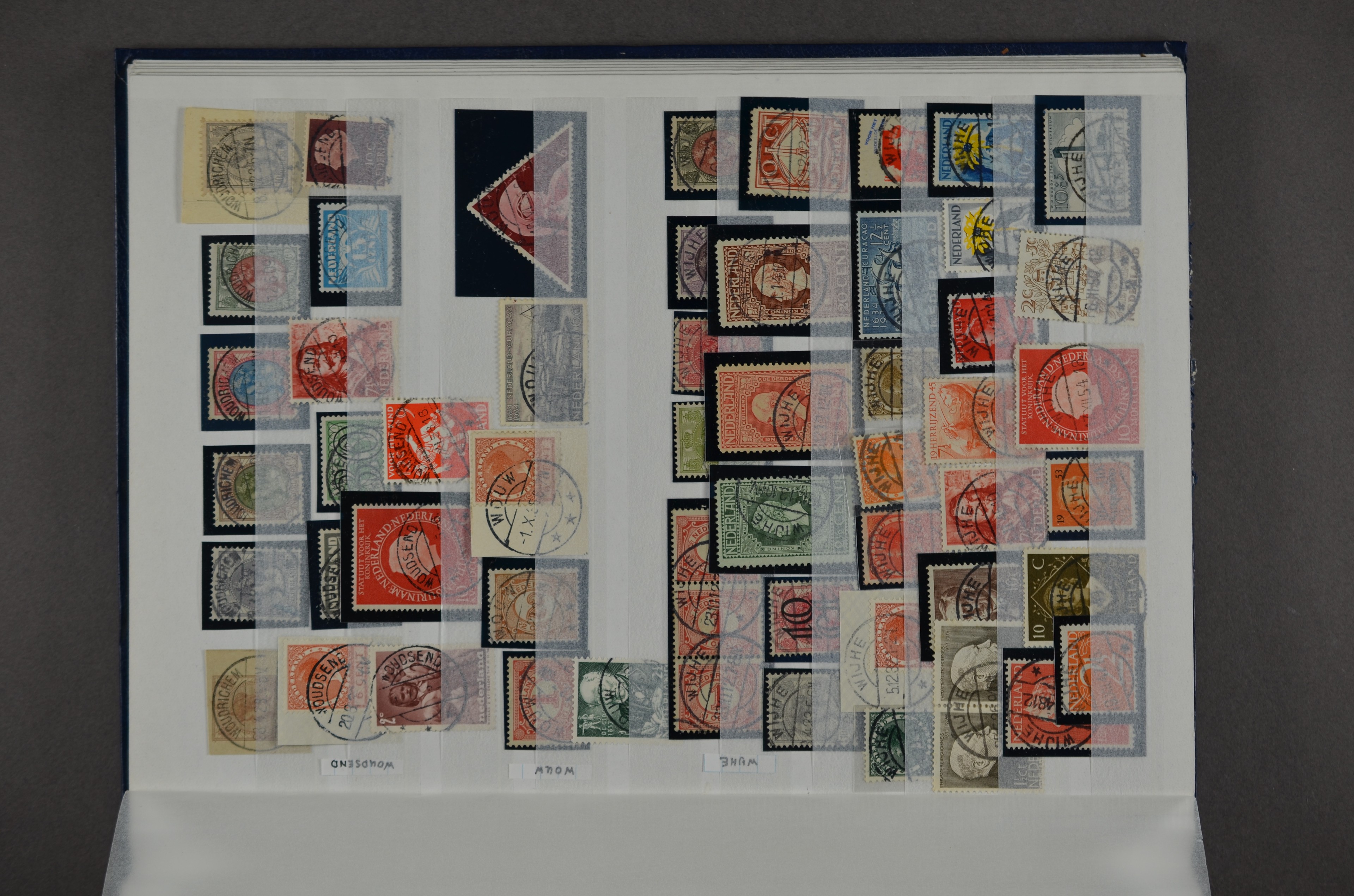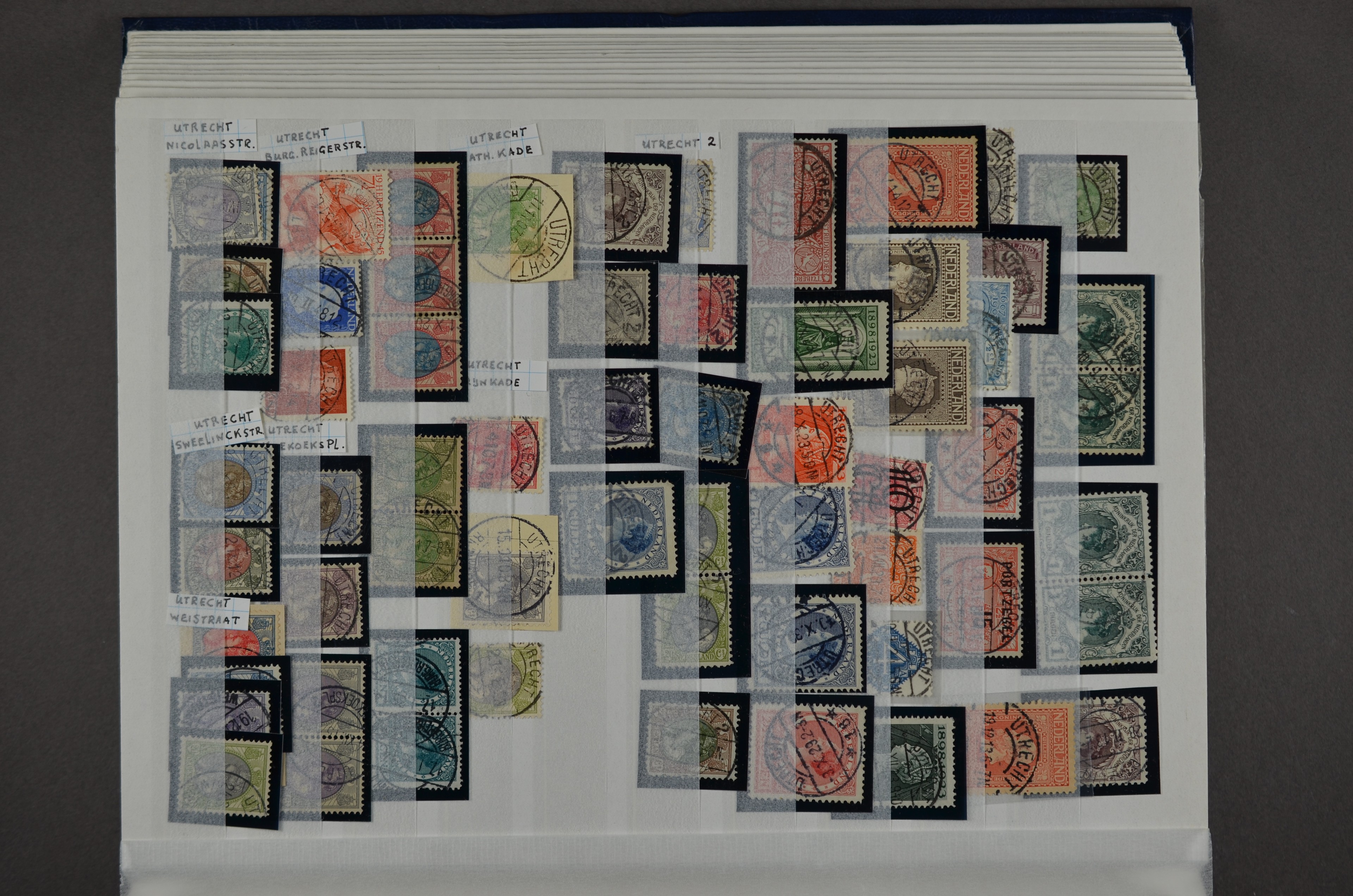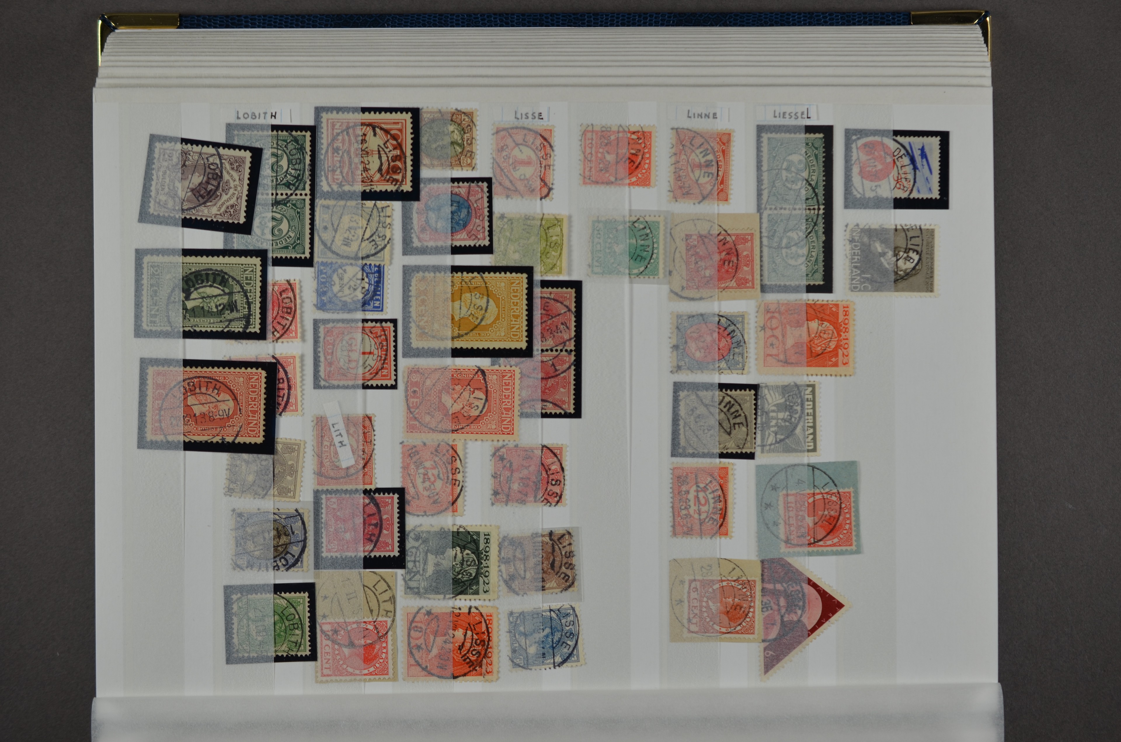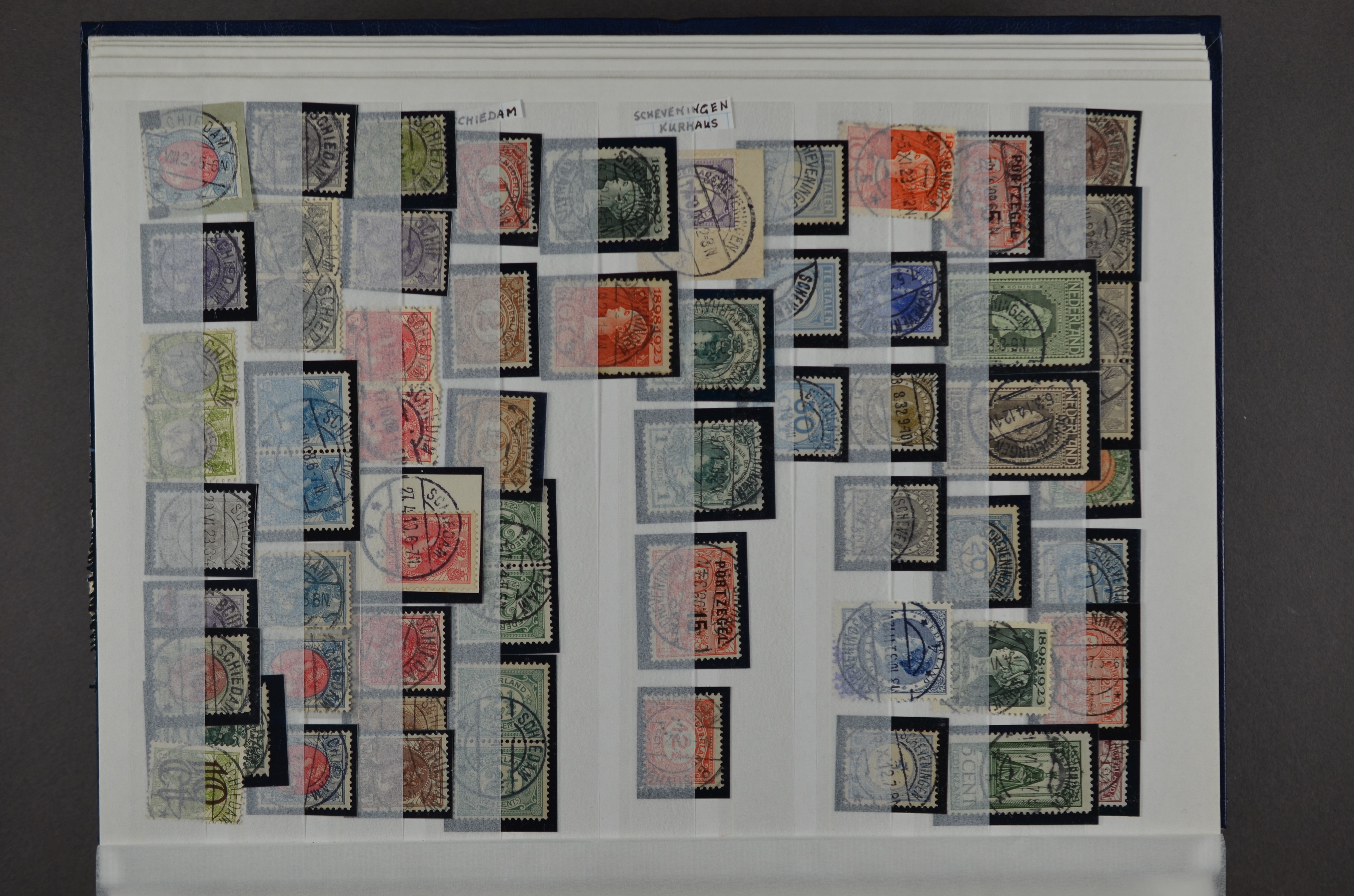 LANGEBALKSTEMPELS, uit Velling type 134/155 op vele, vele honderden losse zegels, merendeels volledige afstempelingen. Het lijken zogenaamd gewone, (semi-)moderne stempels maar in een dergelijke omvang, met zo veel kleine kantoren en in zulke uitzonderlijke kwaliteit nauwelijks meer bijeen te brengen. Voor de liefhebber, op alfabetische volgorde gesorteerd in 3 dikke insteekboeken vol verzamelplezier!