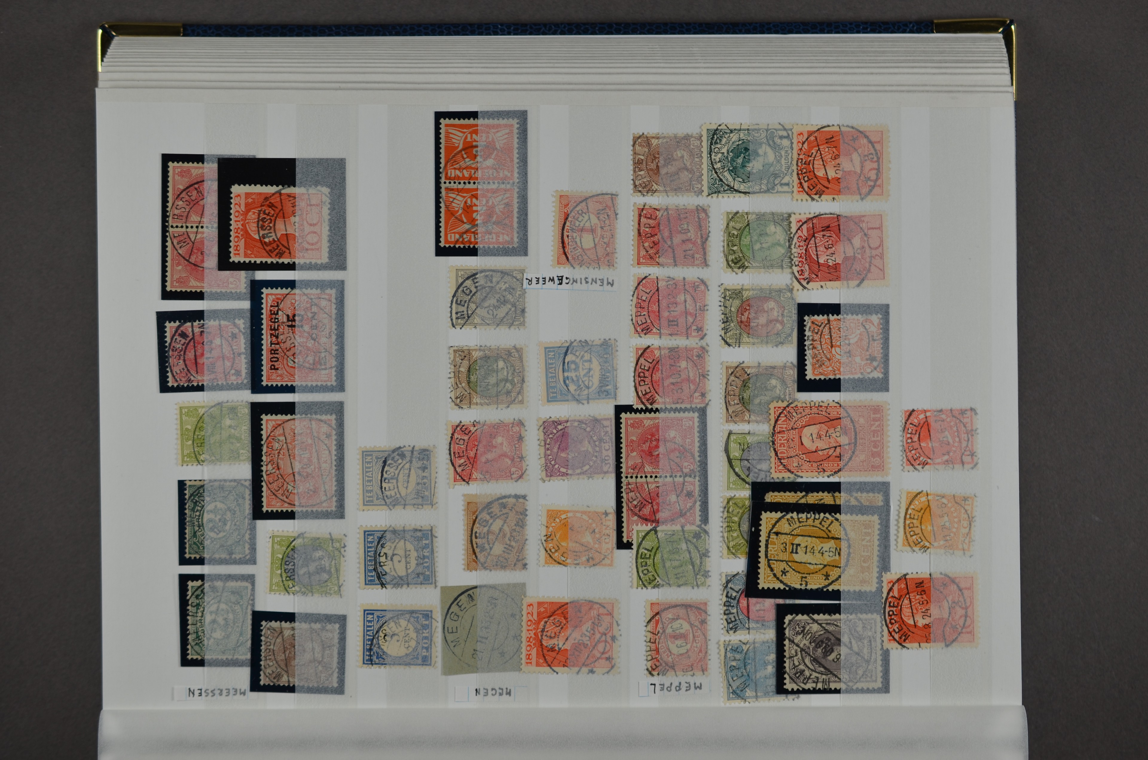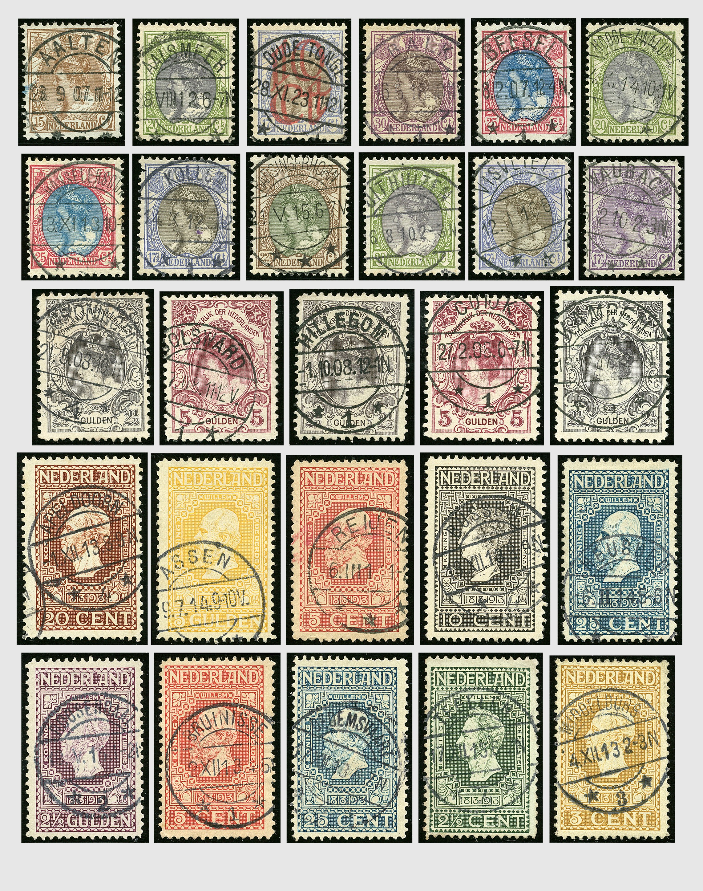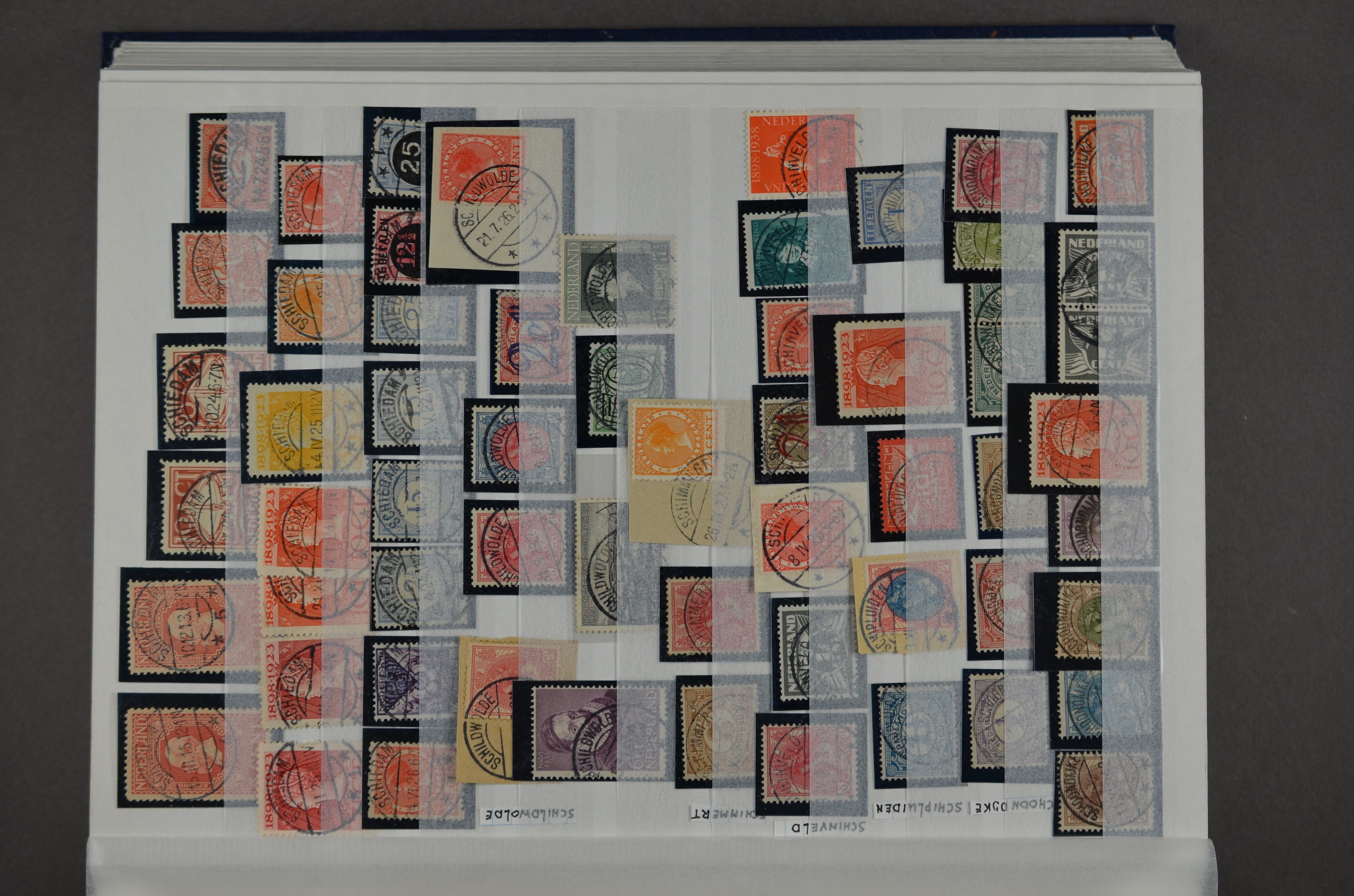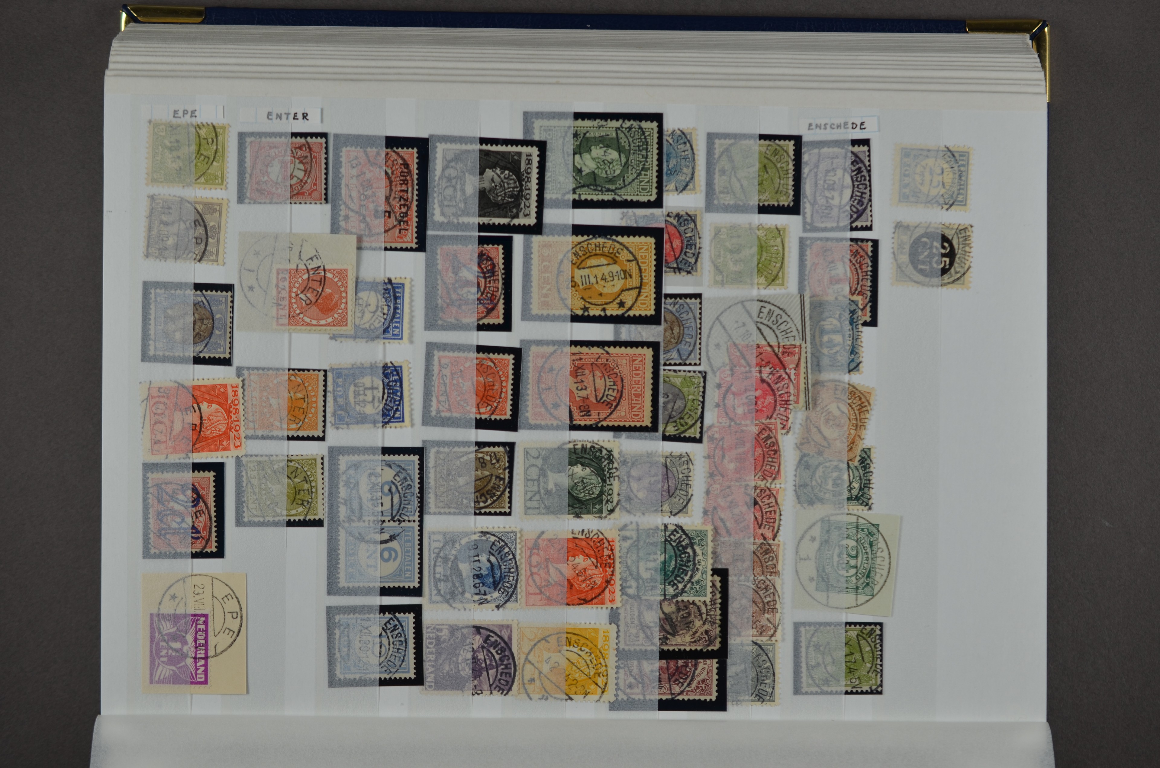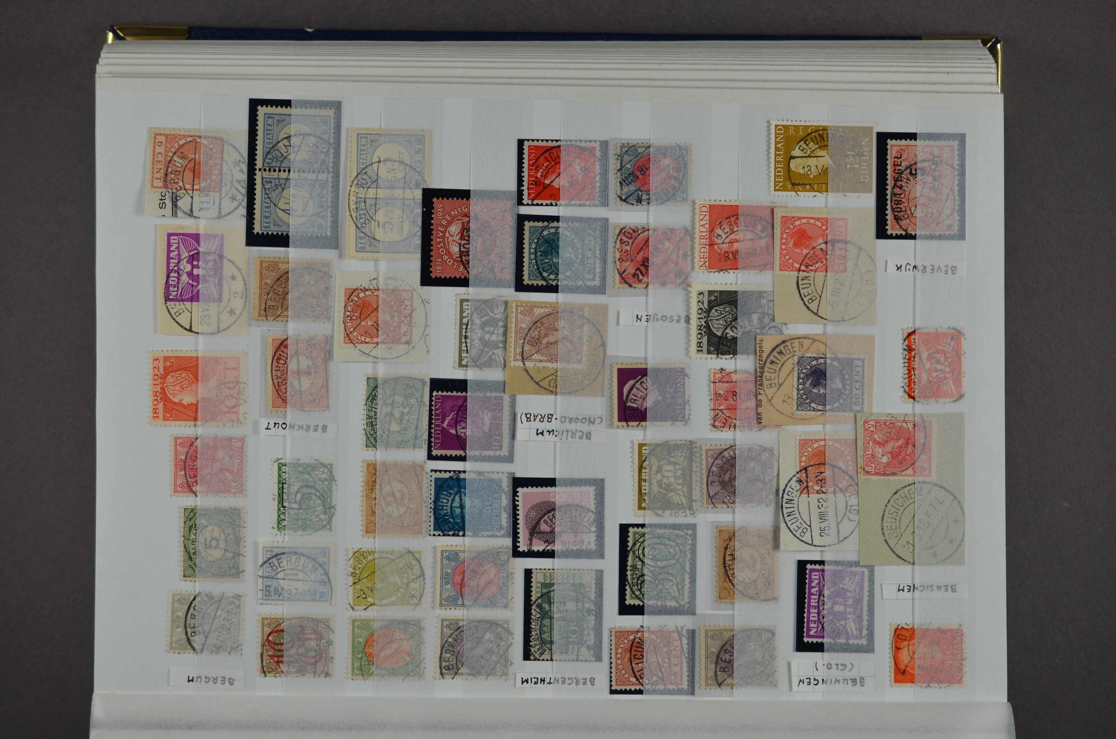 LANGEBALKSTEMPELS, uit Velling type 134/155 op vele, vele honderden losse zegels, merendeels volledige afstempelingen. Het lijken zogenaamd gewone, (semi-)moderne stempels maar in een dergelijke omvang, met zo veel kleine kantoren en in zulke uitzonderlijke kwaliteit nauwelijks meer bijeen te brengen. Voor de liefhebber, op alfabetische volgorde gesorteerd in 3 dikke insteekboeken vol verzamelplezier!