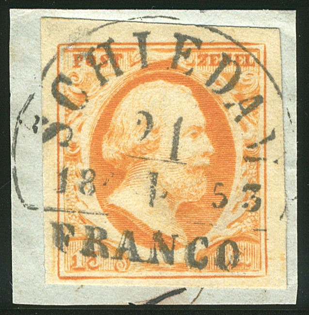 SCHIEDAM B (EY.700) op 15 cent nr. 3b, pos. 14. Normaal tot breed gerand prachtex. op briefstukje met ideale afst. Attest Vleeming (2019): 'Dit betreft de best bekende afdruk.' Ex Klink, De Peijper