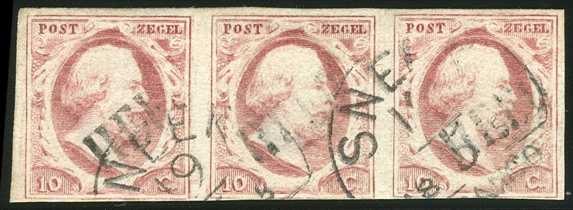 HEEG (EY.RR) op 10 cent nr. 2e-Pl.III-81/83. Onderrand smal, zegels 82/83 iets aangesneden, overigens goed gerande strip van drie met op elke zegel een volledige, iets lichte afst. Mogelijk uniek