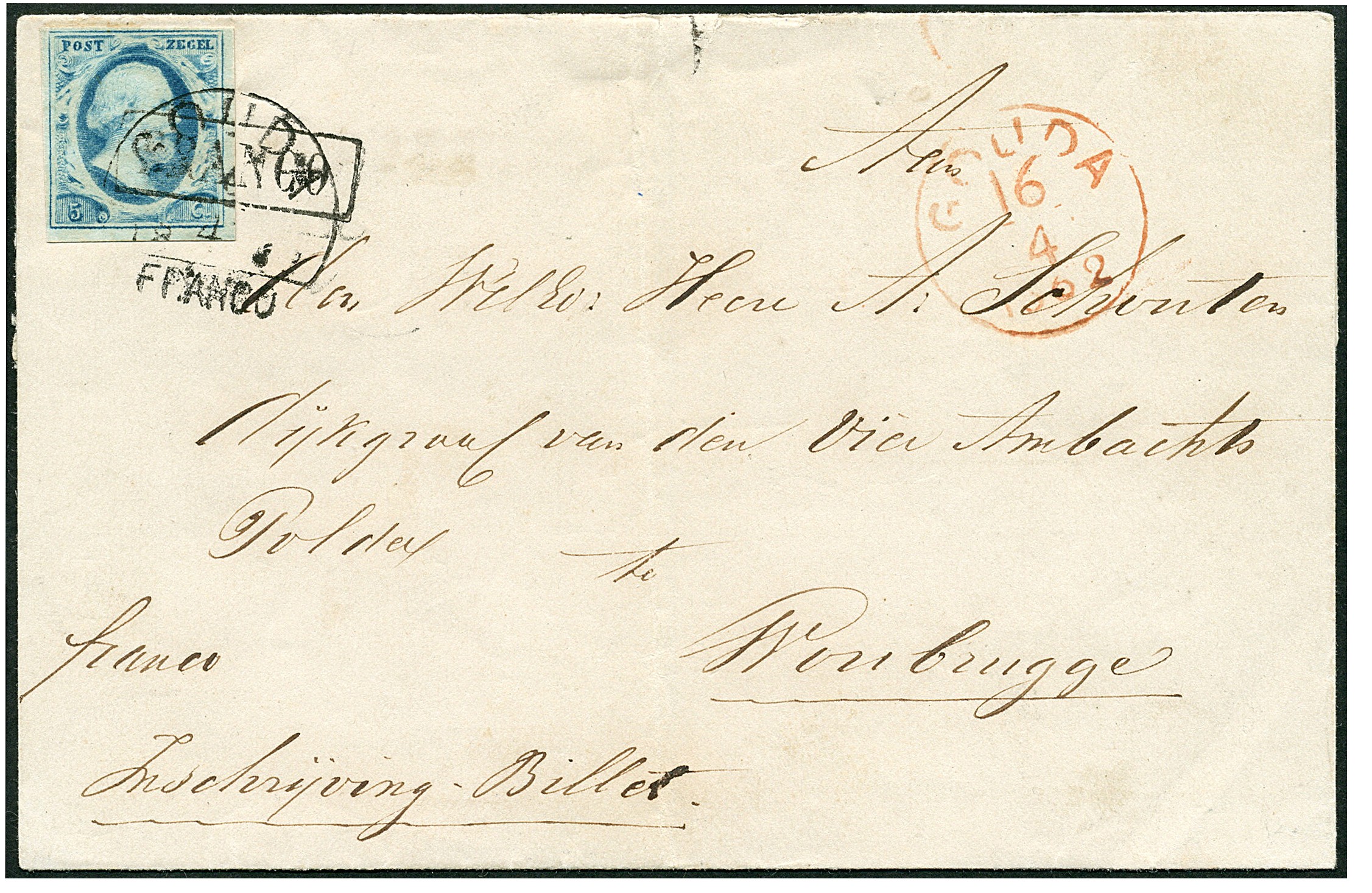 GOUDA C (EY.125) op 5 cent. Prachtex. tegen de voorschriften afgestempeld met het halfrond-francostempel, gecorrigeerd met het stempel Franco in kader, op briefomslag (Inschrijving-Billet) van Waddingsveen (az. naamstempel) over Gouda 16-4-1861 (op vz. rondstempel) en Alphen 17-4-1861 naar Woubrugge (az. naamstempel in blauw)