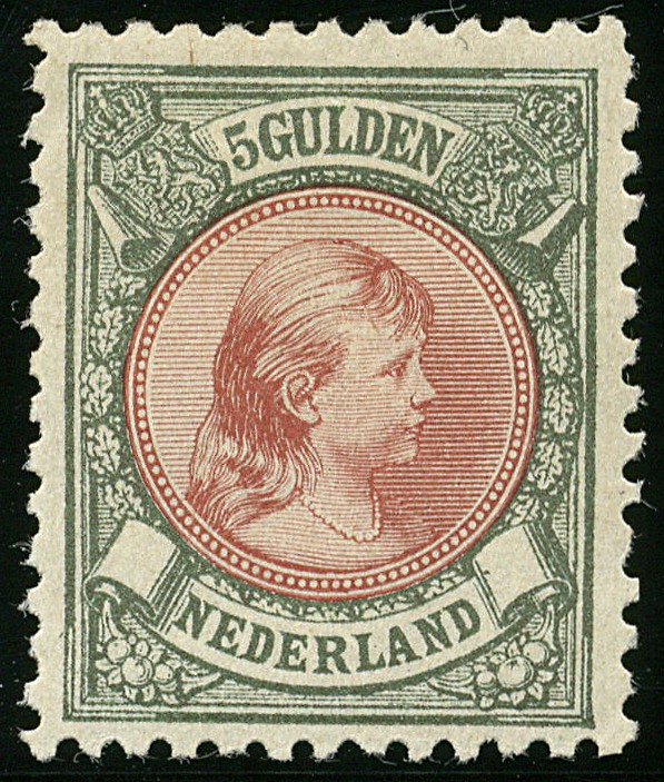48, 5 gulden bronsgroen en roodbruin, ongebruikt prachtstuk! € 1000