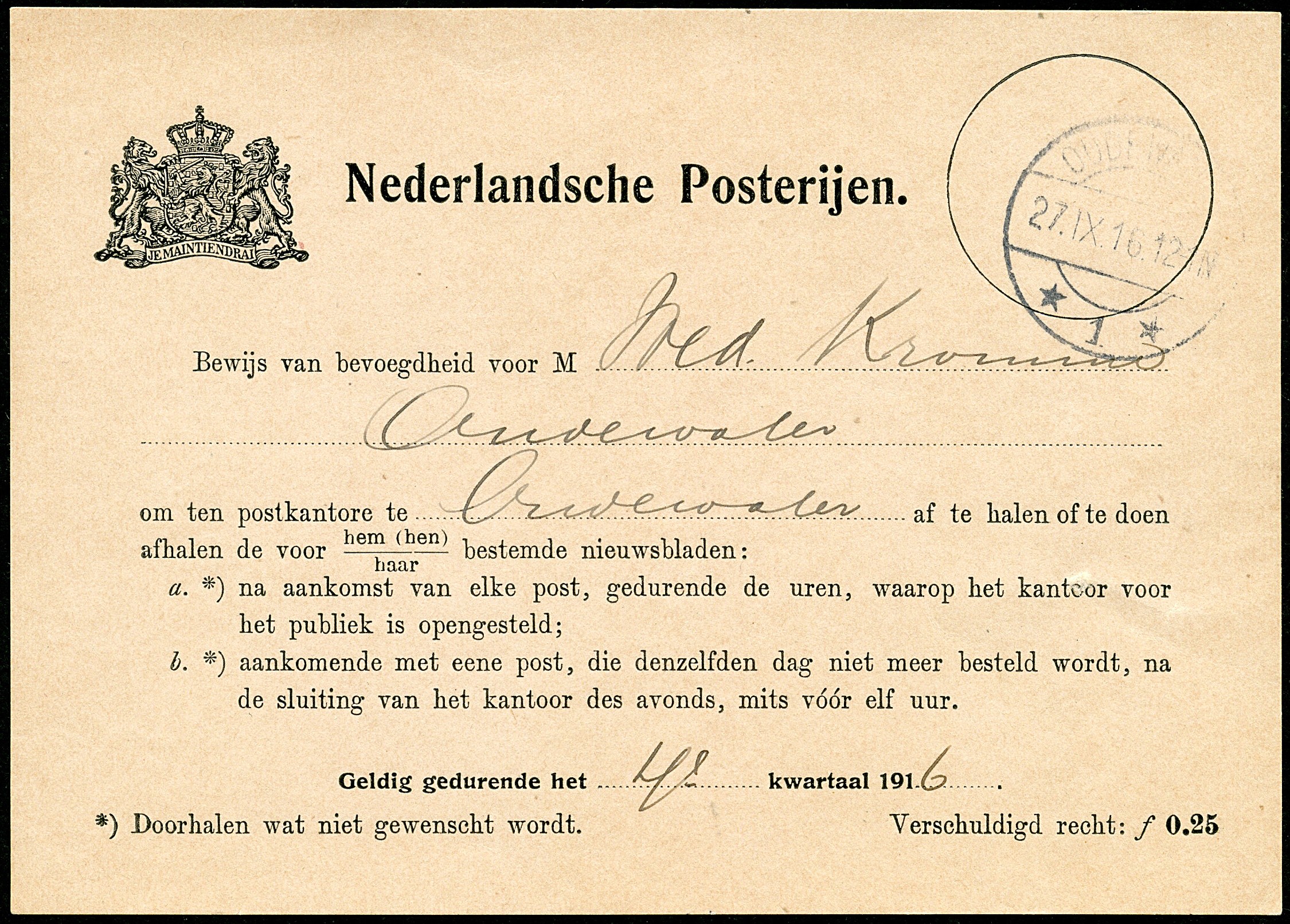 Busrechtformulier voor het afhalen van nieuwsbladen in het 4e kwartaal van 1916, verschuldigd recht fl. 0,25, type G30, afgest. Oudewater 27-9-1916. Zelden aangeboden formulier!