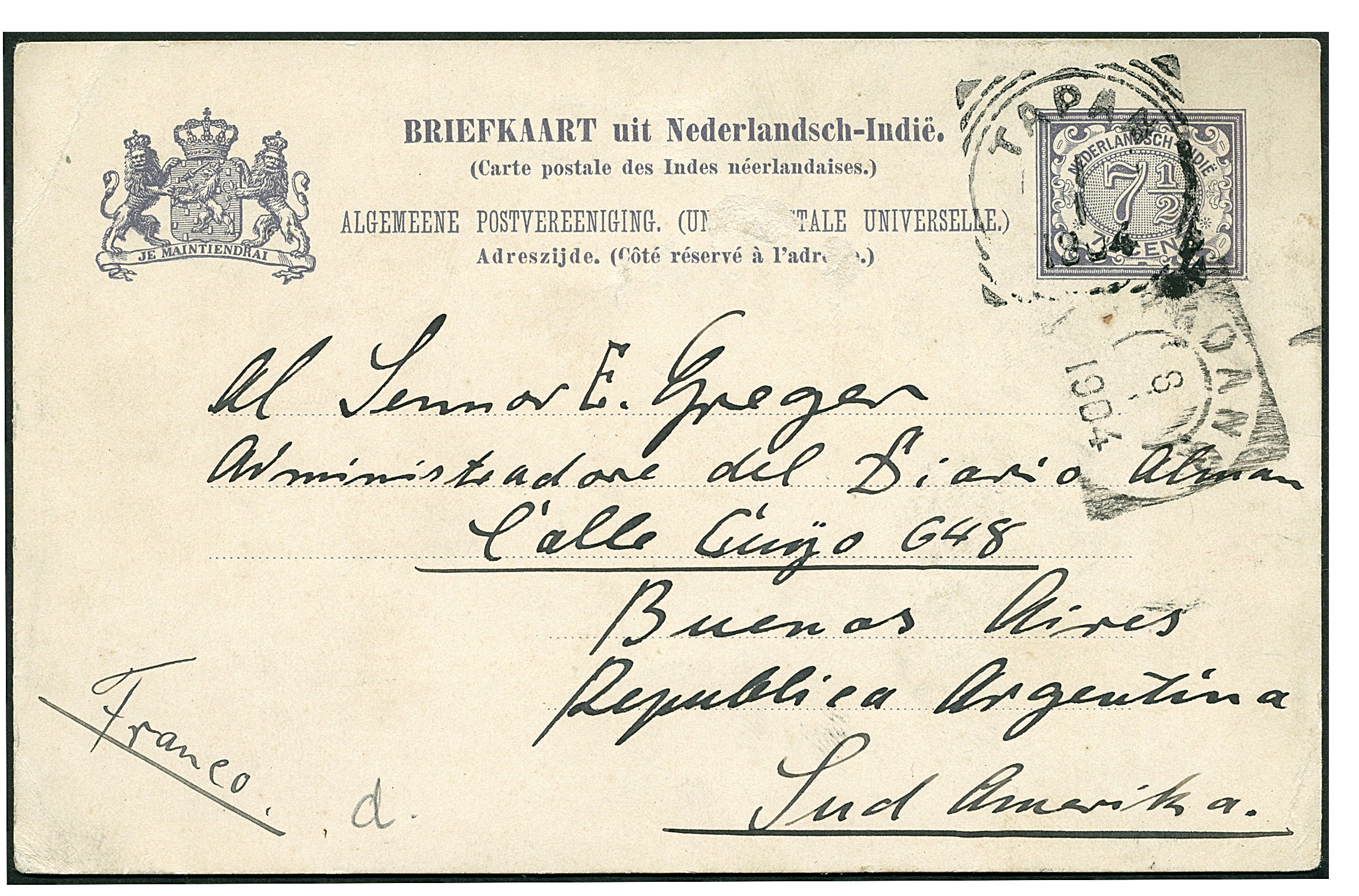 ARGENTINIË. Bk. G16 (schaafplekje) uit Sendaran Agoeng over Tapan 1-1-1904 via Padang 8-1 naar Buenos Aires