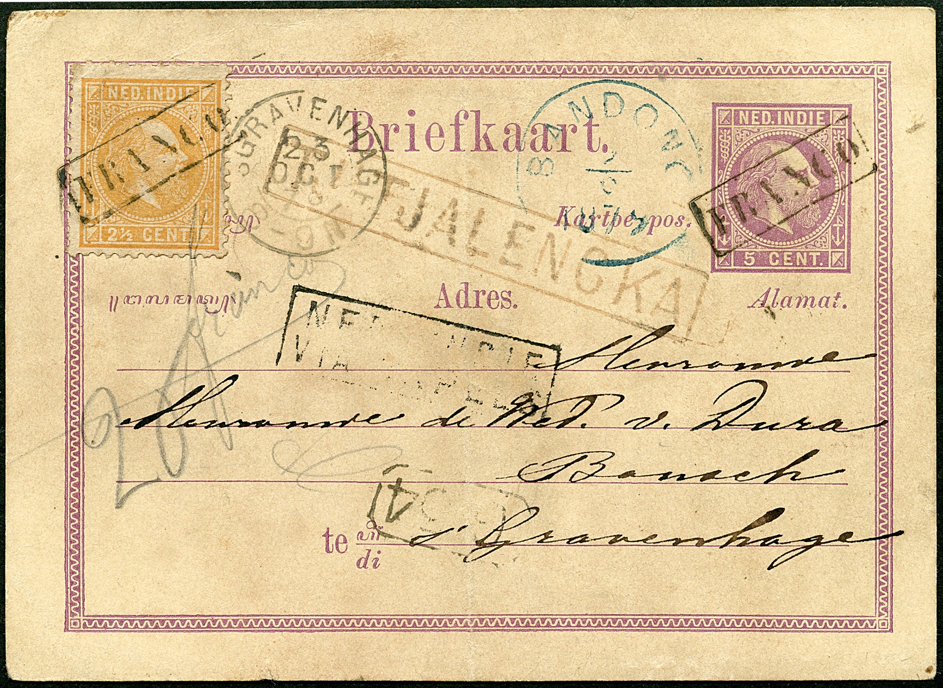 2½ Cent nr. 7F als bijfrankering op bk. G1c (gebreken) van Tjitjalengka (naamstempel in rood, Franco in zwart) over Bandong 9-9-1879 (blauw) via Napels naar 'sGravenhage 23-10. Correct briefkaarttarief