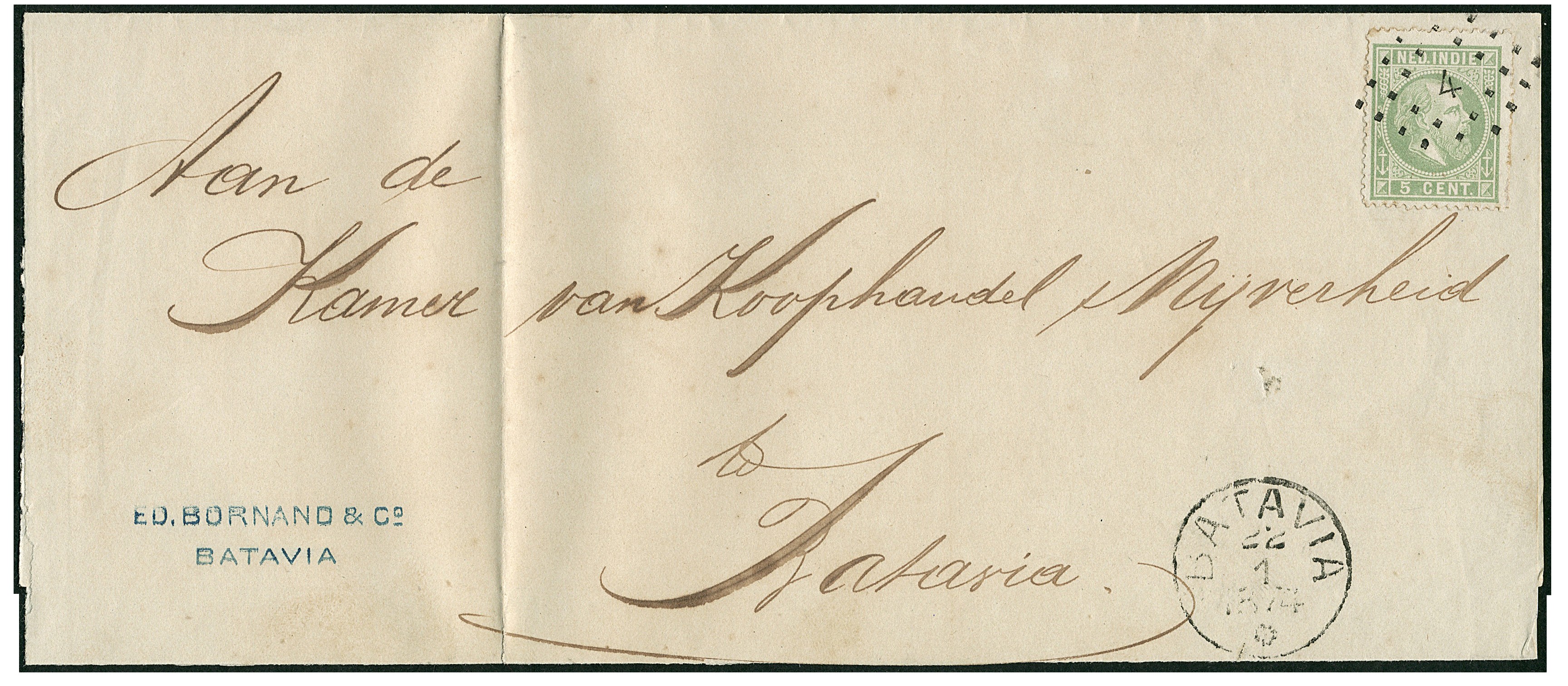 5 Cent nr. 8A op drukwerkomslag (linker deel omgevouwen) lokaal verz. te Batavia 22-1-1874. Zeer vroeg gebruik puntstempel met prachtige, scherpe afdruk en een mooi rondstempel met onder het jaartal een rozet (type Bu.R3)