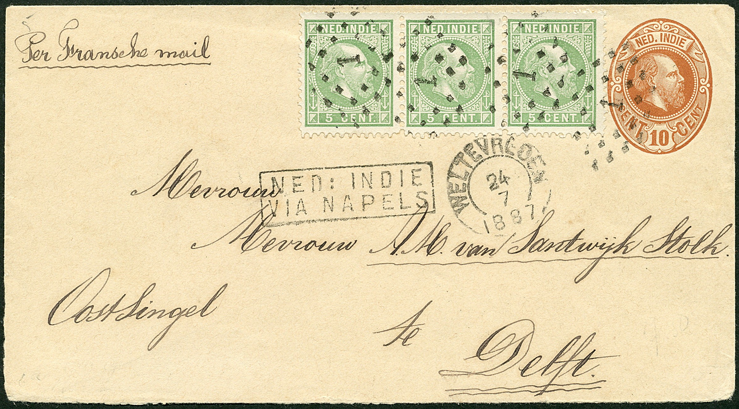 5 Cent nr. 8G in prachtstrip van drie als bijfrankering op env. G6 van Weltevreden 24-7-1887 via Napels naar Delft 23-8