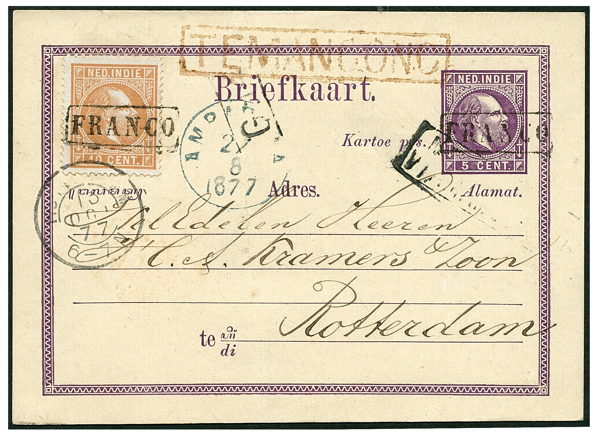 10 Cent nr. 9 als bijfrankering op bk. G1b (vouw) van TEMANGONG (naamstempel in rood, 2x Franco in zwart) over Ambarawa 27-8-1877 (blauw) per mail (slecht afgestempeld routestempel) naar Rotterdam 13-10. Zeldzaam tarief van 15 cent dat gold van 1-5-1876 tot 1-5-1877 (zie NITAR blz. 19). Afgebeeld in Bu. op blz. 26