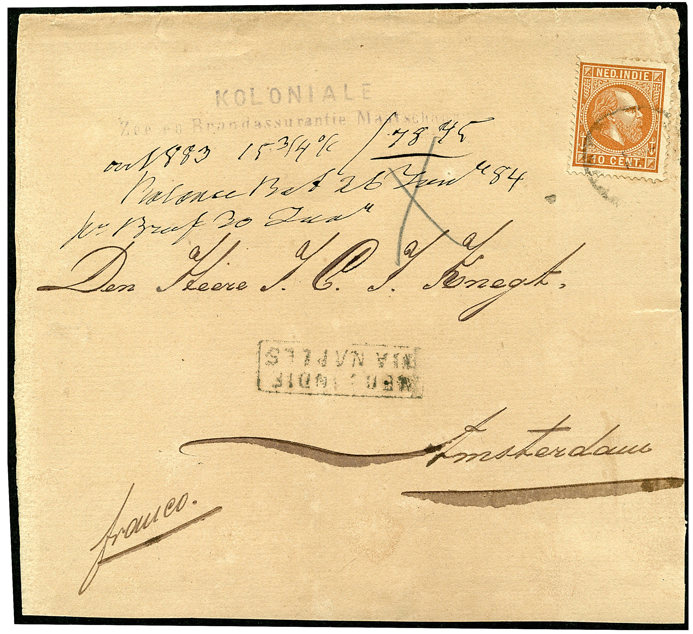 10 Cent nr. 9E op drukwerkbandje van Batavia (?) 30-1-1884 via Napels naar Amsterdam 3-3. Tarief: 5 cent per 50 gr. Op deze wijze gebruikt is de 10 cent zeldzaam op poststuk!