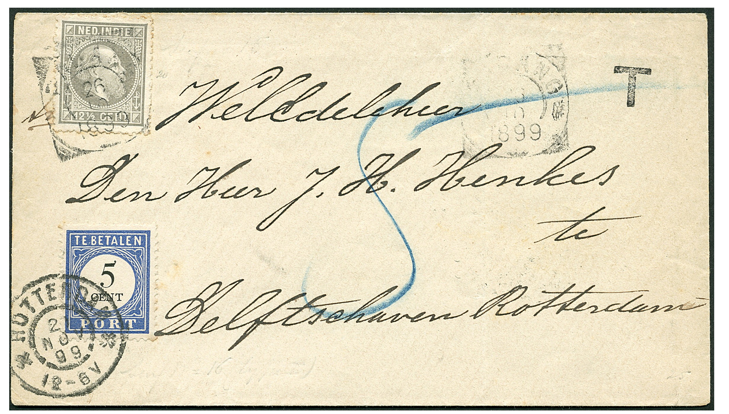 12½ Cent nr. 10H op met 2½ cent te weinig gefr. env. van Padang 26-10-1899 naar Rotterdam en daar op 21-11 met 5 cent beport