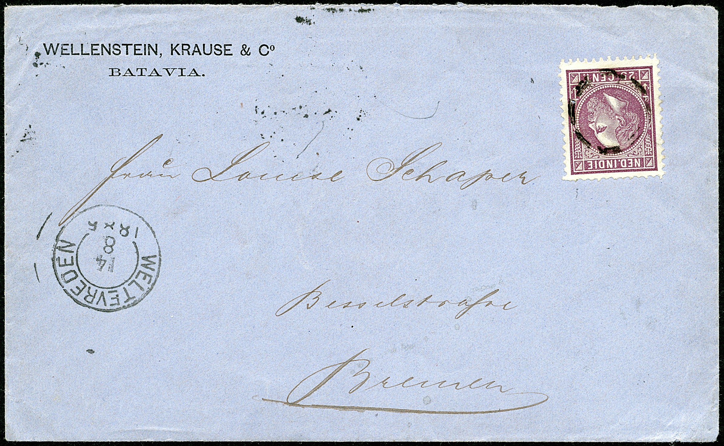 Gebroken cirkelstempel (proefstempel? noodstempel?) van Weltevreden op met 25c gefr. env. van 14-8-1885 naar Bremen 21-9. Laat gebruik van dit mysterieuze stempel (zie Bu. p.54)