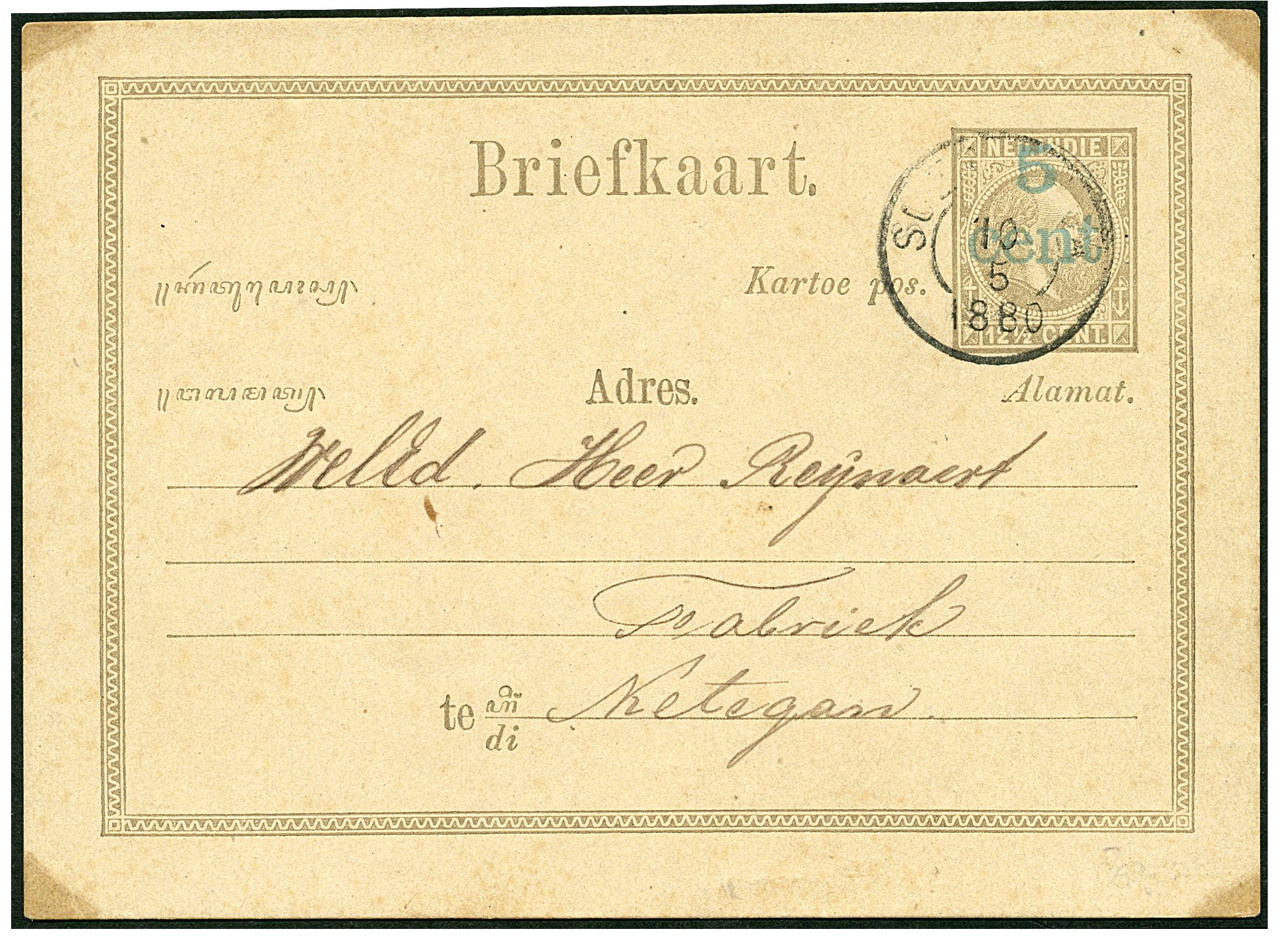 Opdruk 5 CENT blauw op 12½ cent bk. G3 (4 hoeken cellotape-sporen) van Soerabaja 10-5-1880 naar de suikerfabriek Ketegan bij Soerabaja. De tekst heeft niets filatelistisch, maar deze opdruk moet van de creatieve J.P. Moquette afkomstig zijn, die daar tevens werkzaam was. Blijkbaar door de post geaccepteerd