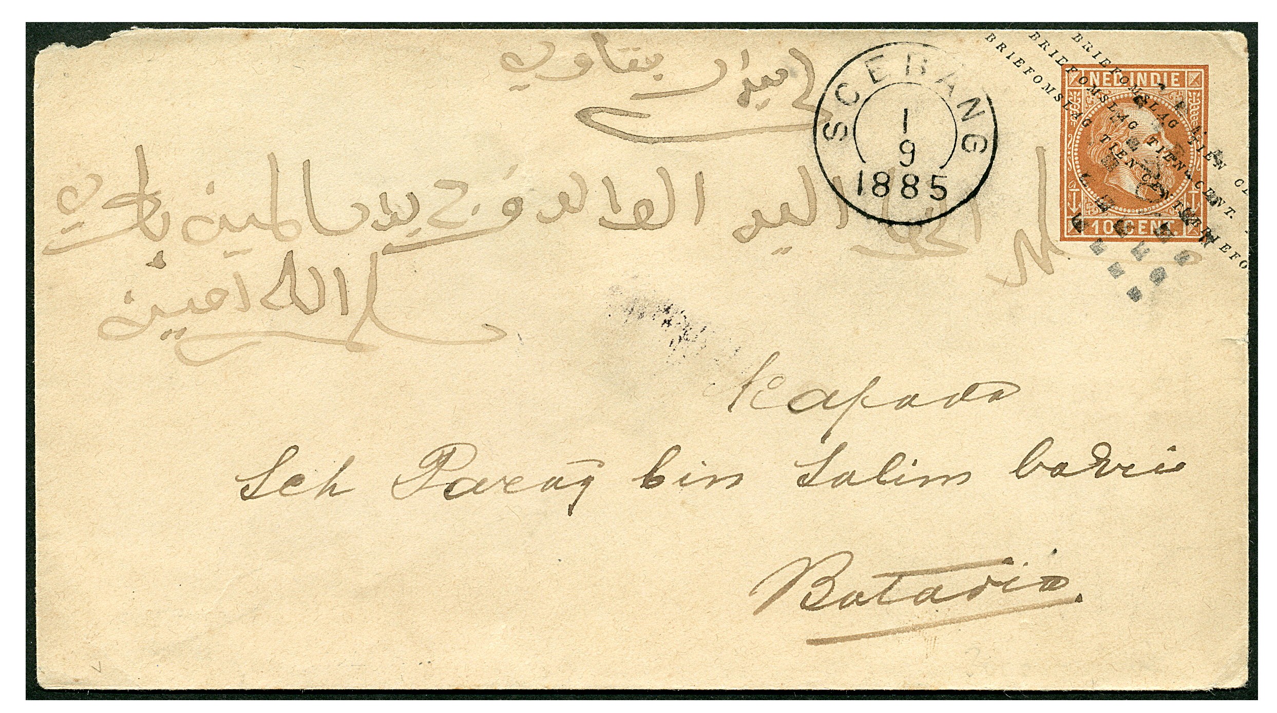 Puntstempel 104 op env. G5 (az. deel klep weg) van SOEBANG 1-9-1885 via Poerwakarta en Weltevreden naar Batavia 2-9-1885. Uitermate zeldzaam en ons slechts 5 ex. bekend. Cert. Van Dieten (2021)