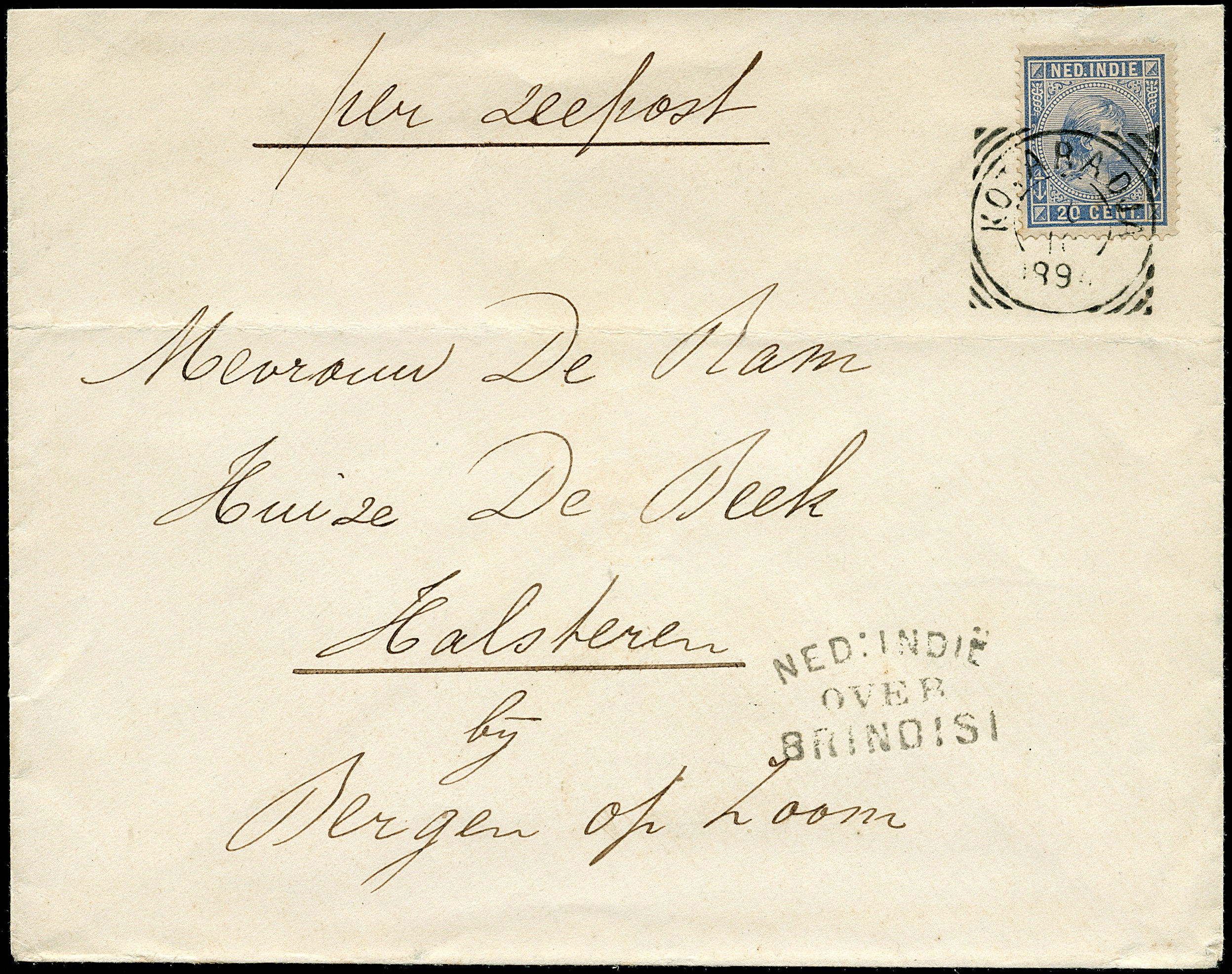 20 Cent als enkelfrankering op env. (hor. vouw) van Kotaradja 30-10-1894 over de N.I.Postagent Penang 2-11 naar Halsteren. De afzender schreef ´per zeepost´, toch per mail ´over Brindisi´. De brief is gefrankeerd volgens dubbel tarief per zeepost (zie: NITAR p.100)