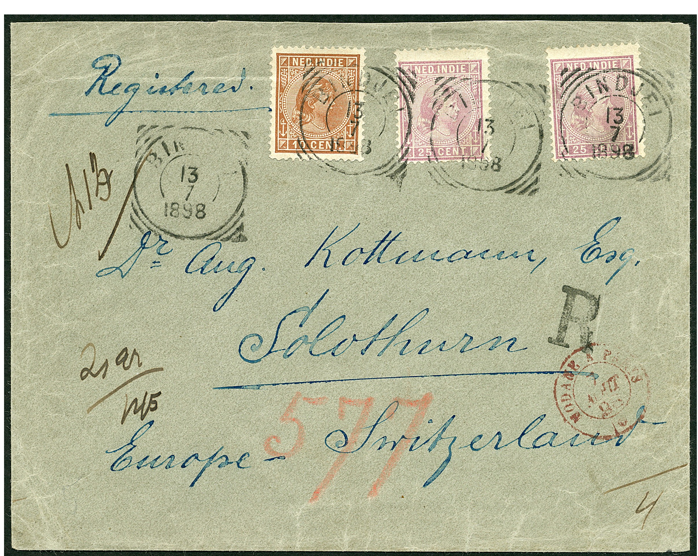 25 Cent (2x) en 10 cent op env. van 21 gr. van Bindjei 13-7-1898 aangetekend (stempel R) over Medan 13-7 en de N.I.Postagent Penang 15-7 via het traject Modane à Paris 7-8 naar Solothurn (CH) 8-8
