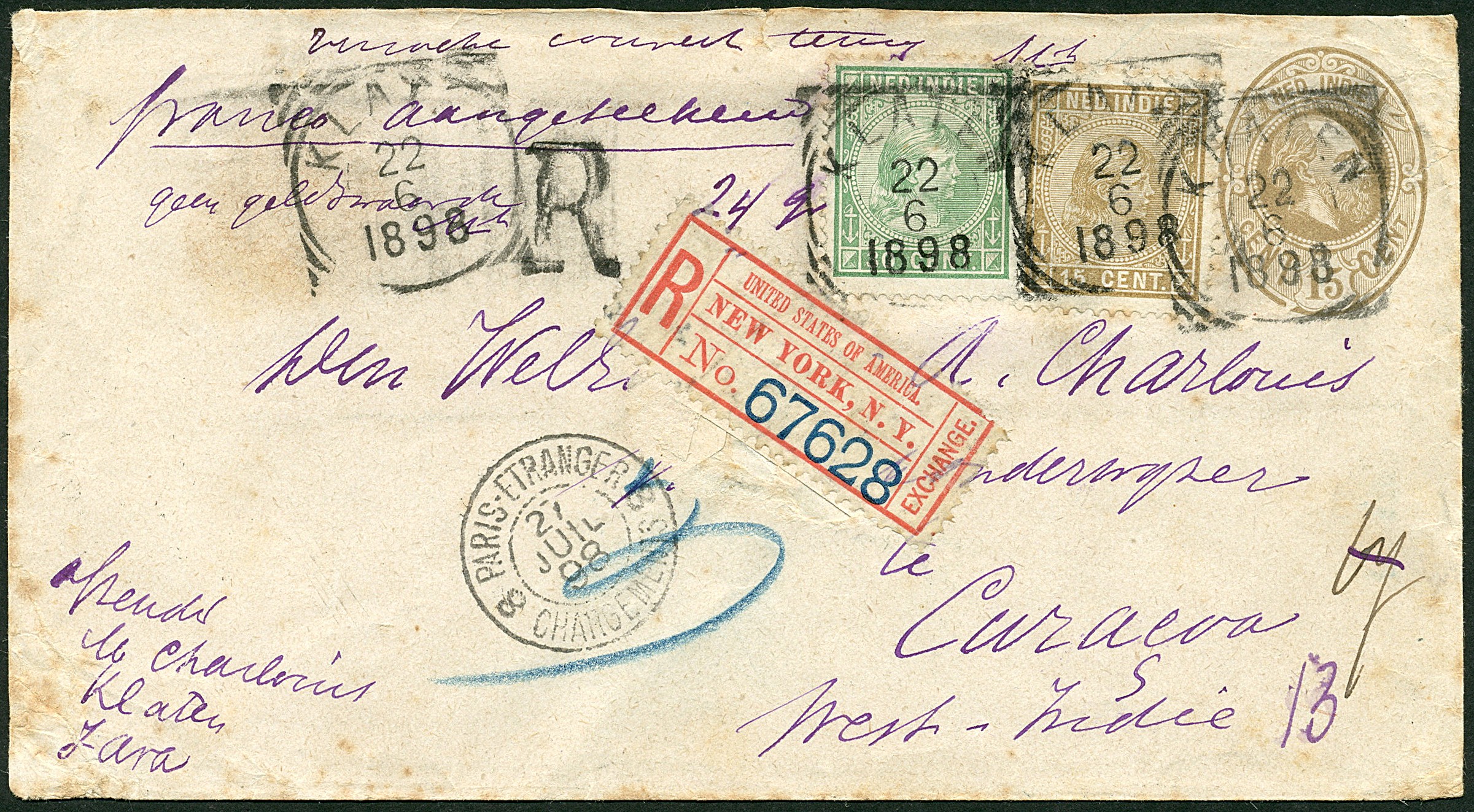 30 en 15 Cent op env. G8 van 24 gr. van Klaten 22-6-1898 aangetekend over Weltevreden 23-6 en Parijs 27-7 via New York 8-8, daar voorzien van R-strookje, naar een onderwijzer en naamgenoot te Curaçao 22-8. Post van Indië naar Curaçao is schaars!