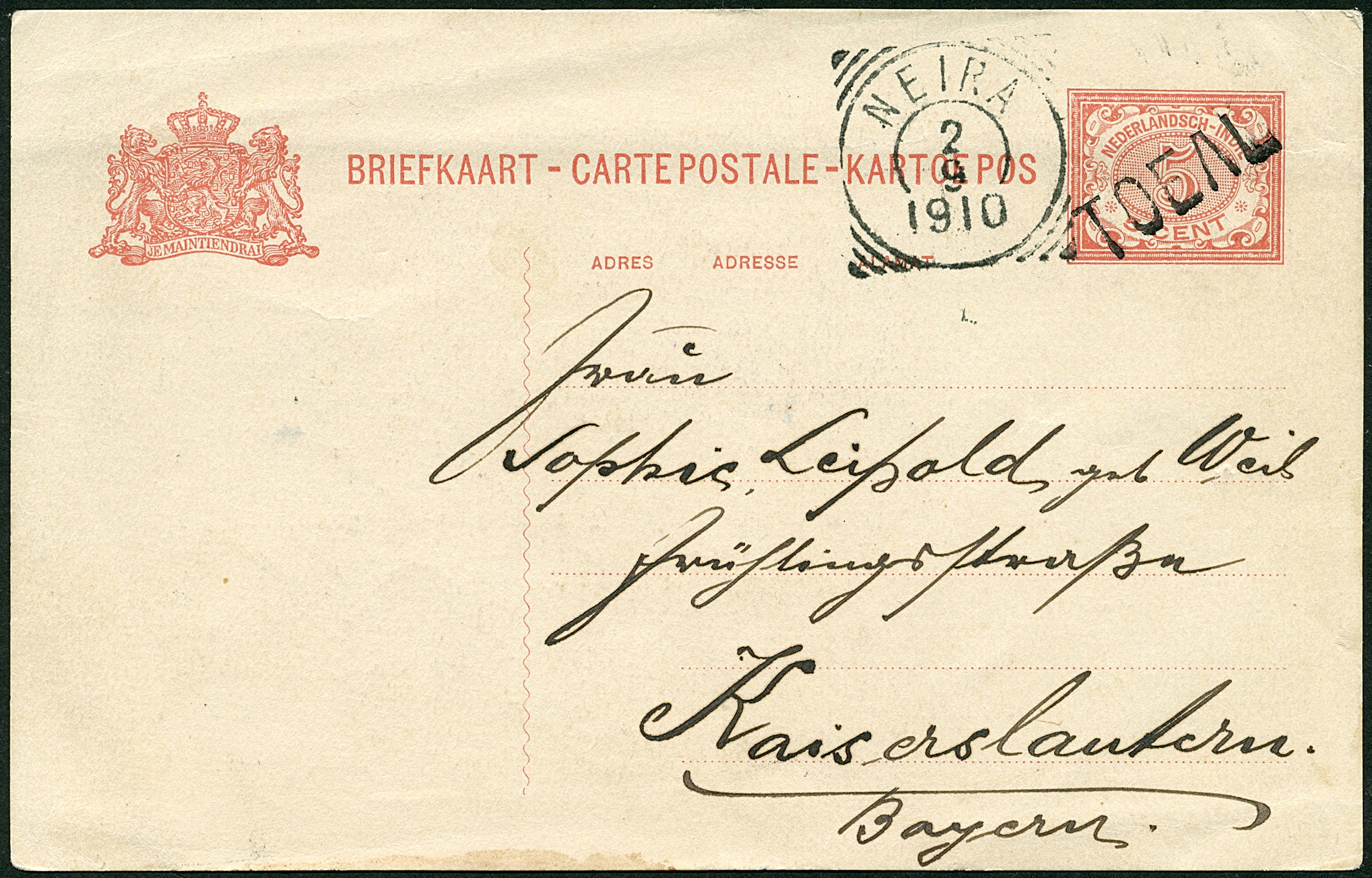 Bk. G21 van TOEAL over Neira 2-9-1910 naar Beieren (L, SvL 250)