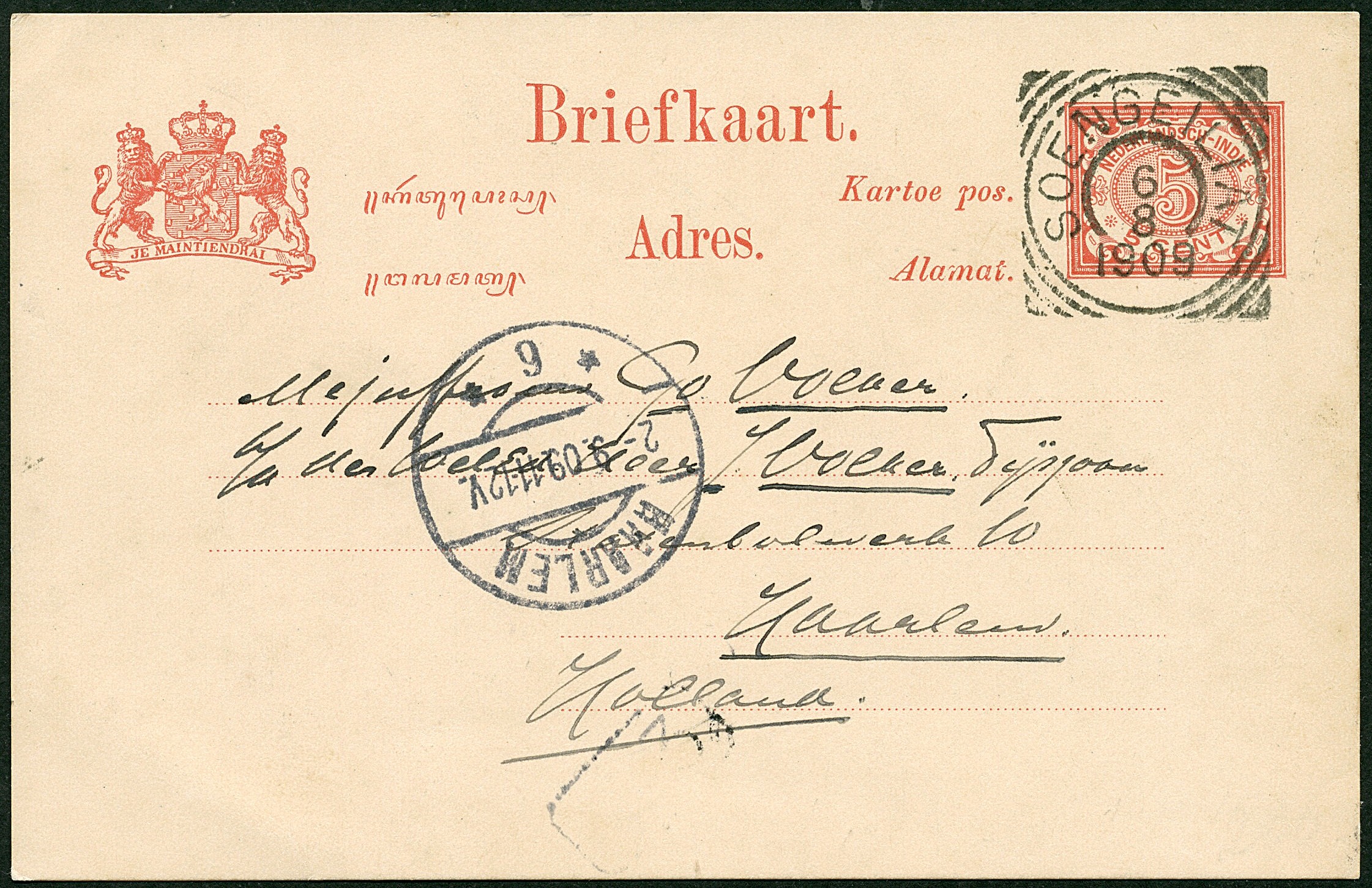Vierkantstempel SOENGEILIAT 6-8-1909 op bk. G14 naar Haarlem 2-9-1909. Schitterende kwaliteit van dit schaarse stempel! (SvL 300)