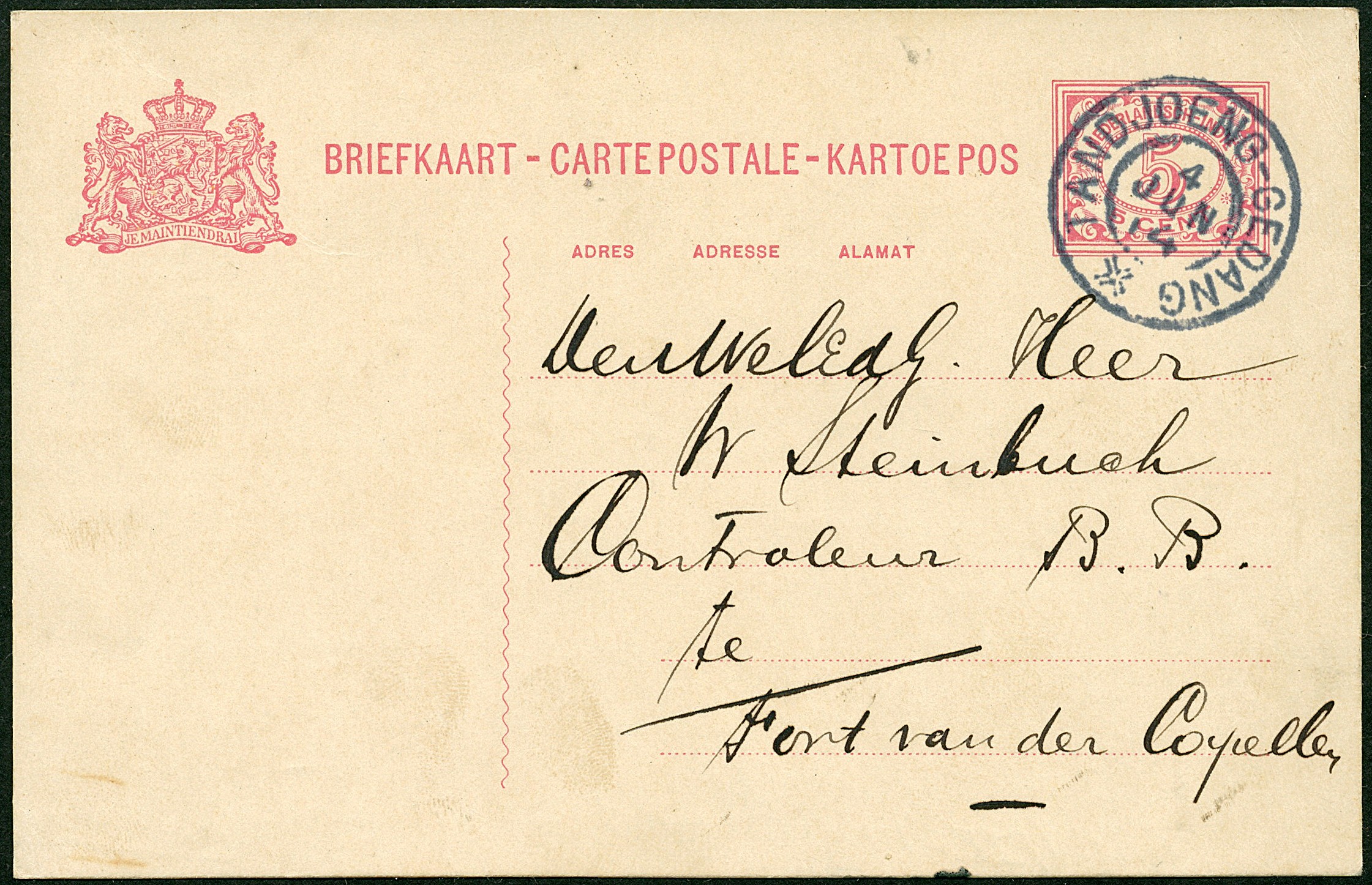 Grootrond TANDJOENG-GEDANG 4-6-1914 op bk. G23 naar Fort van der Capellen. Luxe afstempeling van dit schaarse stempel (SvL 300)