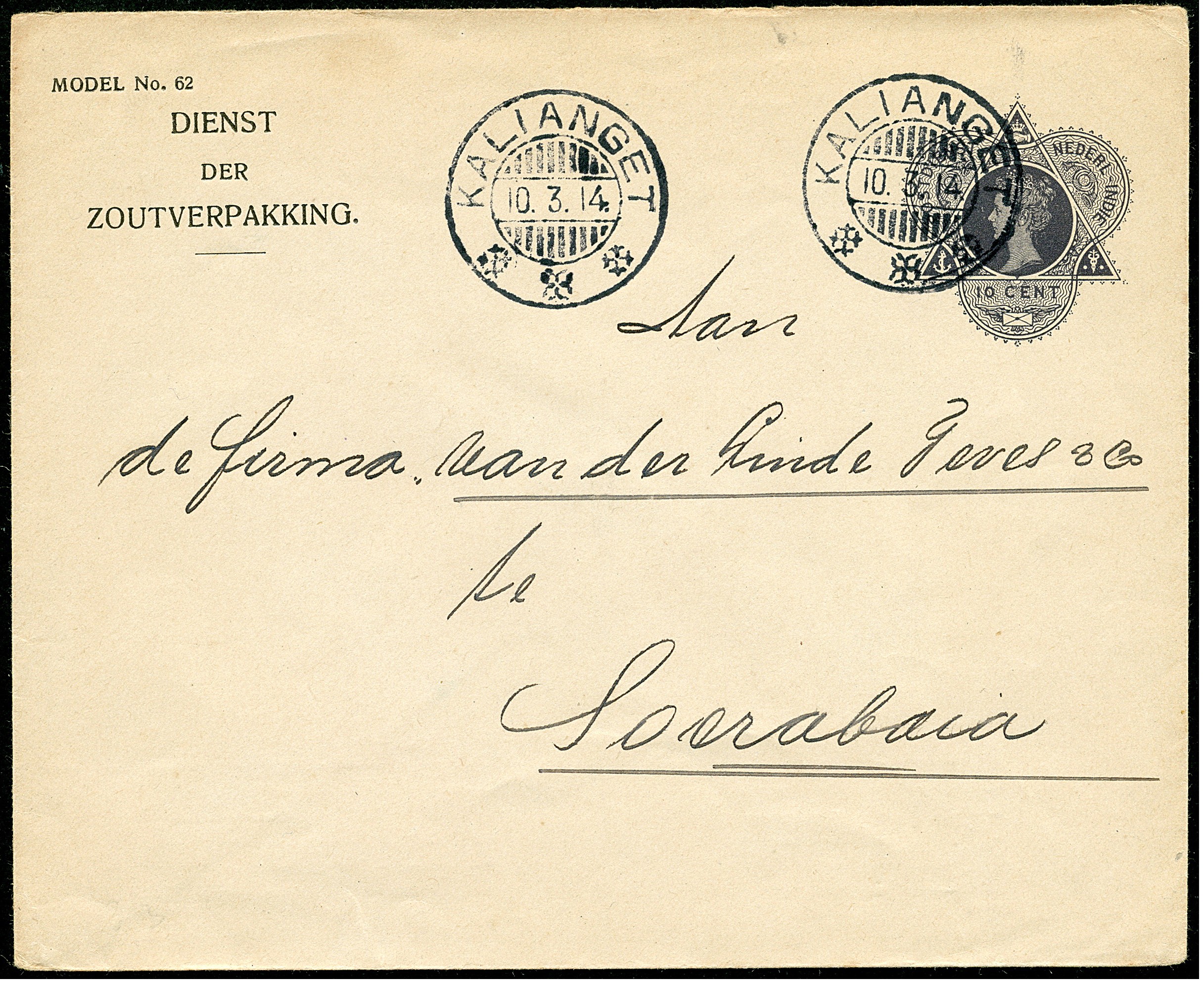 Env. G33 particulier bijgedrukt 'Model No. 62 / Dienst/der/Zoutverpakking' van Kalianget 10-3-1914 (Madoera) naar Soerabaja 11-3, met twee luxe afst. type kortebalk met 3 versierde Maltezer kruizen
