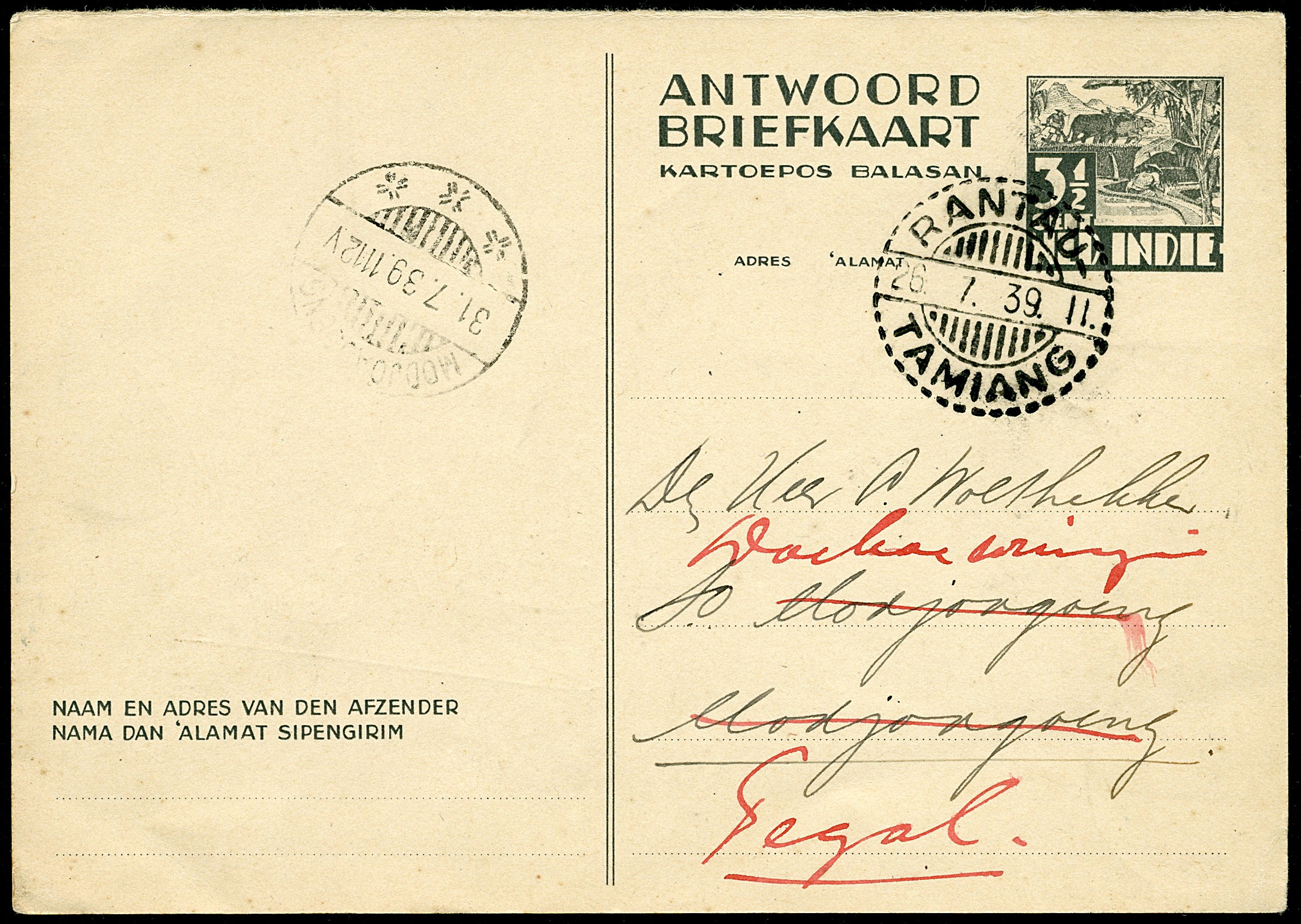 Bk. G64 A-kaart van Rantau-/Tamiang 26-7-1939 naar Modjoagoeng, op 31-7 doorgezonden naar Tegal. Zeldzaam (SvL R)