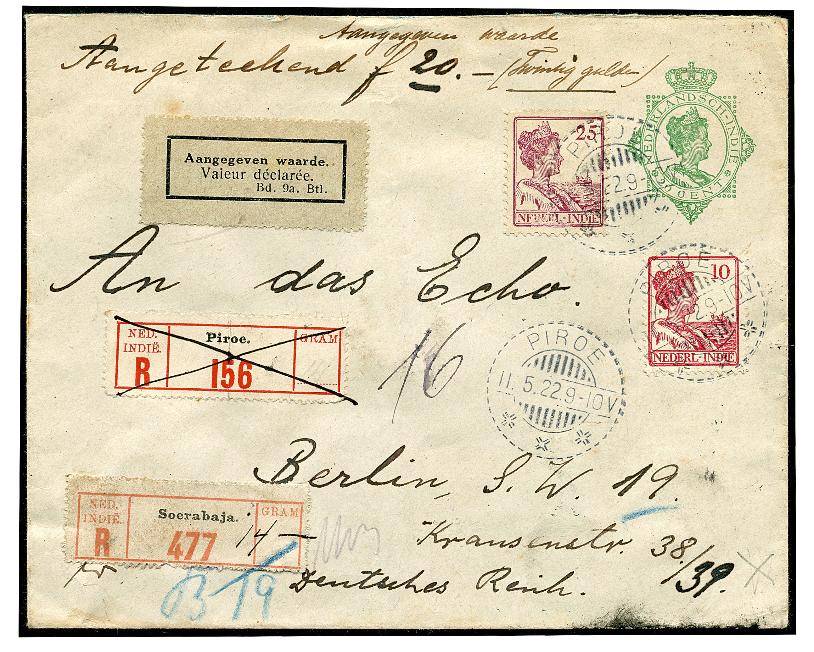 Waardezending. Env. G44 van 14 gr. bijgefr. met 10c + 25c met een aangegeven waarde van fl. 20,00 van Piroe 11-5-1922 over Amboina, Soerabaja en Genua naar Berlijn 29-6. Het R-strookje van Piroe is doorgehaald, te Soerabaja is weer een R-strookje geplakt