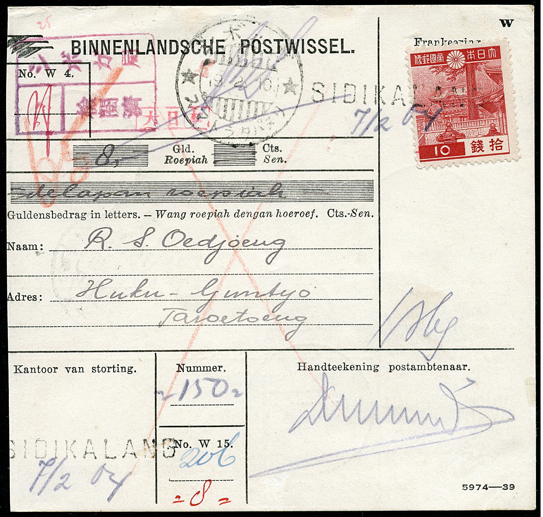 Sumatra. Tapanoeli. 10 Sen Japanese stamp as a single franking on censored money order Bu.JF1a with red framed Dai Ni Hon overprint cancelled with straight-line SIDIKALANG with written date 7/2 04 via Sibolga 19.2.10 to Taroetoeng 19.2.11. Straight-line name cancel of Sidikalang on postal entire is very rare (see: vNV, page 306)