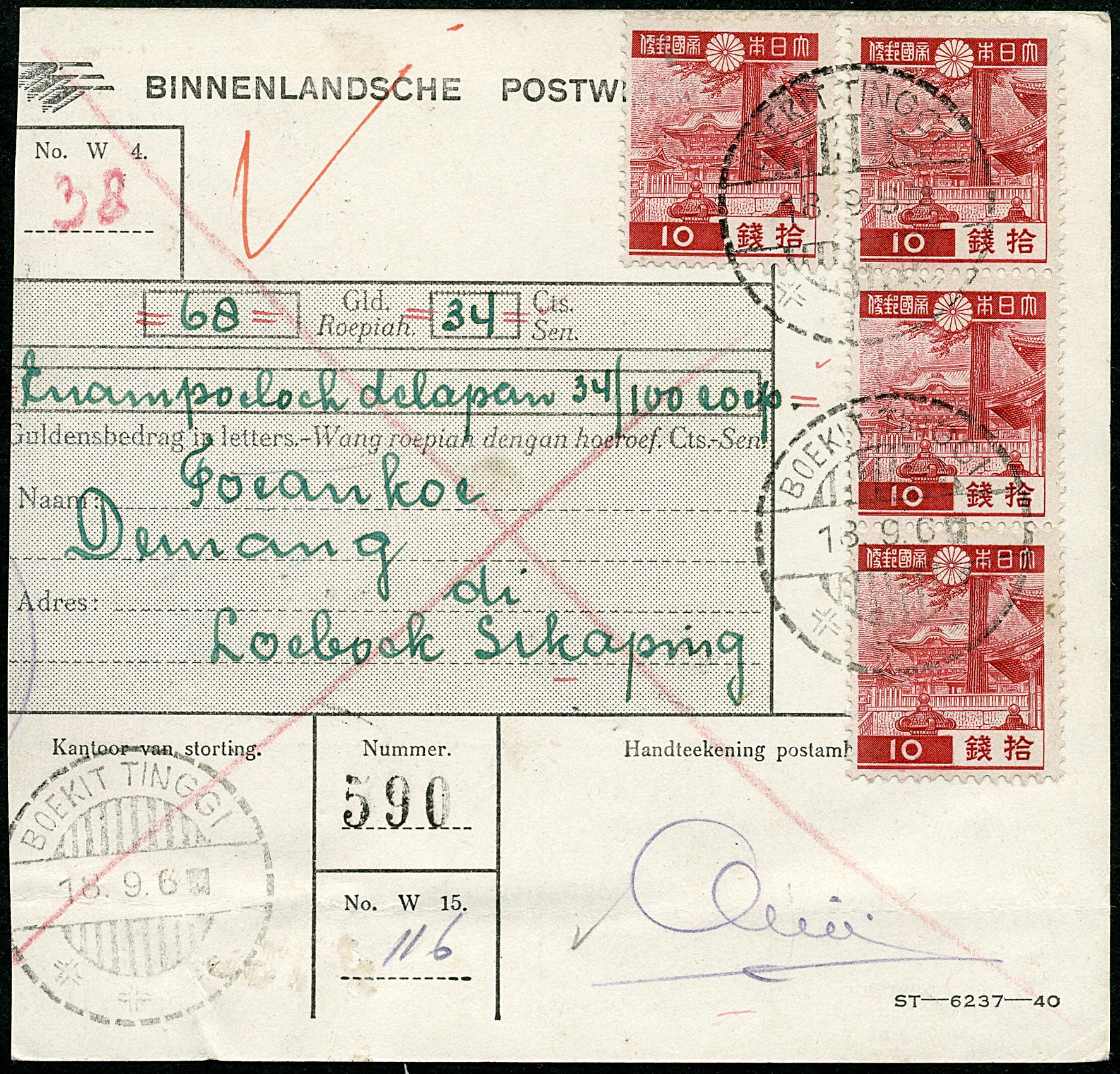 Sumatra. West Coast. 10 sen Japanese stamp (1 single and strip of 3) on money order Bu.JF1a from Boekit Tinggi 18.9.6 to Loeboek-/Sikaping 18.9.7