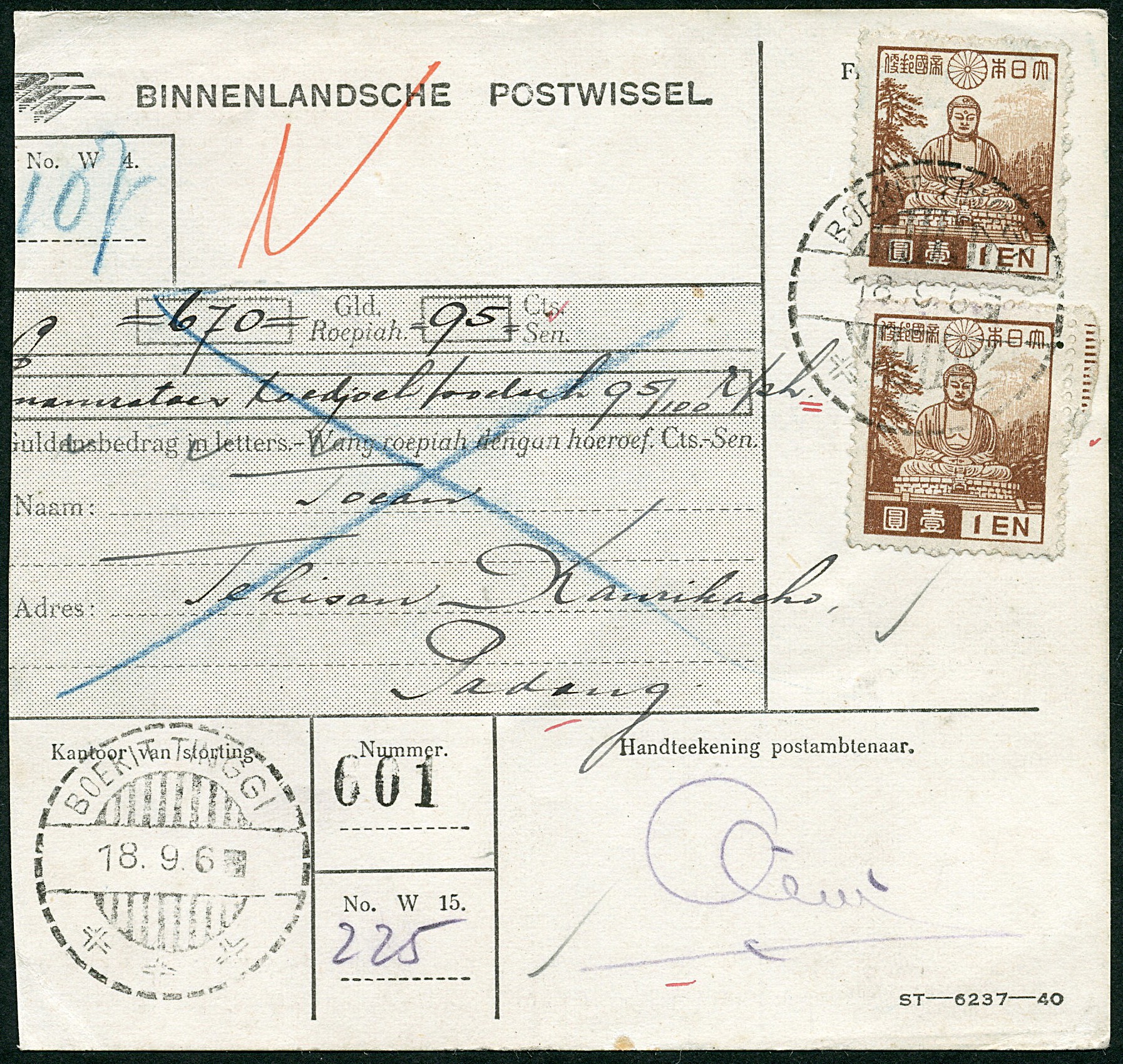 Sumatra. West Coast. 1 Yen Japanese stamp (2x) on money order Bu.JF1a from Boekit Tinggi 18.9.6 to Padang 18.9.8, backstamped usual cds and, most unusual, a roller cancel with straight lines (see: vNV page 26, type 081)