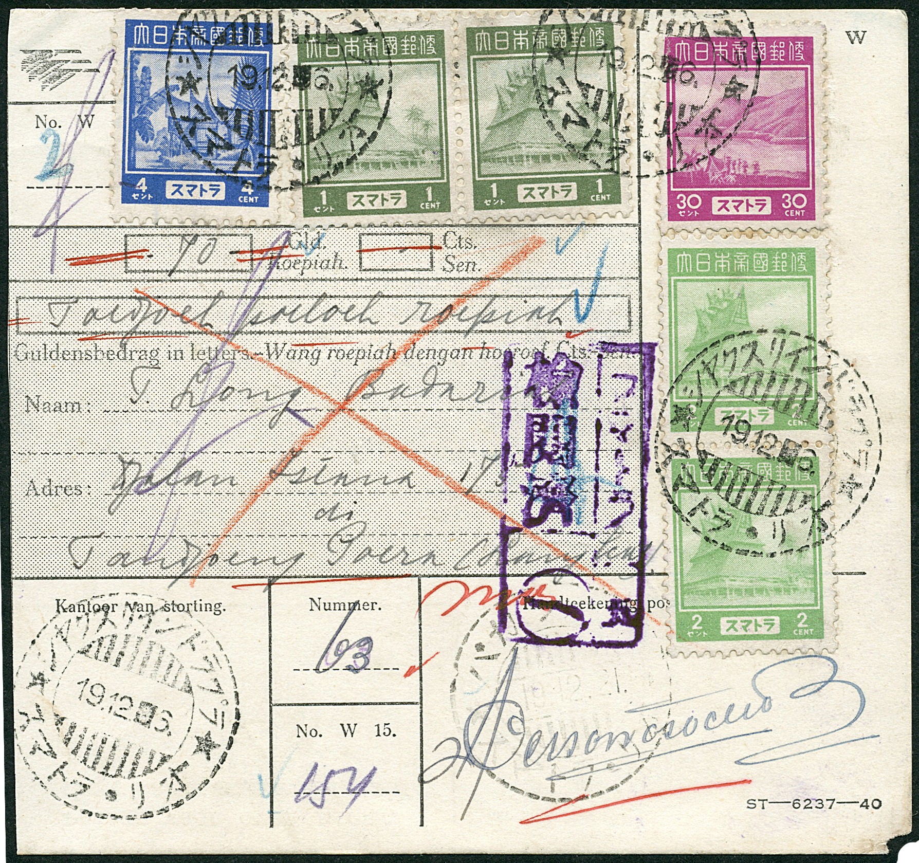 Sumatra. Riouw. Definitive issue 1 cent in pair, 2 cent in pair, 4 cent and 30 cent on censored M.O. from Siaksriindrapoera 19.12.6 to Tandjongpoera 19.12.31. Wonderful franking for transferring 70 guilders