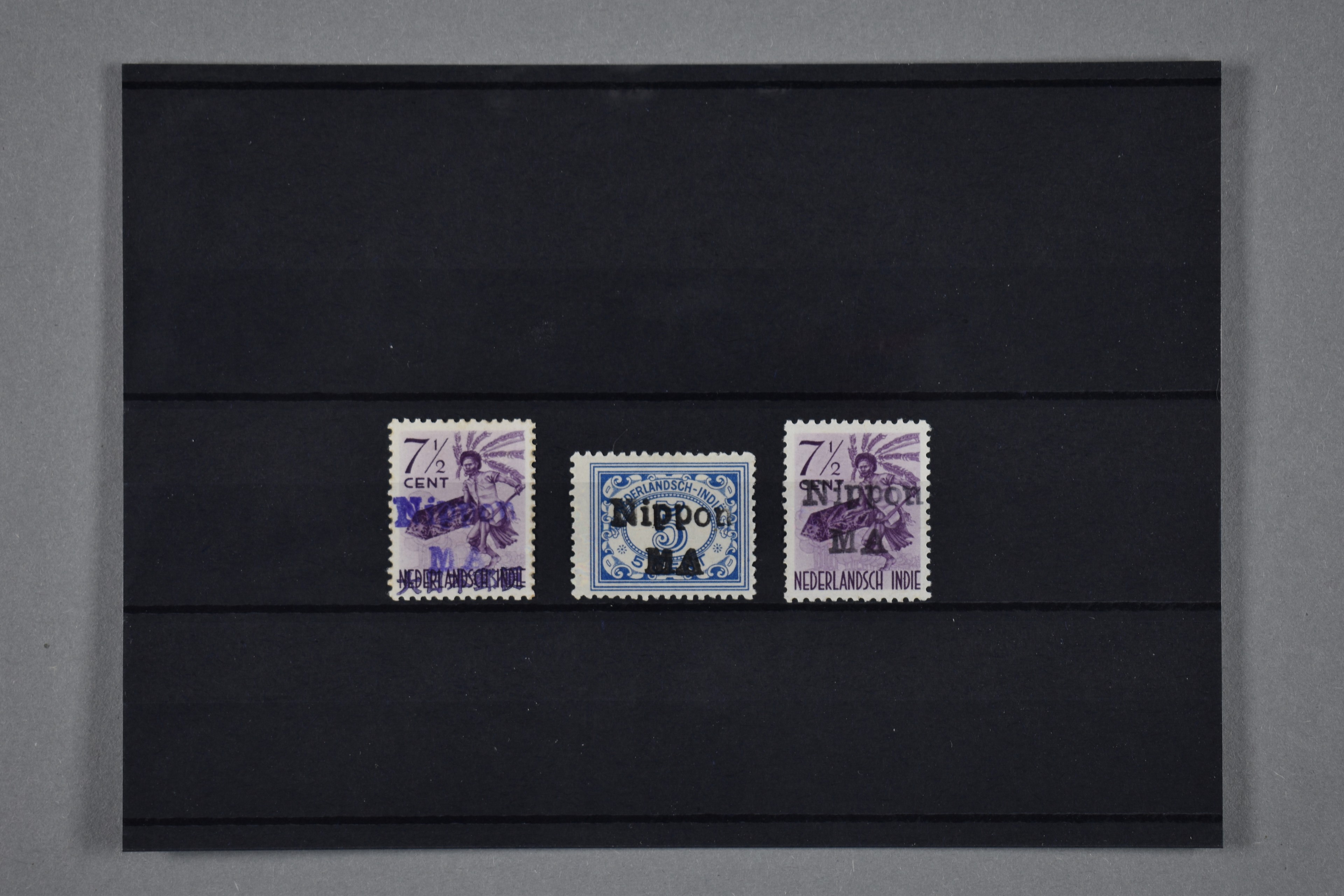 Sumatra. Djambi. Black overprint Nippon/MA on 5 cent Numeral and 7½ cent Dancer nos. 421z-42 and 421z-71 (not recorded), and violet overprint Nippon/MA in combination with violet overprint Dai Ni Hon Yubin no. 871v/421v-71, all unused