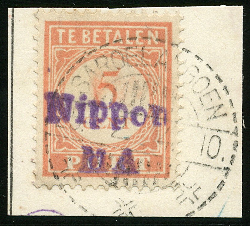 Sumatra. Djambi. 5 Cent postage due with violet overprint Nippon/MA no. 421v-80a on piece, cancelled Saroelangoen