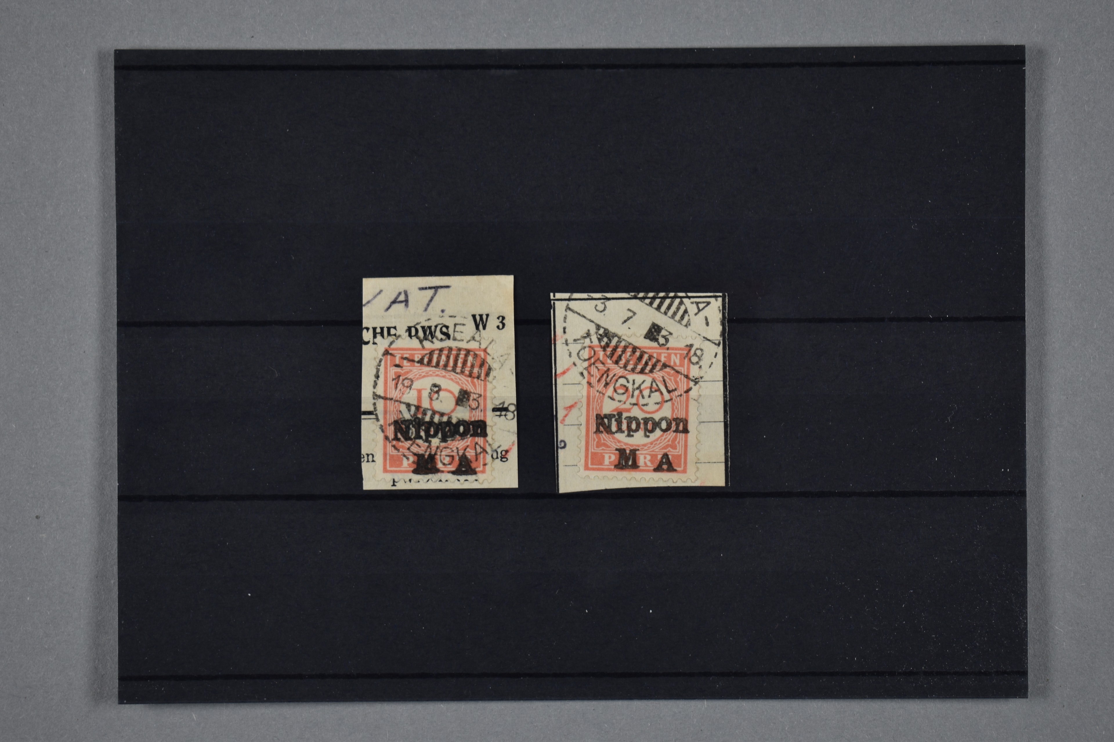 Sumatra. Djambi. 10 and 20 Cent postage due with black overprint Nippon/MA nos. 422z-82a and 84a, both on piece cancelled Koeala-/Toengkal