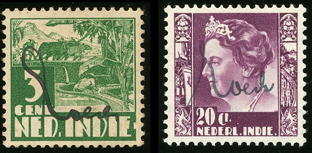 Sumatra. Palembang. Signature of postmaster Roesli in bluish black ink, used locally in Pagaralam, on 3 and 20 cent Kreisler nos. 514z-18b and 27b, unused
