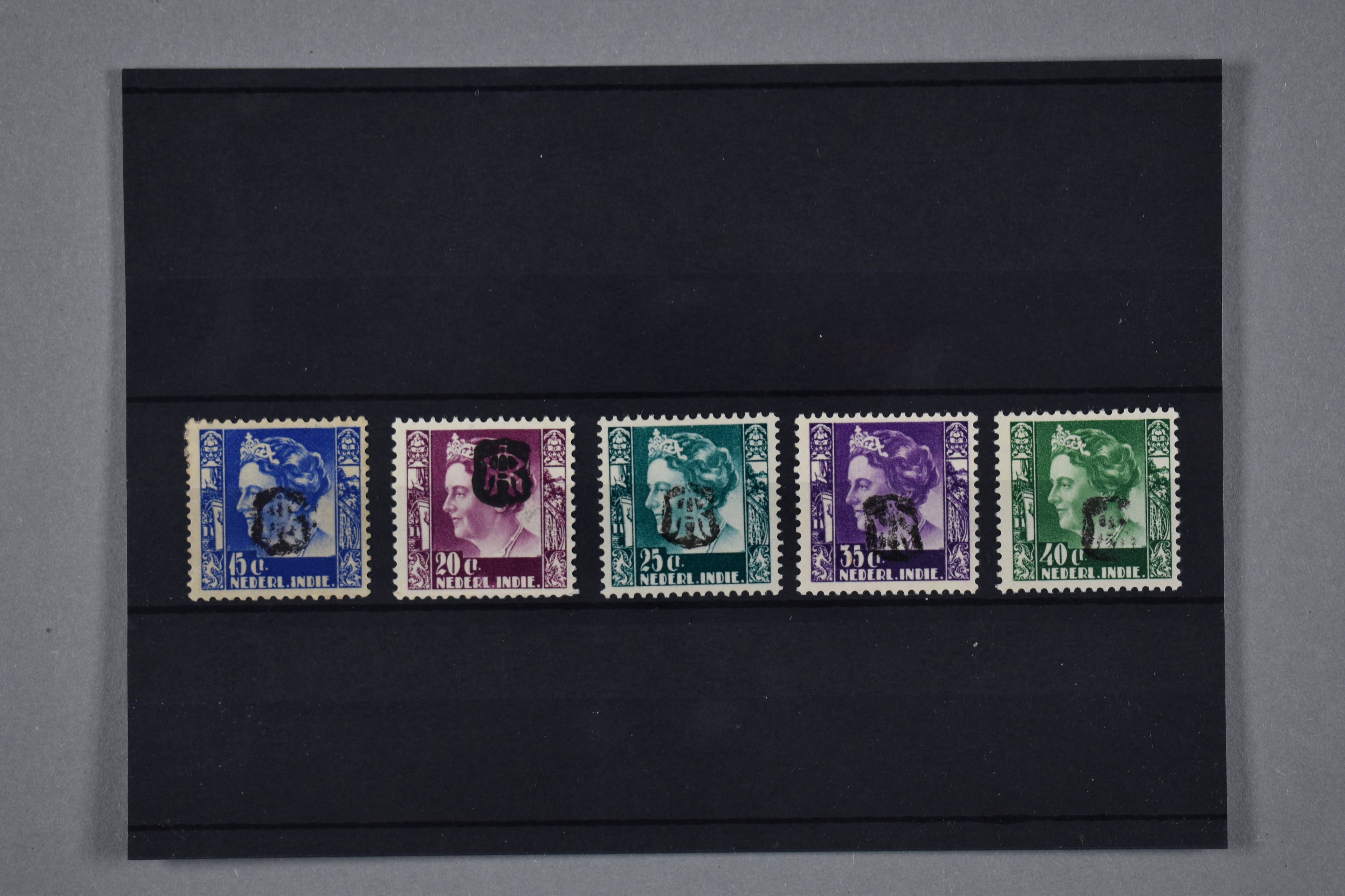 Sumatra. Palembang. Signet ring overprint AR of postmaster Arifin in black, used locally in Loeboek Linggau, on 15, 20, 25, 35 and 40 cent Kreisler nos. 521z-26a (not listed), 27b, 28a, 31b and 32b, all unused and 20, 35 and 40 cent signed Boekema