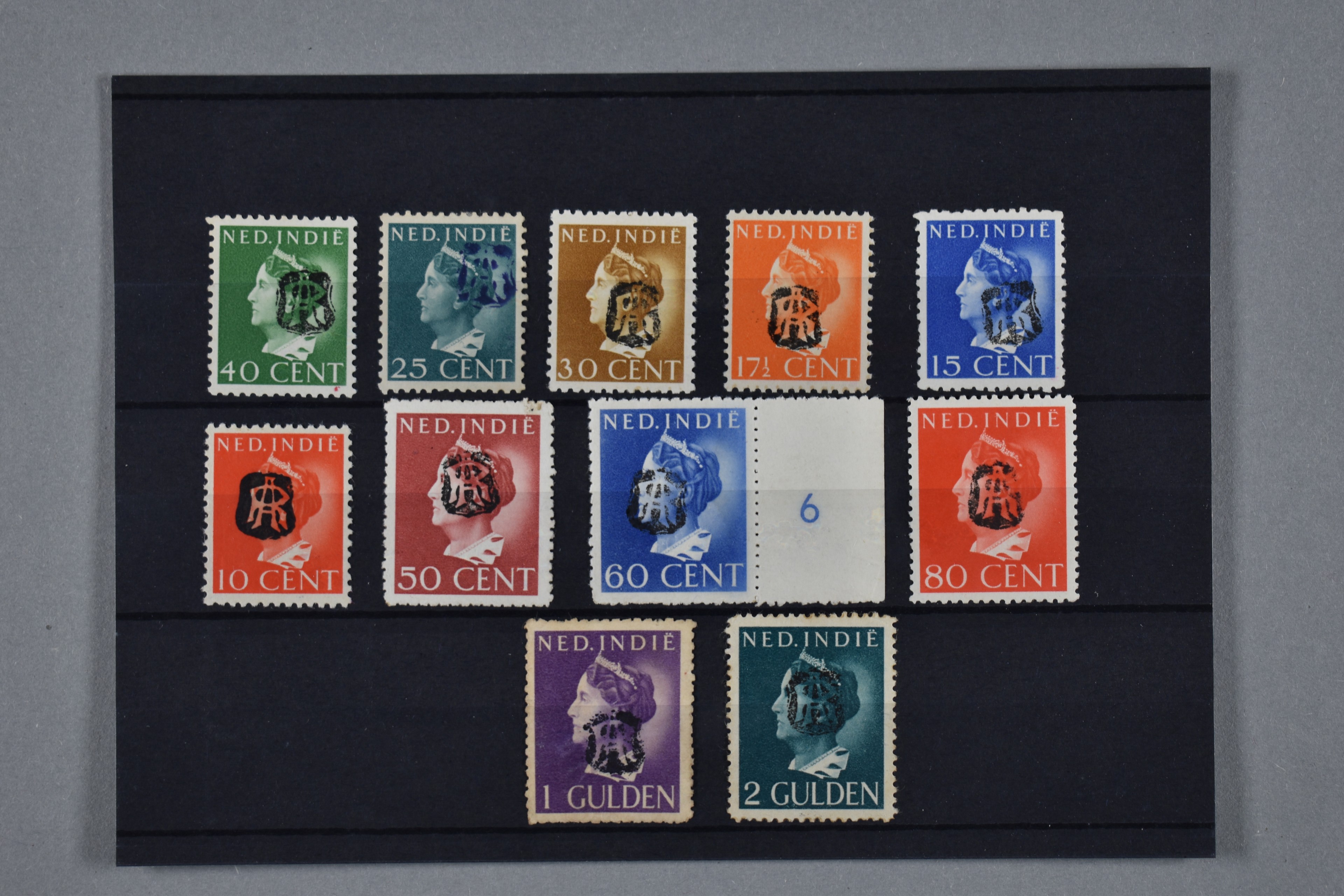 Sumatra. Palembang. Signet ring overprint AR of postmaster Arifin in black, used locally in Loeboek Linggau, on 10, 15, 17½, 25, 30, 40, 50, 60 and 80 cent and 1 and 2 gulden nos. 521z-43II, 44/50, 51k, 52k, 53g, 54k and 55g. All unused, the 25 cent has a violet overprint, some signed Boekema