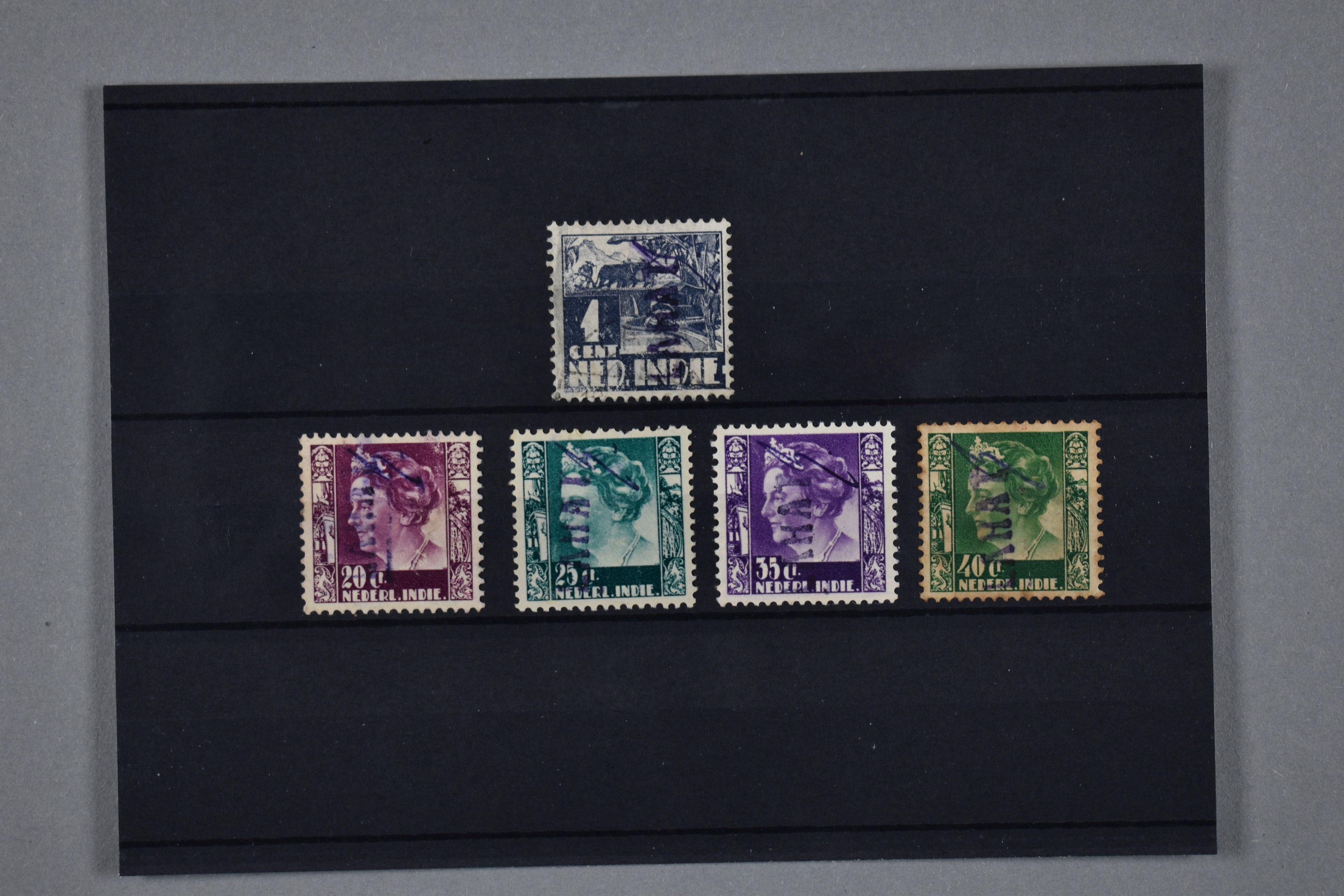 Sumatra. Palembang. Place-name overprint LAHAT in violet in combination with the initial of postmaster Pielaat in bluish black, used locally in Lahat, on 1, 20, 25, 35 and 40 cent Kreisler nos. 544v-15b, 27b, 28a (perf missing), 31b and 32b (stained), unused except the 1 cent which is used, 20 cent signed Boekema