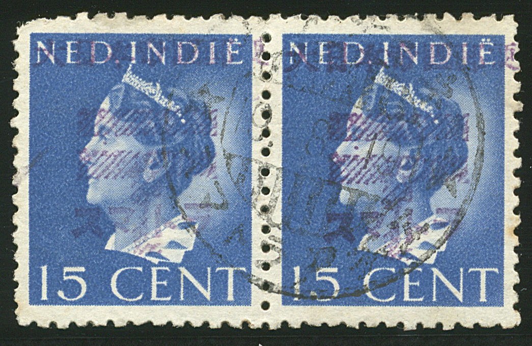 Sumatra. General Printings. 15 Cent Van Konijnenburg with violet handstamped T-overprint no. 912v-44 in pair (left stamp corner perf missing), cancelled Koetatjane 19.8.19. The only pair of this rare stamp recorded. Cert. Van Dieten (2019)