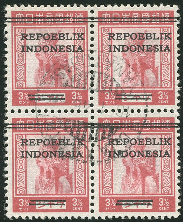 General. 3½ Cent definitive issue with machine overprint REPOEBLIK/INDONESIA KPI.J10 in block of four, cancelled Djakarta-/Yamatobasi 16.1.46