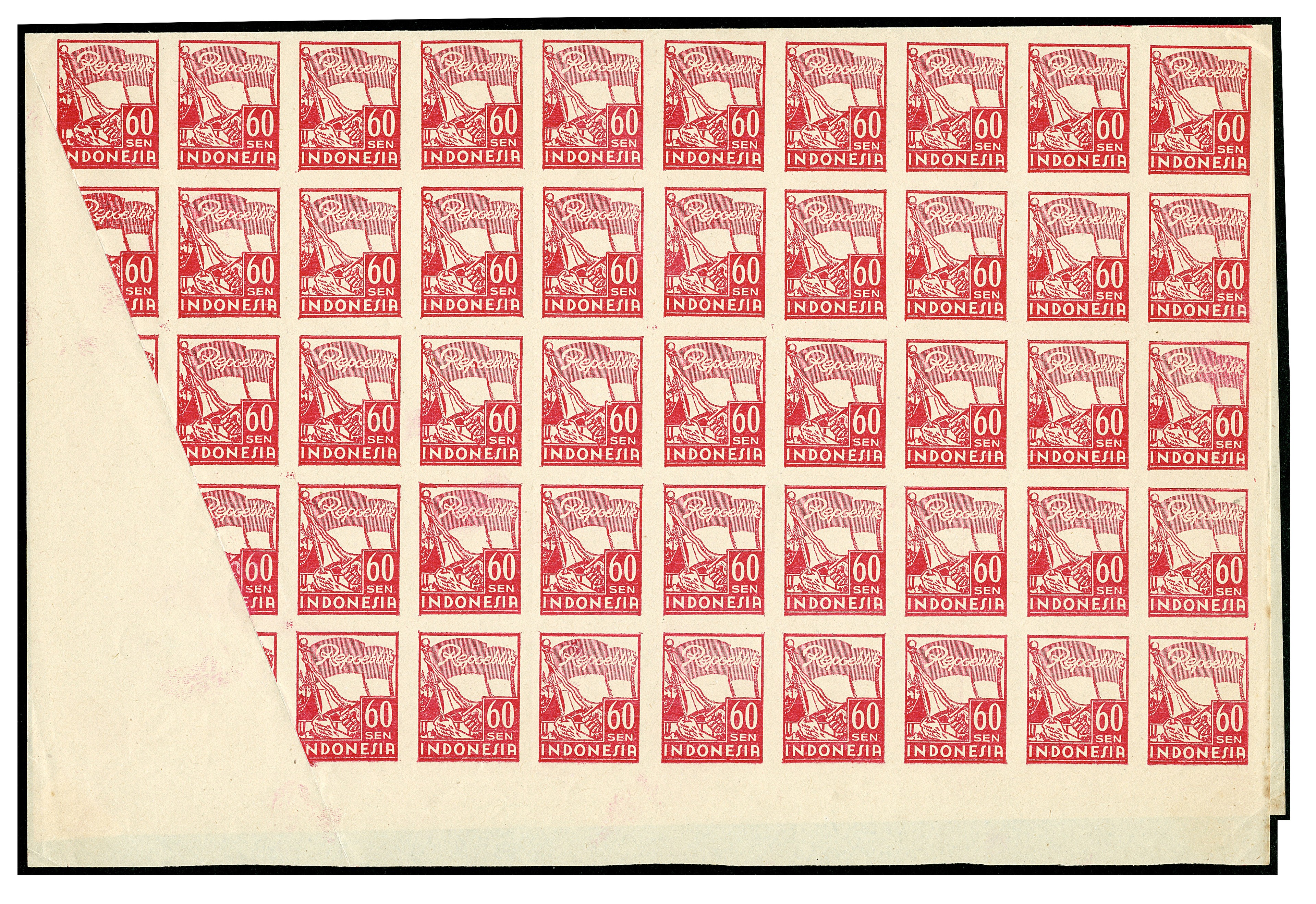 4th Series, 60 sen in imperforated sheet of 100 partly not printed due to a fold in the paper before printing