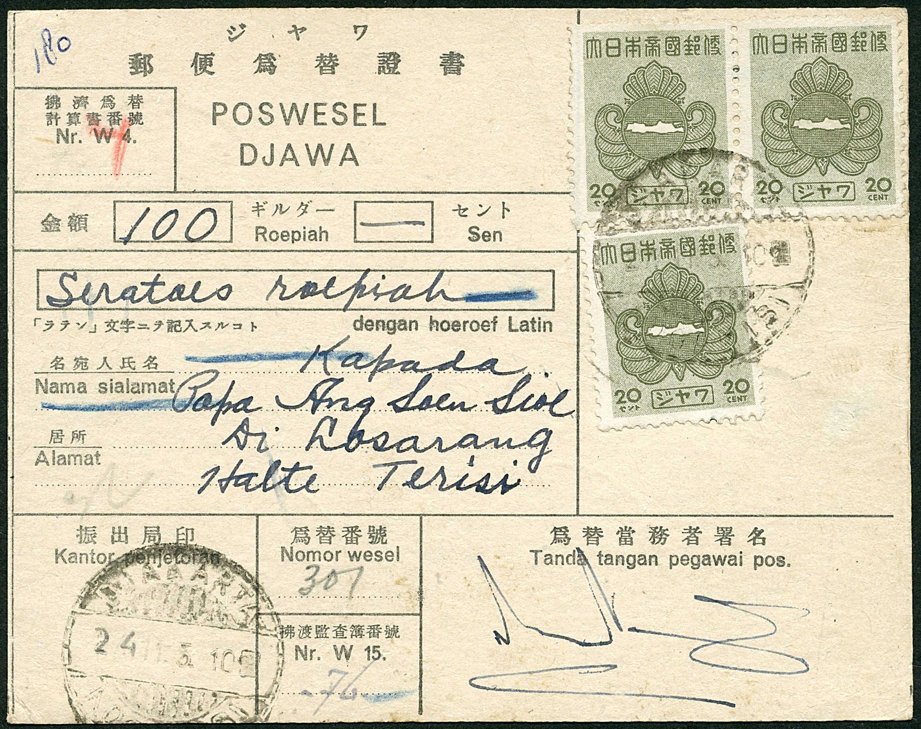 20 Cent definitive issue without overprint 3x on money order Bu.RF3 from Djakarta/Kooanisi 2.4.11.3.10 to Losarang 30.11.5