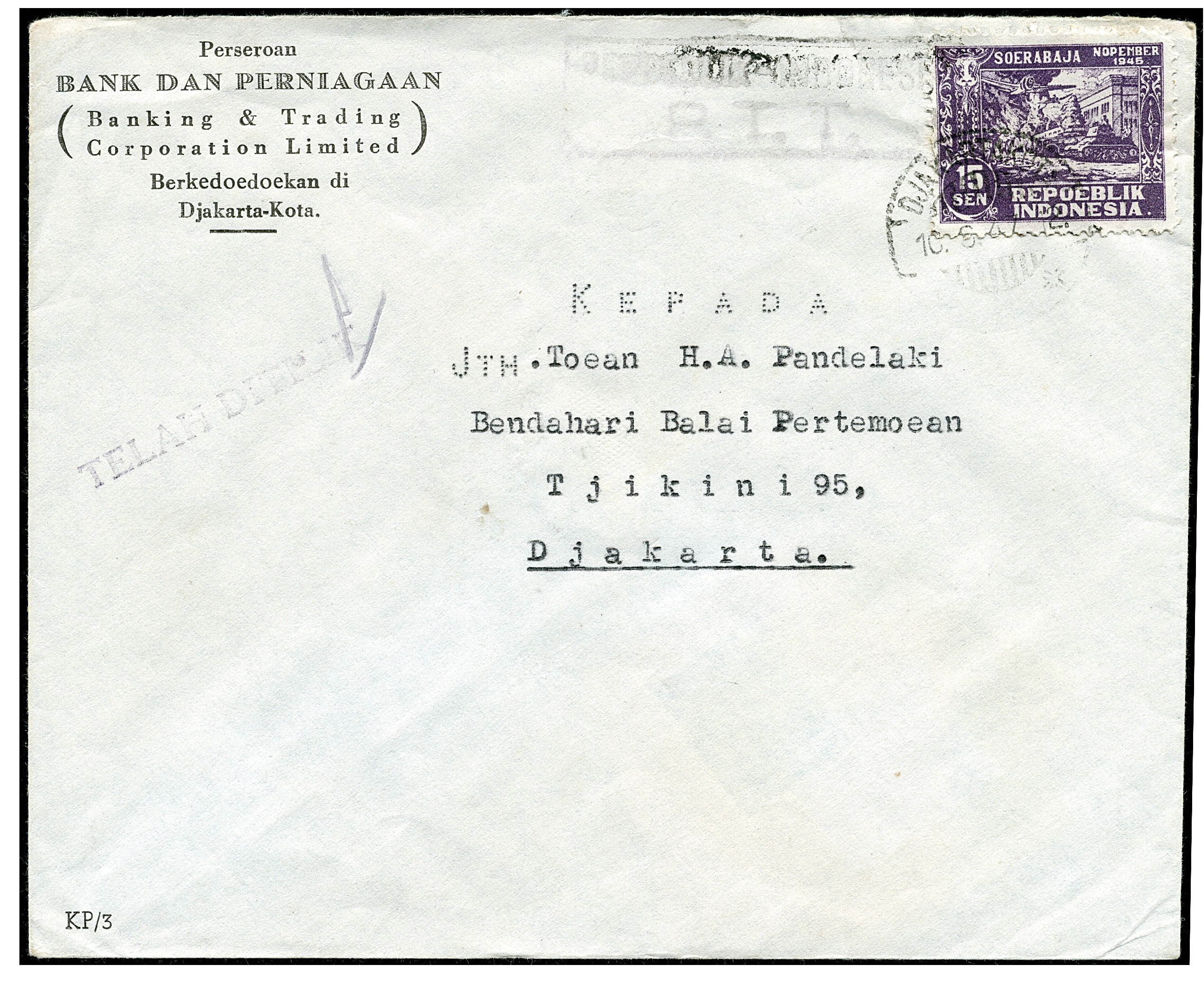 15 Sen Revolution series as a single franking on company cover cancelled framed REPOEBLIK - INDONESIA / P.T.T. from Djakartakota 10.6.47.12, showing unusual unframed censor mark TELAH DITILIK with initial type Bu.RC1a