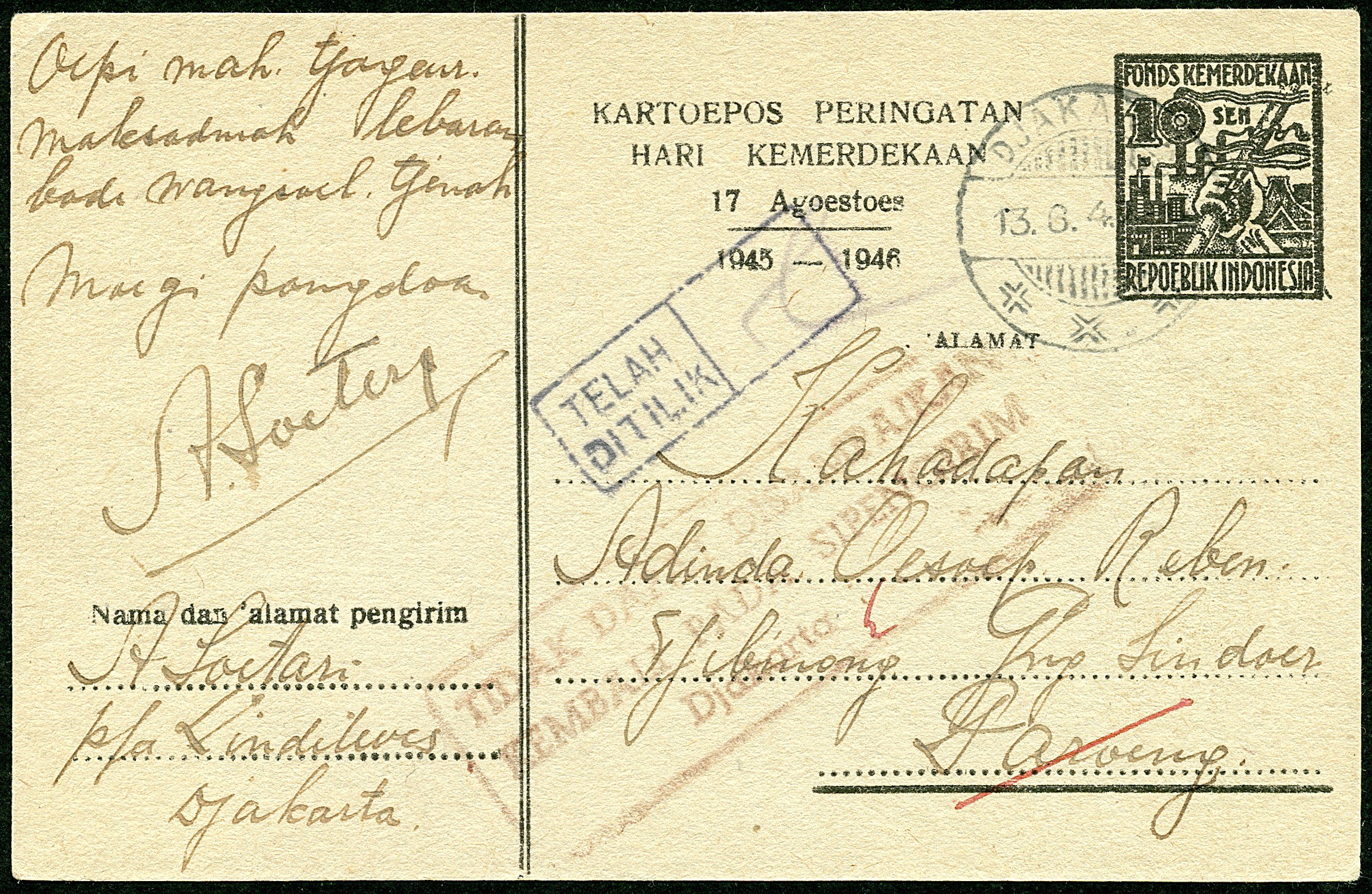 Postcard Bu.20a from Batoeretno 19.5.47.9, and postcard Bu.20c from Djakarta 13.6.4.7 (type vNV.013) to Paroeng, but returned to sender showing large red framed cachet ´Tidak Dapat Disampaikan/Kembali Pada Sipengirim/Djakarta...´ (= Cannot be delivered/return to sender/Djakarta...)